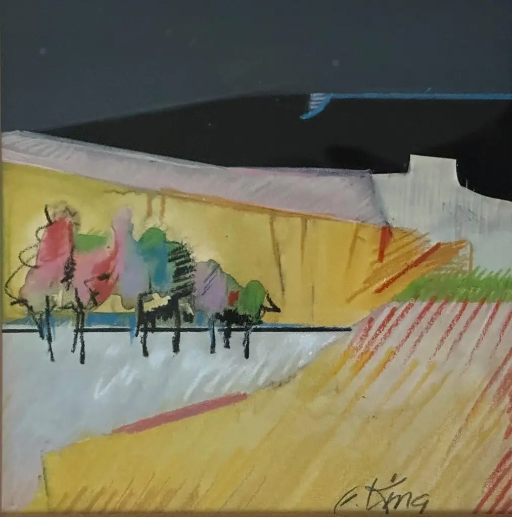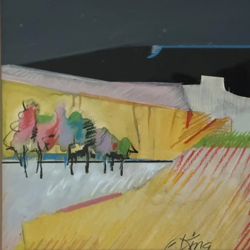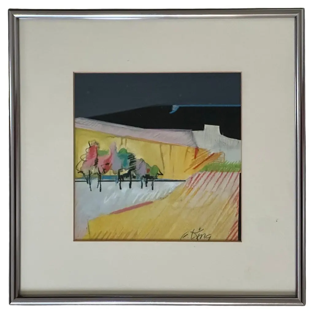 "Midnight at the Oasis" lithograph by E. King, circa 1984. The piece is in very good condition and is presented in a grey metal frame with an off white mat.. The framed piece is 10" x 10" while the image itself is 5.75" x 5.75". Cool piece! #4558