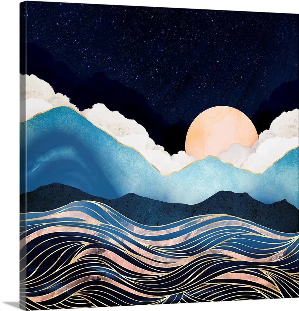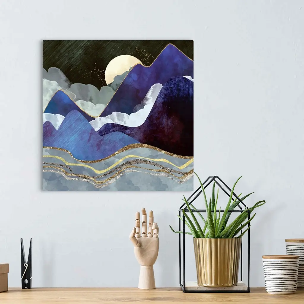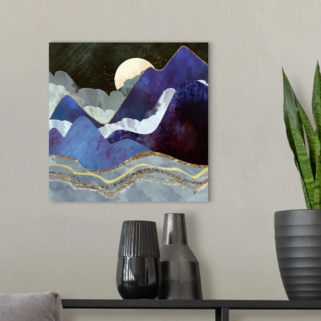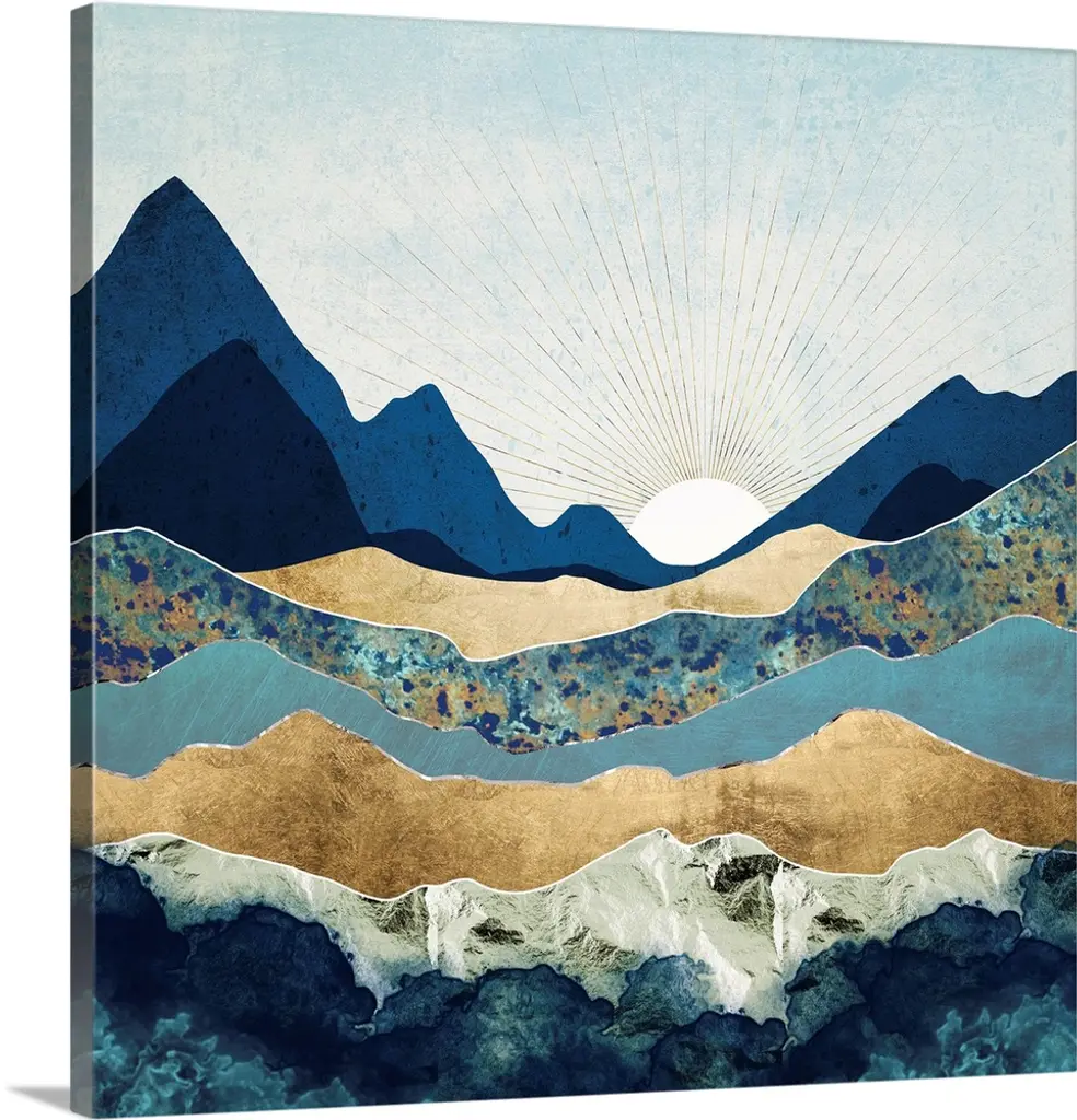 Abstract landscape featuring rolling hills, gold, silver, purple and clouds.