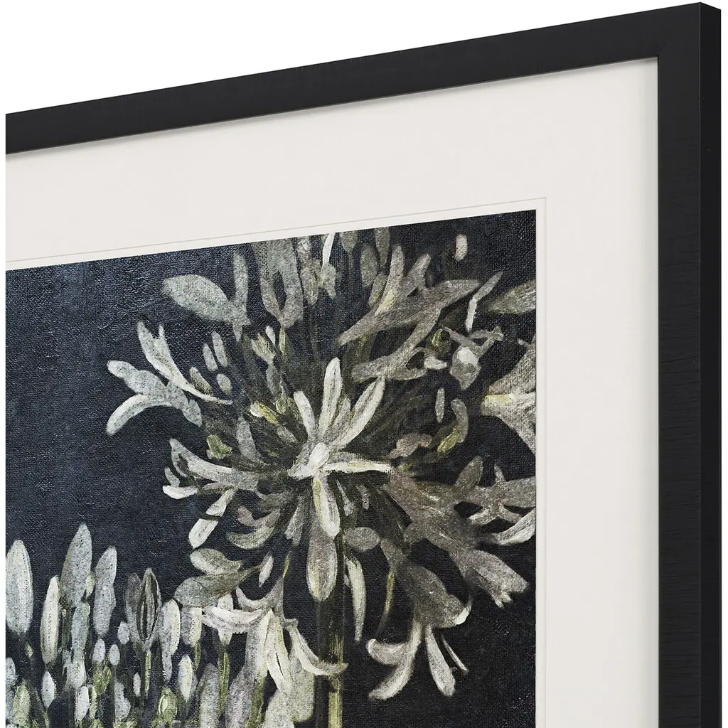 White lilies pop against a dark backdrop. Double-matted in white and framed in a black block contemporary moulding.