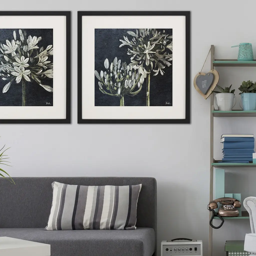 Midnight Lilies Black And Blue And Neutral And White Framed Art