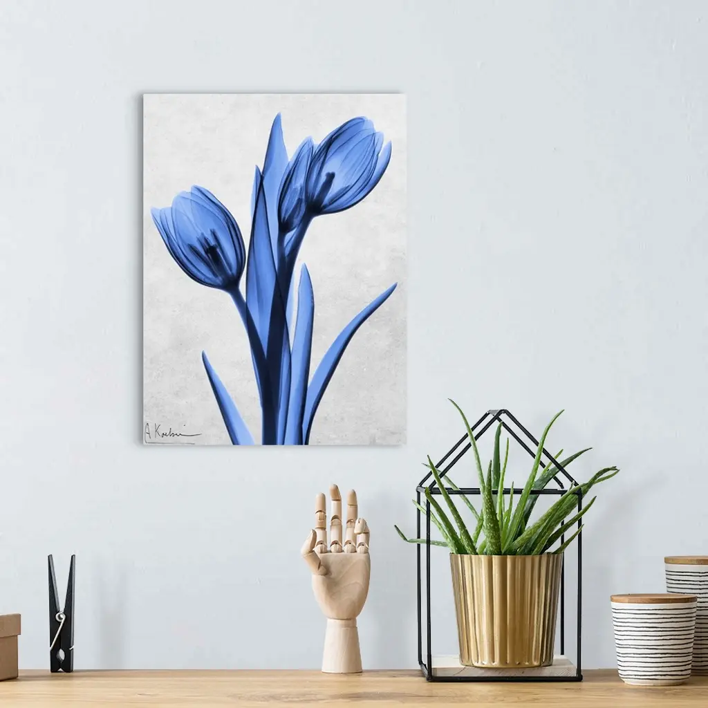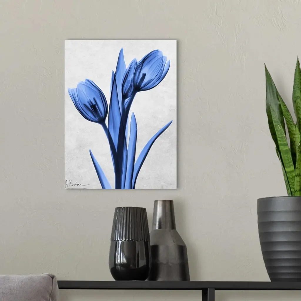 An x-ray photograph of blue tulips against a neutral background.