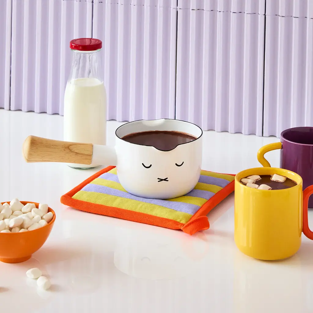 MoMA Exclusive: Make a perfectly sized cup of tea or warmed milk with the Miffy Milk Pan. The all-white pan features a simplistic design of Dick Bruna’s beloved Dutch storybook character. If you’re wondering what the difference between a milk pan and a sauce pan is, we can help: While both can heat up milk with ease, a designated milk pan has an even heat distribution and that makes heating up (without burning) milk a breeze. One side of the Milk Pan features Miffy with her eyes open, while the other shows her with her eyes closed—a playful nod to warm milk's sleep-inducing reputation. Safe for use on induction, gas, and electric stovetops. Freezer-safe. The Miffy Milk Pan measures 3h x 10w x 5.5"d. Holds 27oz or 23oz when filled to the pouring curves. Hand-wash only.