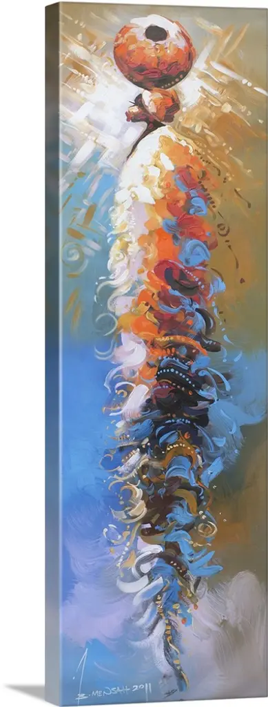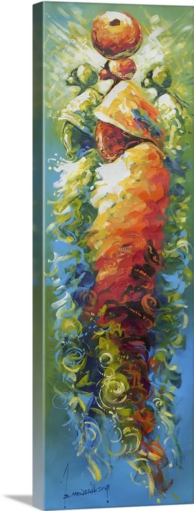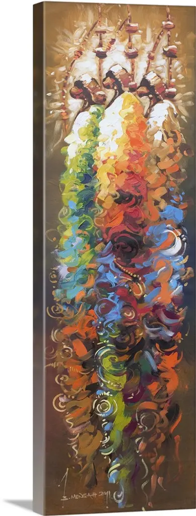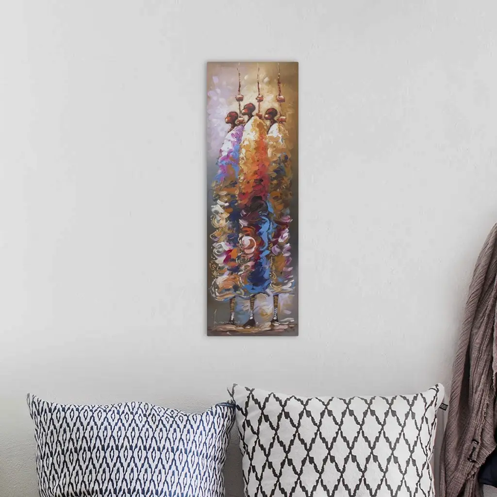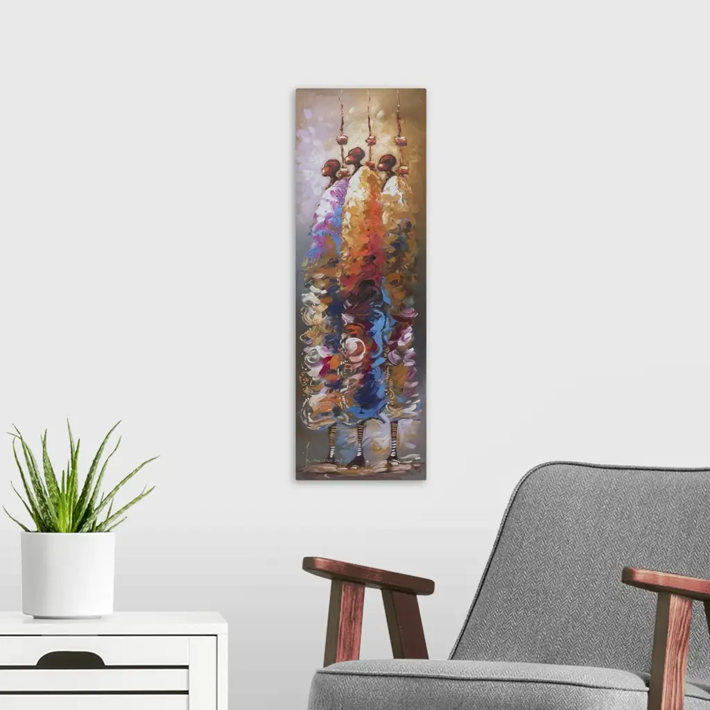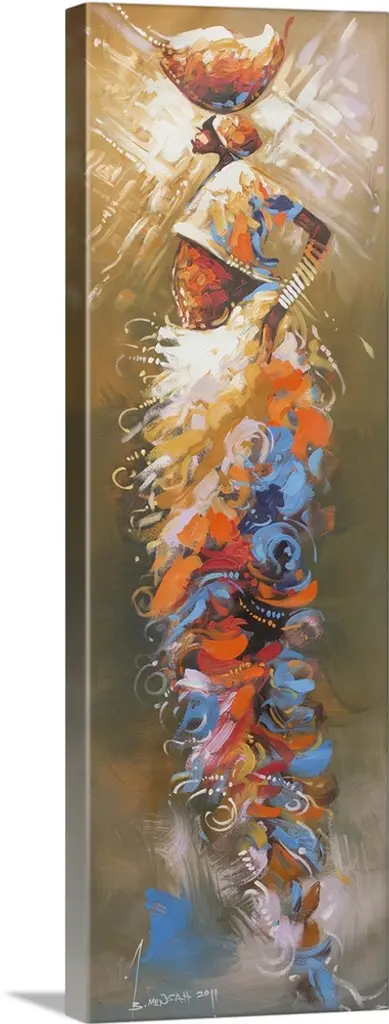 Standing straight and tall, three African men hold spears as they gaze toward the future. Bernard Mensah pays tribute to the ancestors whose unwavering courage and resolve made them examples for modern youth. Nothing can stop these men from achieving what they want to, even when others have given up, the Ghanaian artist affirms.