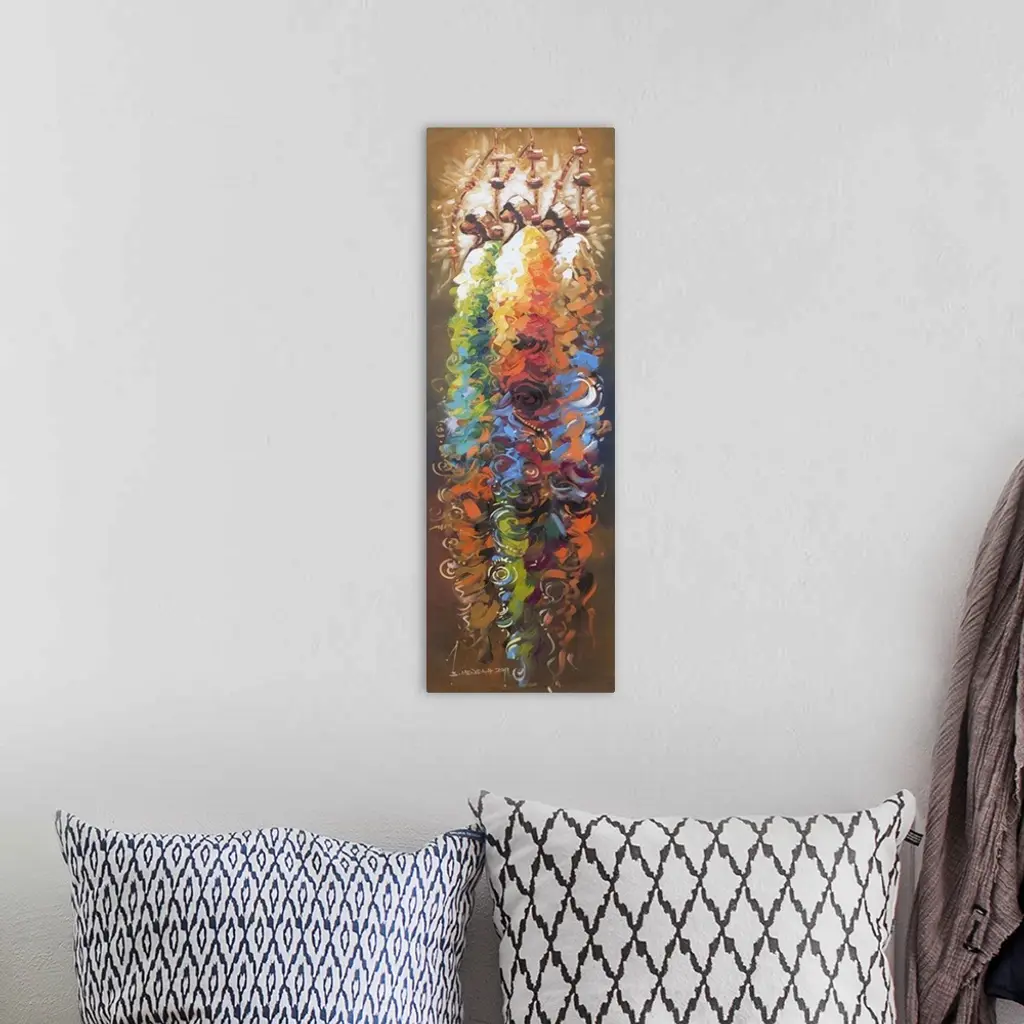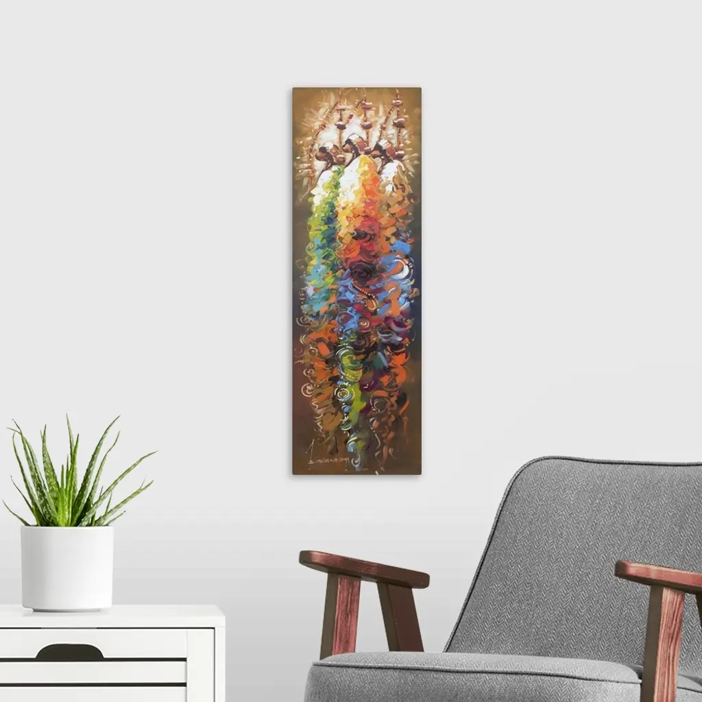 Tall, proud, unwavering in their courage, three African men inspire Bernard Mensah. Enveloped in brilliant color, they hold spears, in tribute to past traditions. Nothing can stop them, the Ghanaian artist says.