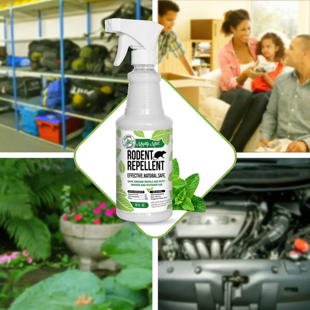 Get rid of mice, get rid of rats, and more. Mighty Mint Rodent Repellent is a high-strength natural spray created to keep rodents from your home without compromising on safety. It is safe to use around dogs, cats, and people when used as directed. It works great both indoors and outdoors. This formula is made with concentrated Northwest peppermint essential oil - a proven effective natural deterrent for mice and other rodents. The secret to Mighty Mint is the incredible repellent power of peppermint oil. This formula improves upon traditional homemade organic peppermint essential oil repellents with a special blend of all-natural ingredients. It is made with premium Northwest US peppermint oil, the purest, best-smelling mint in the world. This scent is pleasant to humans, but irritating to unwanted pests. Just a few sprays every few days is enough to keep mice and or other rodents away. Useful for homes, gardens, kitchens, garages, storage areas, car engine cables - anywhere that needs to be protected. For best results, use as a preventative measure before rodents have nested. Don't waste time with partially effective solutions - Mighty Mint is 1 of the strongest essential oil rodent sprays available. Mighty Mint is a great option for people who want to avoid traps, poisons, toxic pesticides, or harsh chemicals. Some people like to simply use it as an air freshener with its natural, strong, fresh peppermint scent.