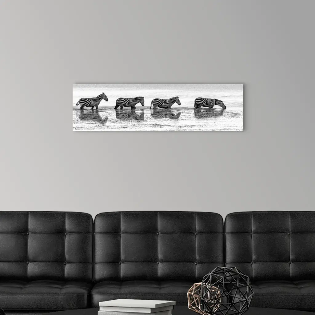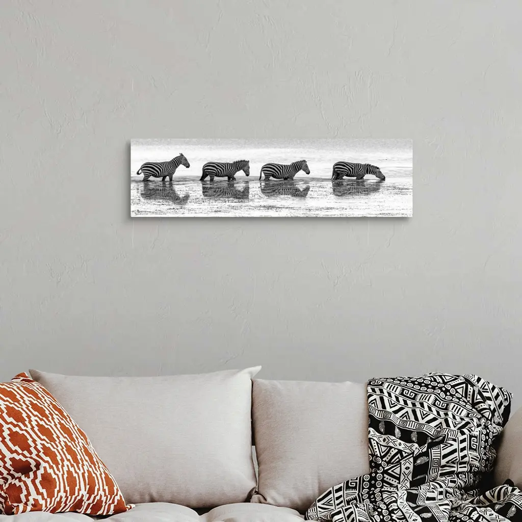 Several Zebras walking across a swampy area in Kenya, Africa.