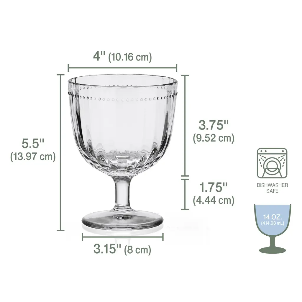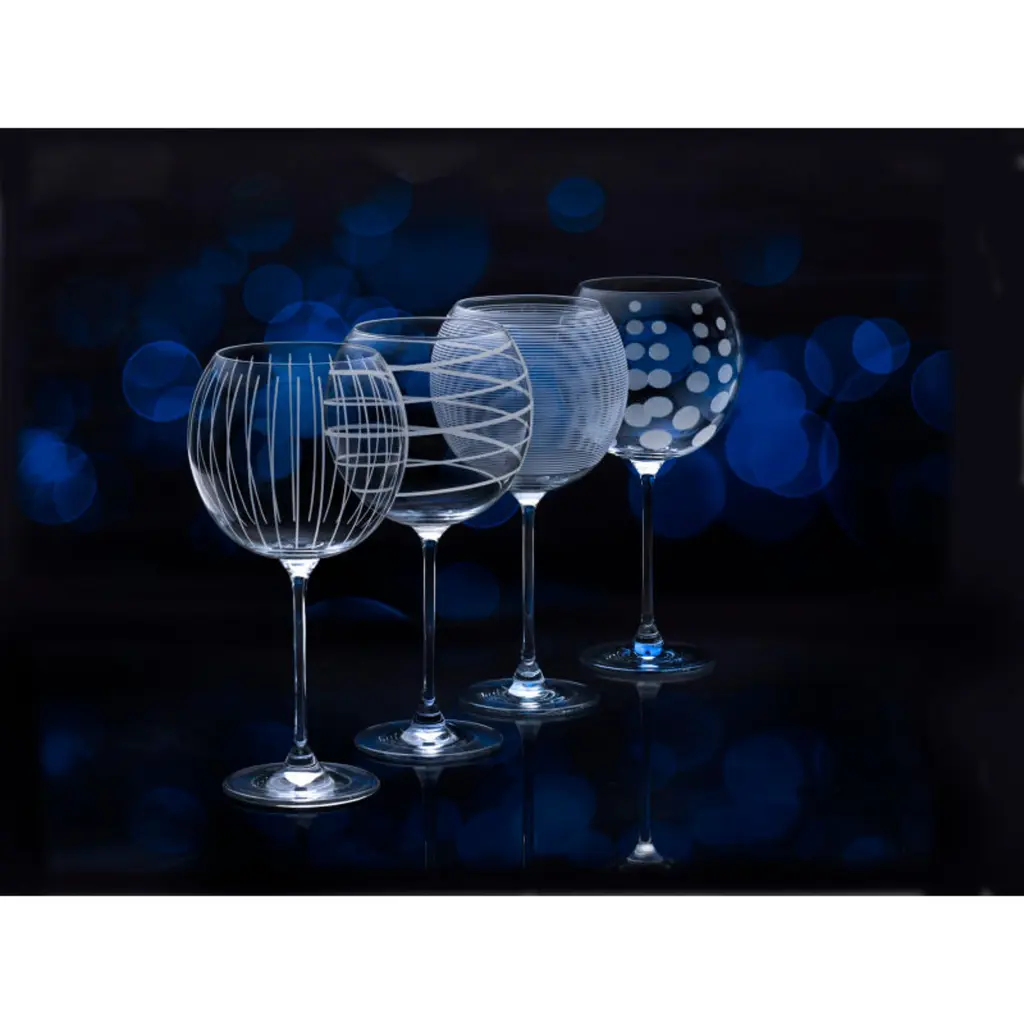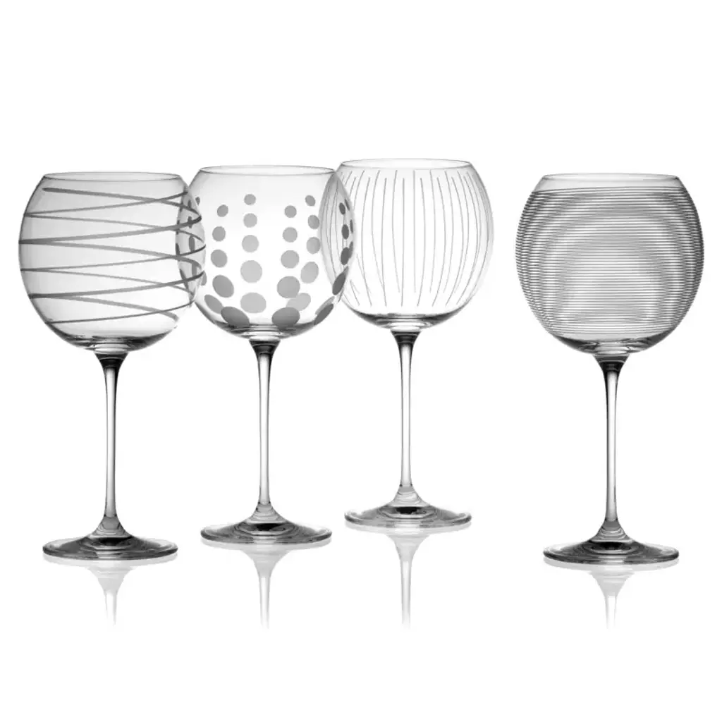 This Set of 4 Cheers Balloon Goblets by Mikasa features playful designs to enliven any gathering and enhance the celebratory atmosphere. Balloon goblets feature generously sized bowls and elegant stems for swirling and aerating wine, and also make great water glasses at the dinner table. Made of beautiful, lead-free crystal, each glass features a distinct pattern, including lines, swirls, and dots, so everyone will have their own unique glass that is easy to identify, ensuring no more drink mix-ups at parties! Set of 4, each measuring 9 inches high by 4-1/2 inches in diameter with a 24-1/2 fluid-ounce capacity. Dishwasher safe.