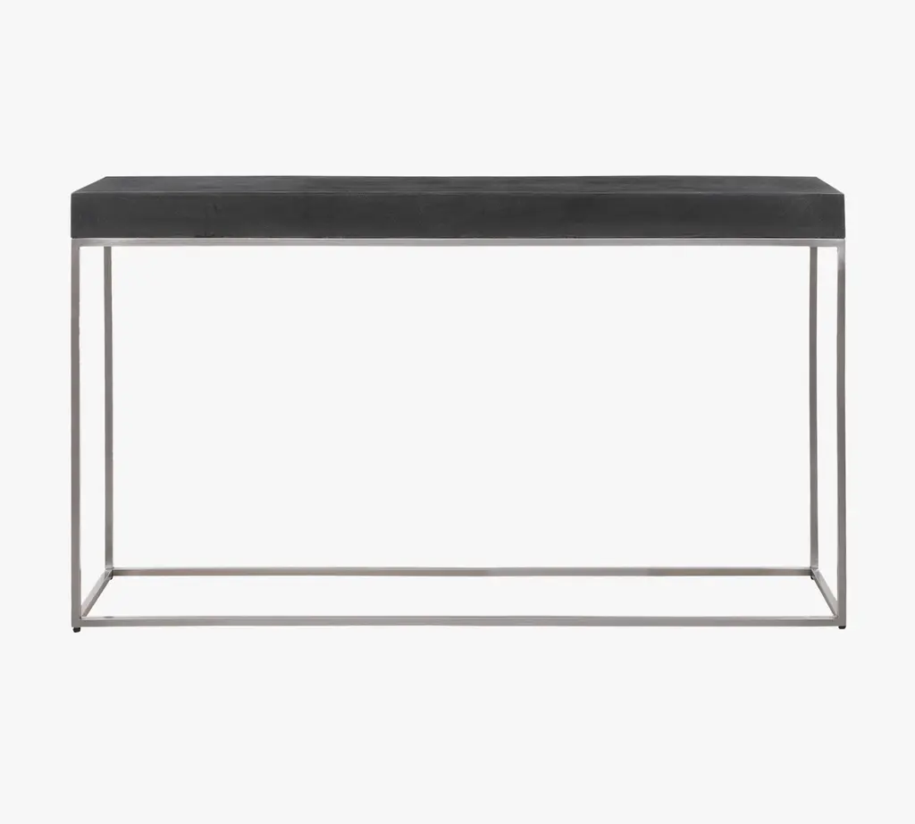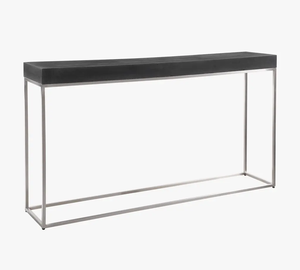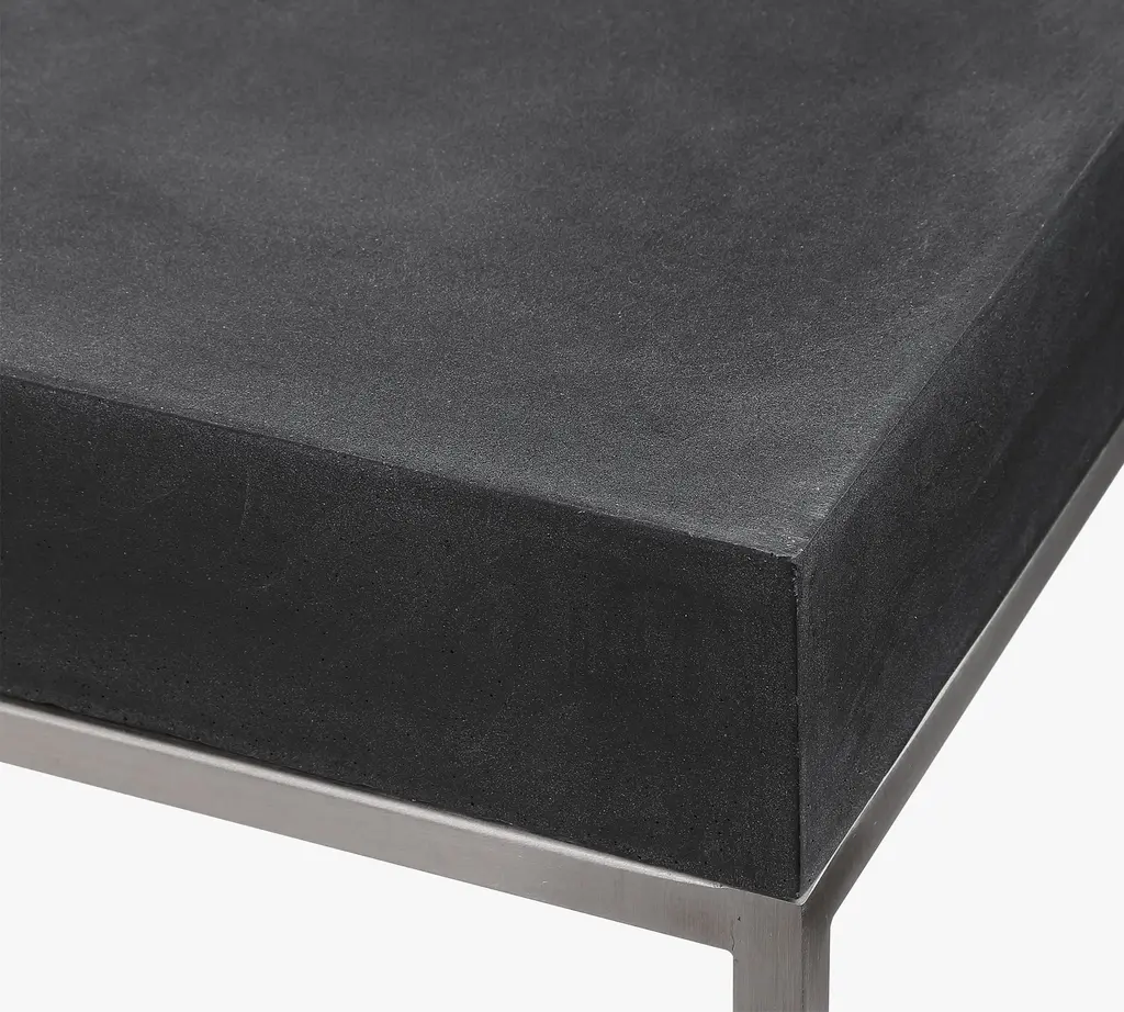 A modern space deserves lines as sleek as these. The slender steel frame is an open, airy counterbalance to the substantial slab top. Mixing metallic nickel and matte concrete combines two of a decorator’s favorite things: pronounced shine and understated sophistication.