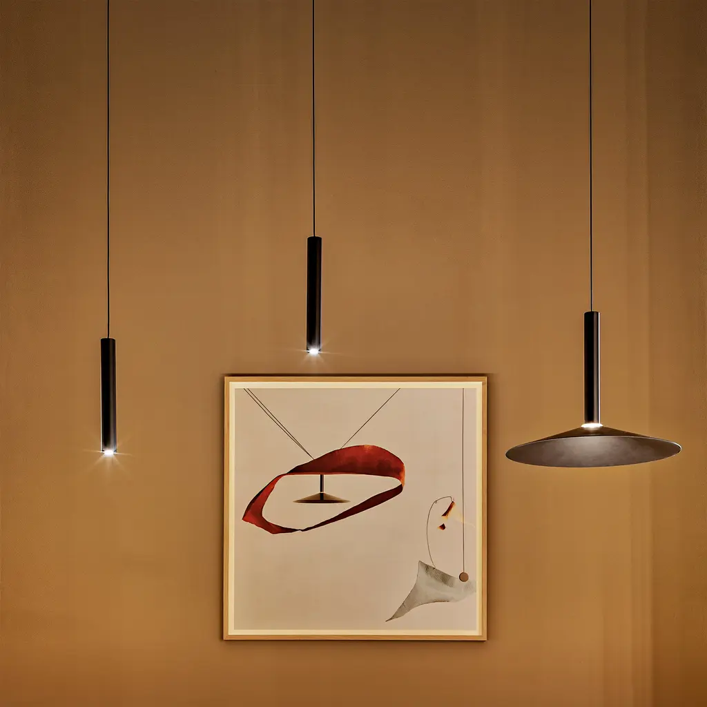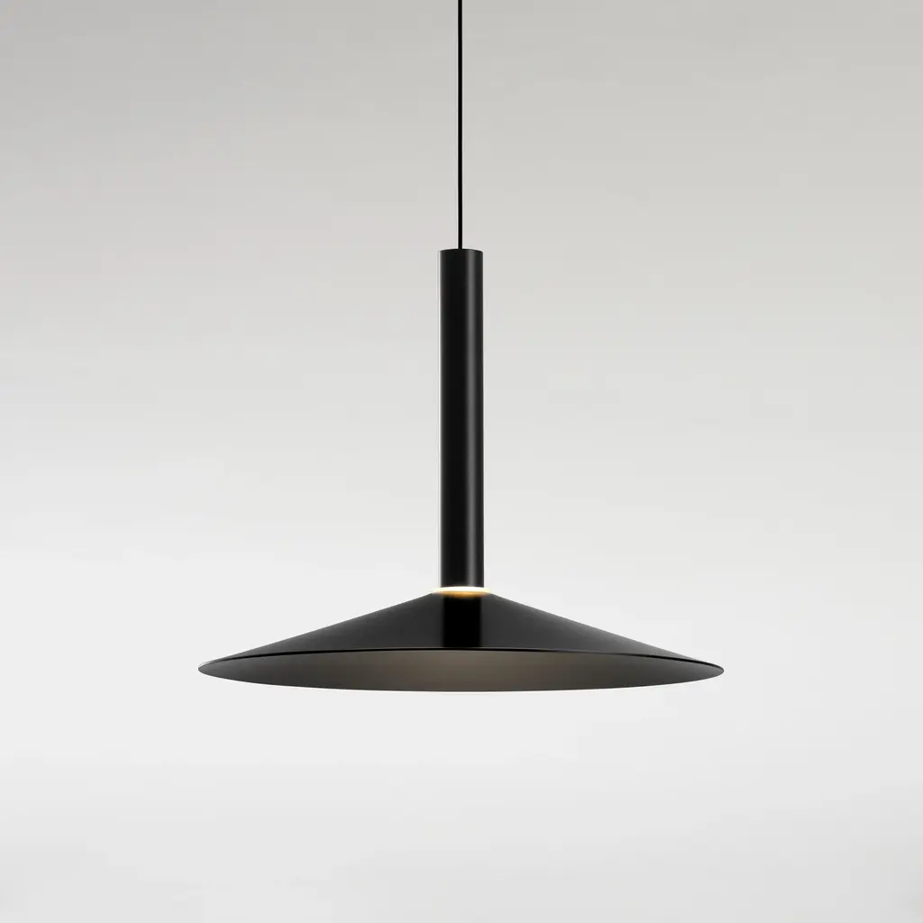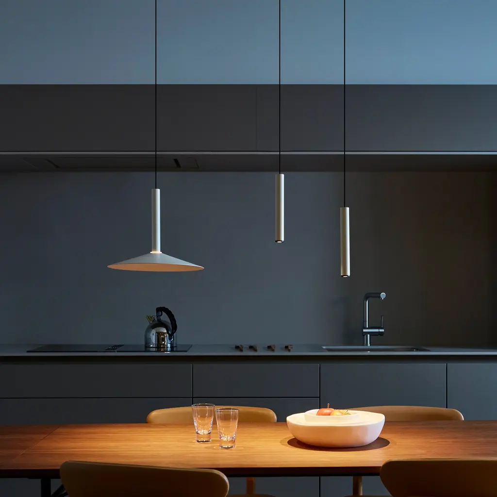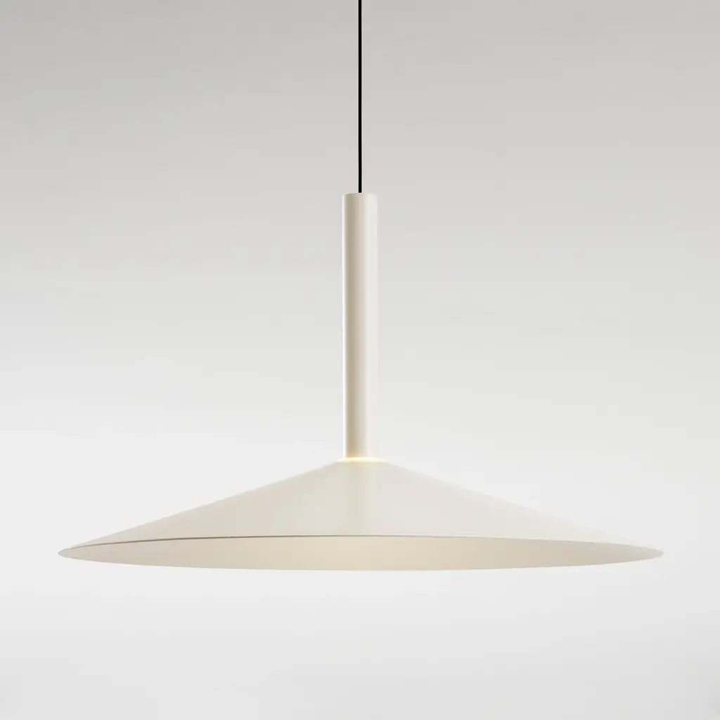 With its slim line and crisp cone shade, Milana hews to the modernist credo "Less is more." Barcelona designer Jaume Ramírez follows in that vein with a simple suspended cylinder and adds the crisply geometric shade, both in sleek lacquered aluminum. Marset's minimalist fixture incorporates a built-in LED to create a overall glow of illumination when reflected from inside the shade as well as a narrow ribbon of light at the top.