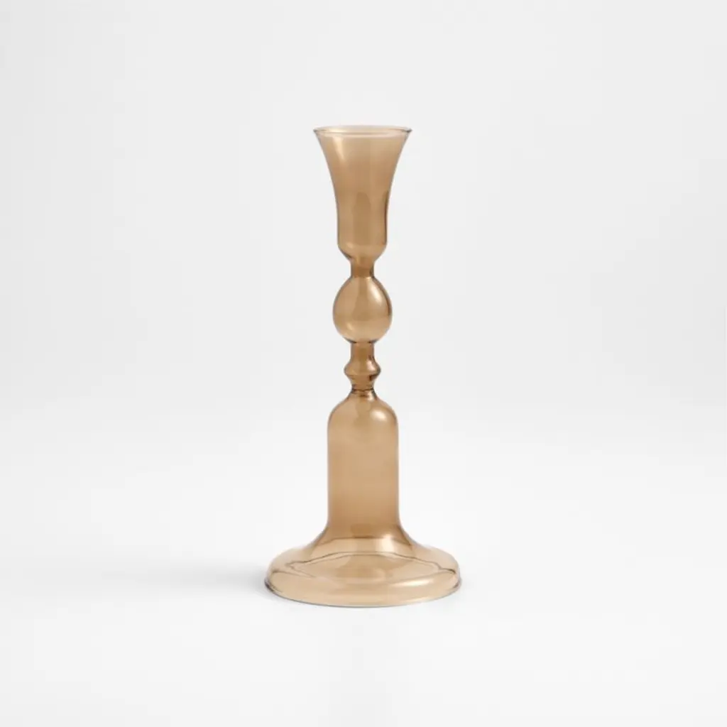 Milano reimagines vintage candlesticks, updating the ornate silhouettes with streamlined curves in amber glass to stunning effect. Hand-blown by skilled craftspeople, this small, intricately curved candle holder culminates in an elongated cup that supports a taper or doubles as a bud vase. The modern grey-brown tint glows warmly in candlelight. Display the subtly playful piece solo for a sculptural look, or layer other exclusive Milano glass taper holders in various heights and hues for a more eclectic, extravagant effect.