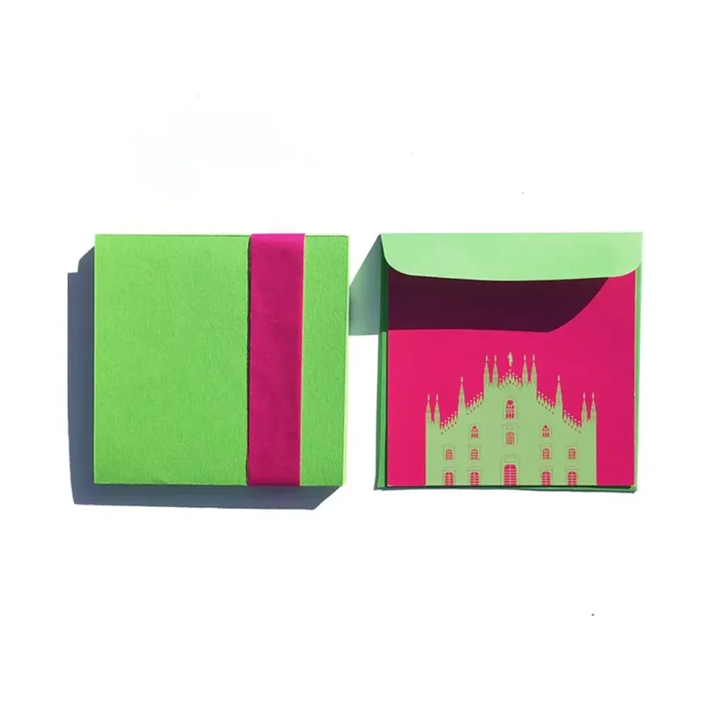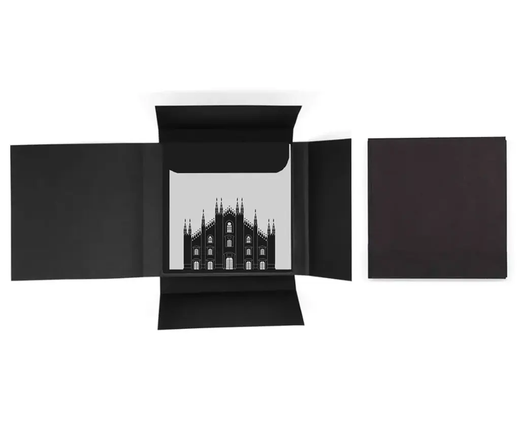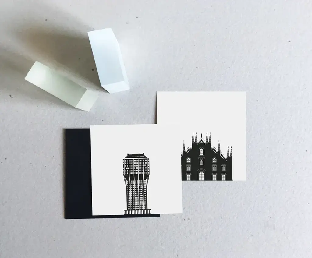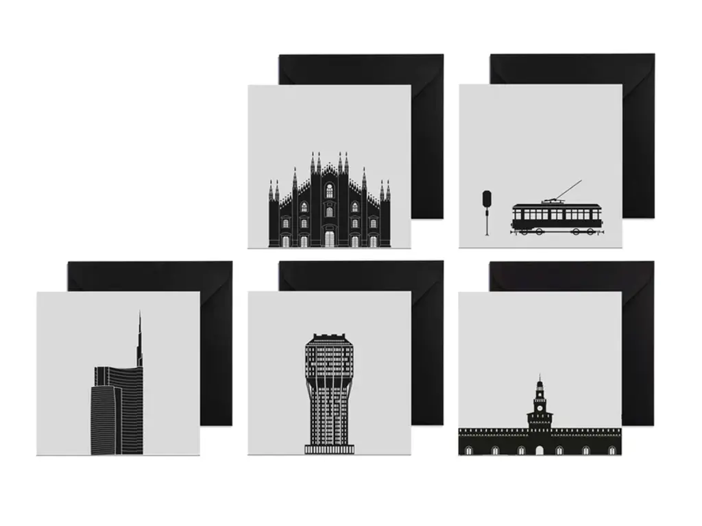 Kit made of paper containing 5 greeting cards with envelopes, graphics dedicated to the main monuments of the city of MILAN. Available in color and gray versions.