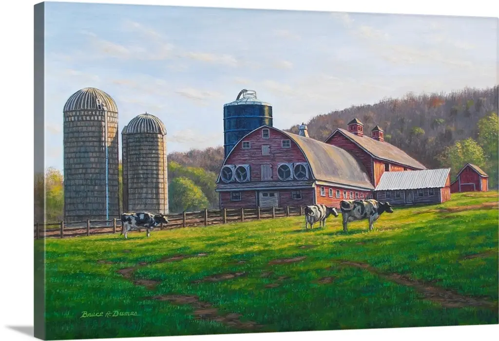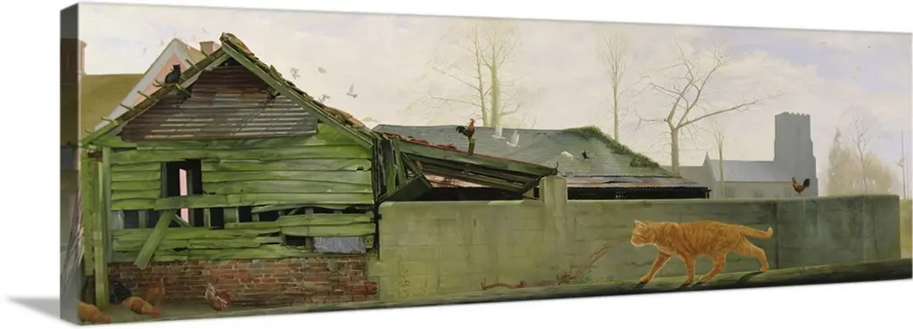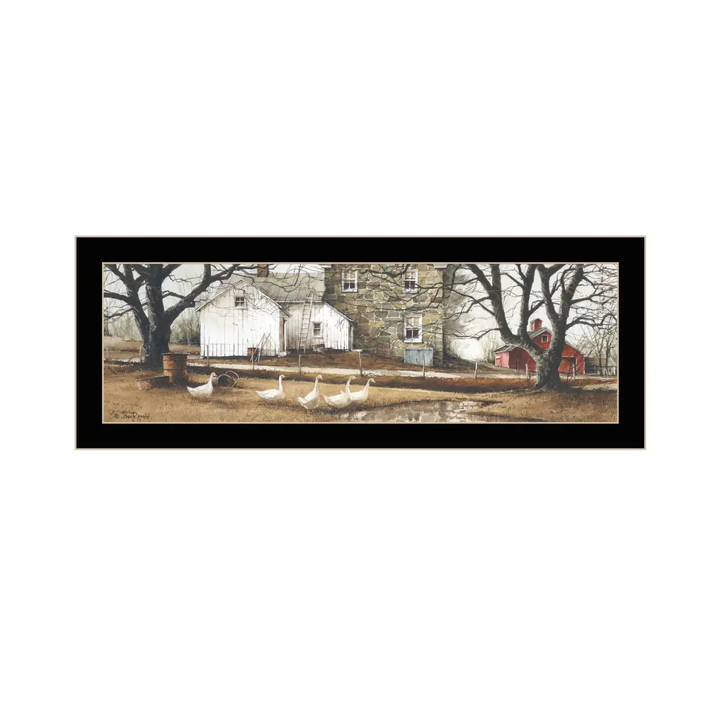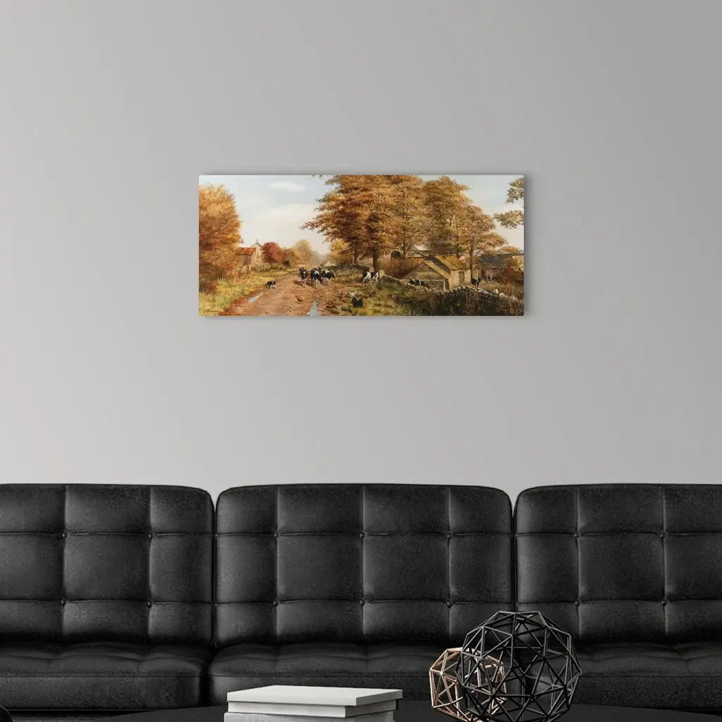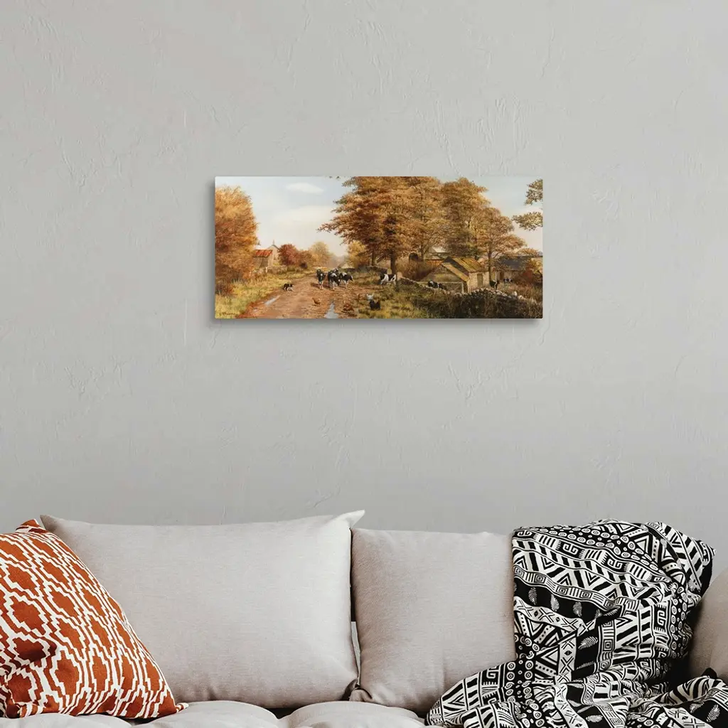 Cows and chickens on muddy dirt road by outbuildings and stone walls in fall.