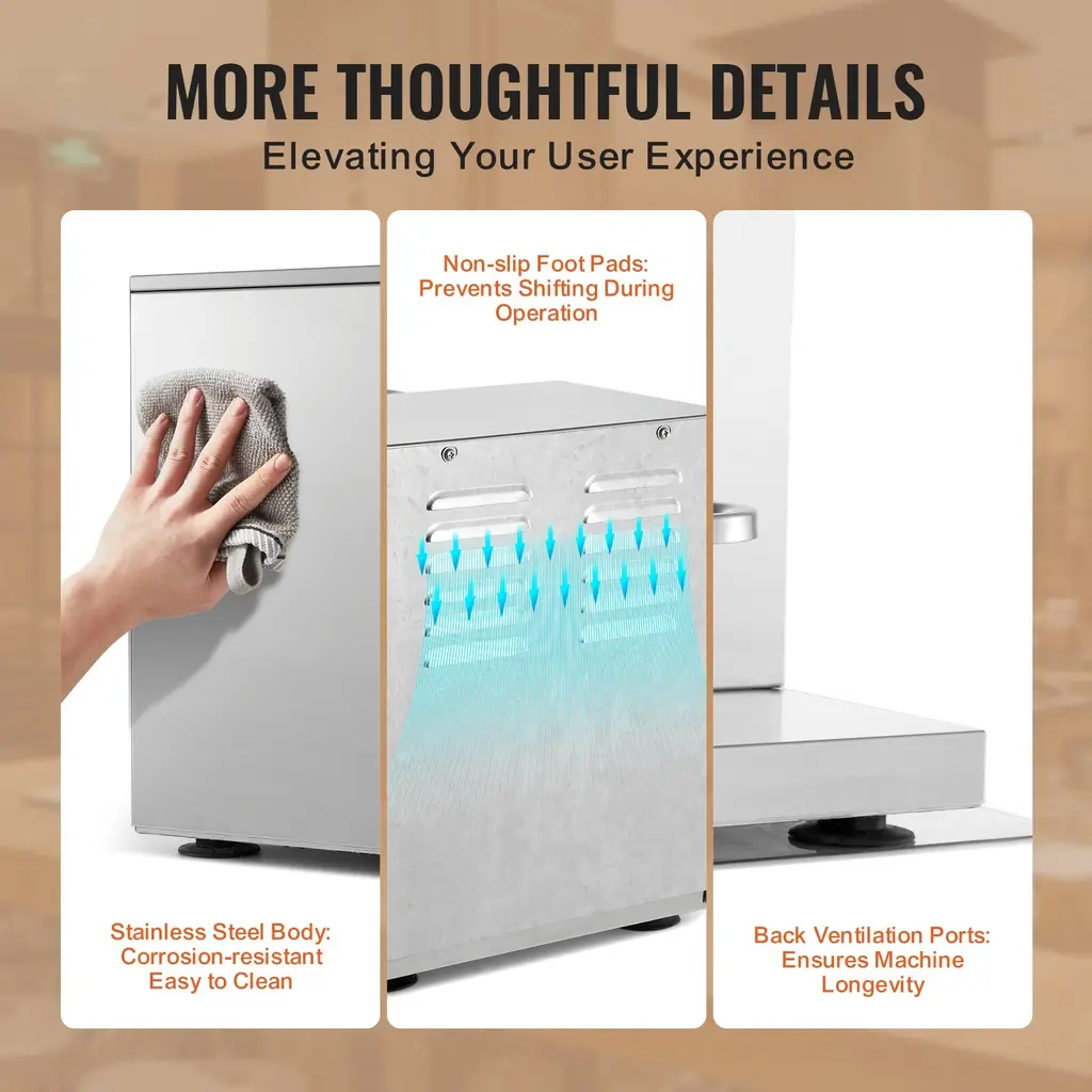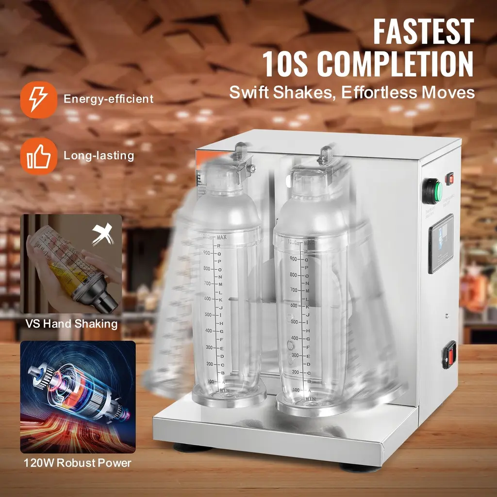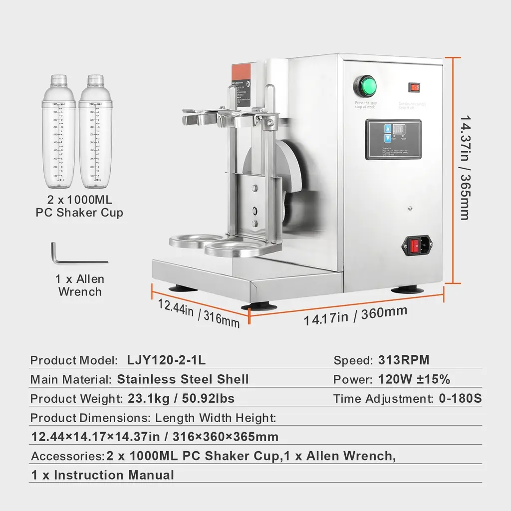Efficient Shaking: Equipped with a 120W high-efficiency motor, Our milk tea shaker machine operates quietly yet powerfully. At a speed of 313 RPM, it shakes evenly and rapidly, completing a milk tea in as little as 10 seconds. This significantly enhances the speed and quality of beverage production, perfectly meeting the needs of a fast-paced commercial environment. Compatible with Multiple Shaker Cup Sizes: You can quickly adjust the height of the shaker machine's holder to fit different sizes of shaker cups, ranging from 350ml to 750ml/1000ml, ensuring each beverage is uniformly and swiftly shaken. Includes two 750ml stainless steel shaker cup that is easy to clean and does not retain flavors, suitable for use in all types of dining establishments. 360-Degree Swinging Arm: Our design features a 360° circular, all-around swinging arm to ensure each shake is evenly smooth, whether it's milk tea, coffee, cocktails, or fruit wine. The precision-designed holder prevents leakage even during 360° circular shaking. Precise Timing Control: With precise timing adjustments from 0 to 180 seconds, you can set the shaking time as needed to achieve the ideal mix for each beverage. A one-button start design makes operation straightforward and intuitive. Professional Commercial Choice: Constructed from stainless steel, The milk tea shaker machine is corrosion-resistant and easy to clean. The stable four-leg pad design ensures steady operation while also maintaining good heat dissipation. Suitable for mixing milk tea, cocktails, beverages, coffee, and more. Ideal for use in restaurants, cake shops, coffee shops, bakeries, food stores, and beverage shops. Package Content 1 x Milkshake Maker Machine 2 x 350ml-750ml/1000ml Stainless Steel Shaker Cup 1 x Allen Wrench 1 x Instruction Manual