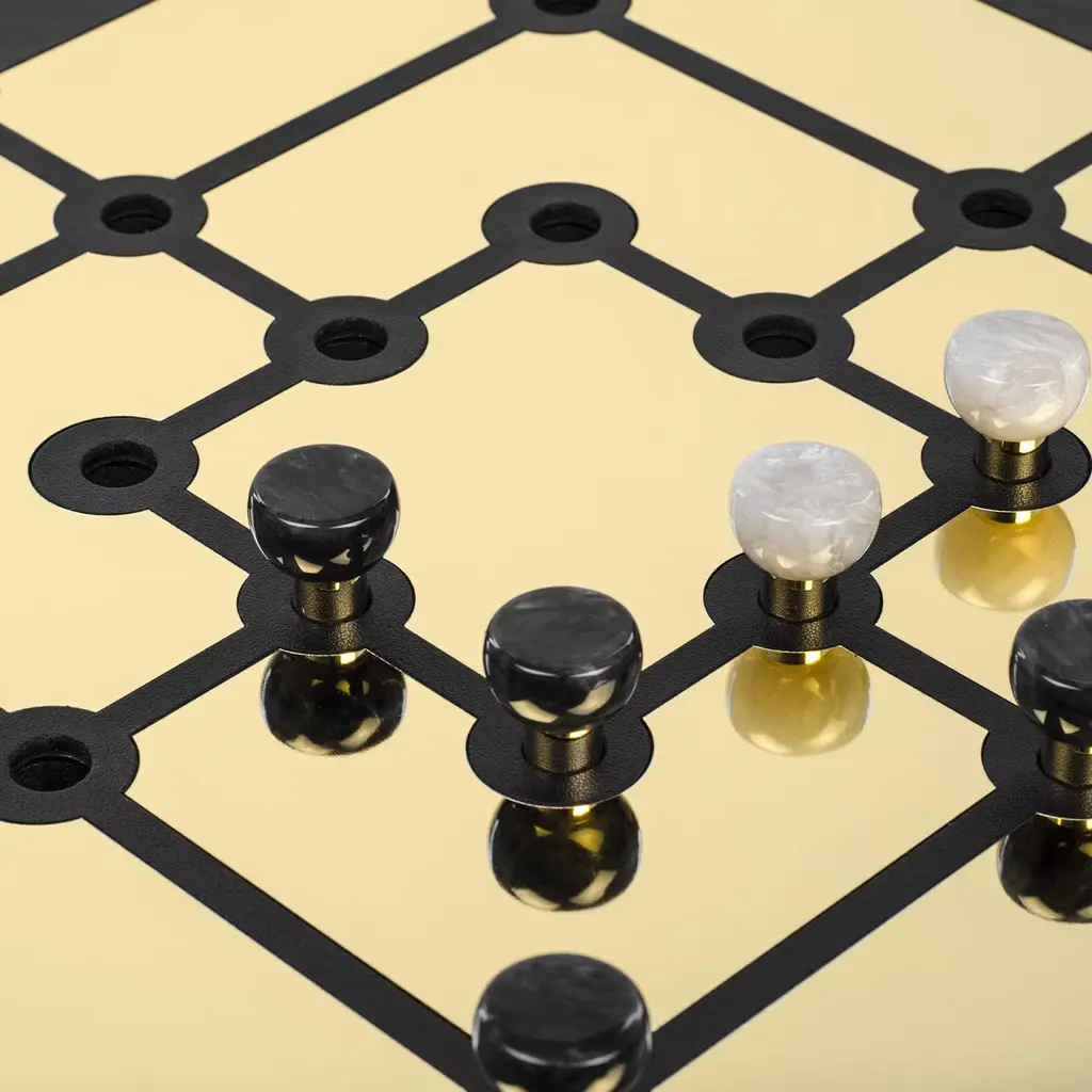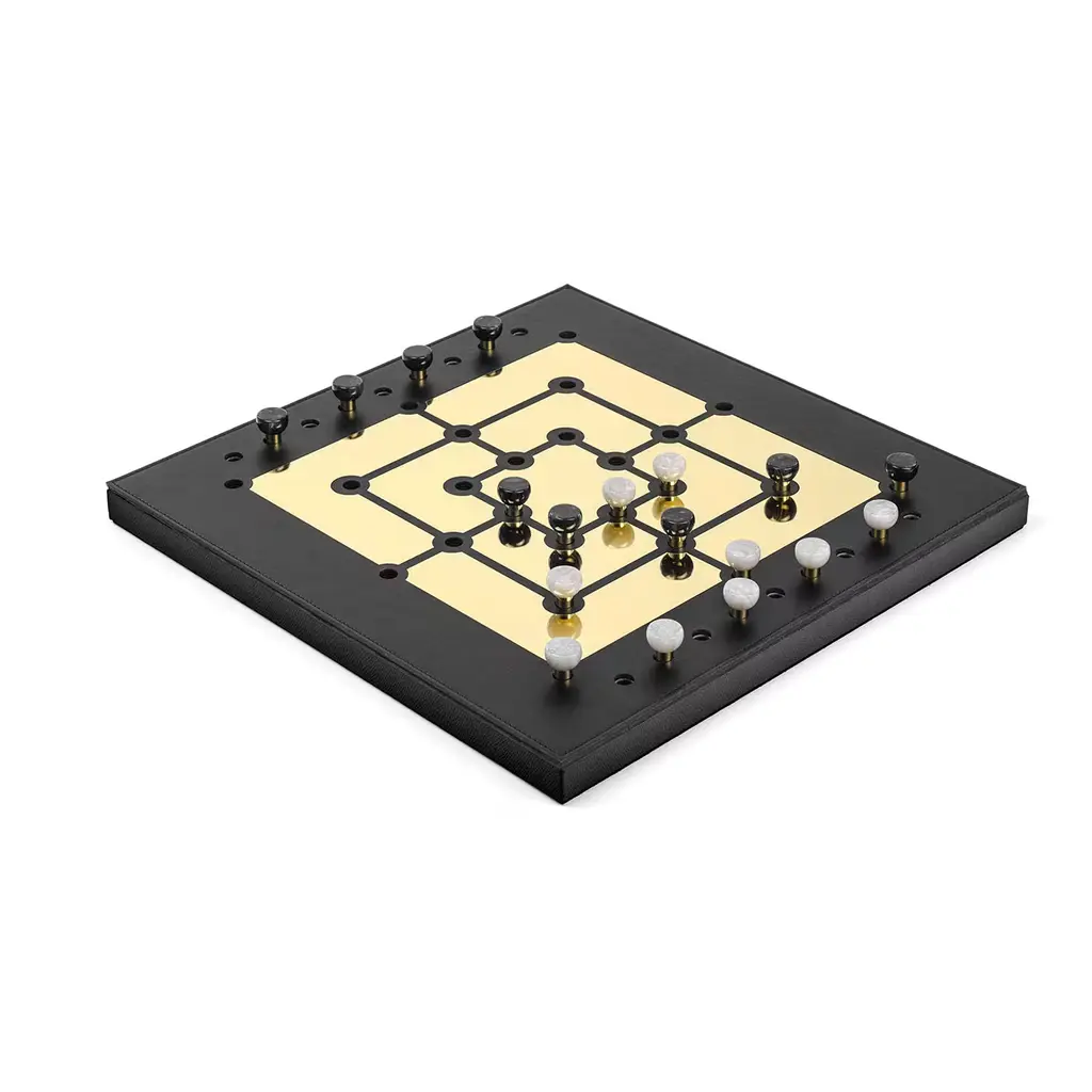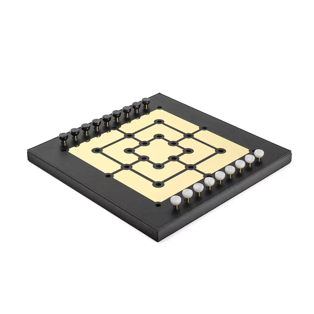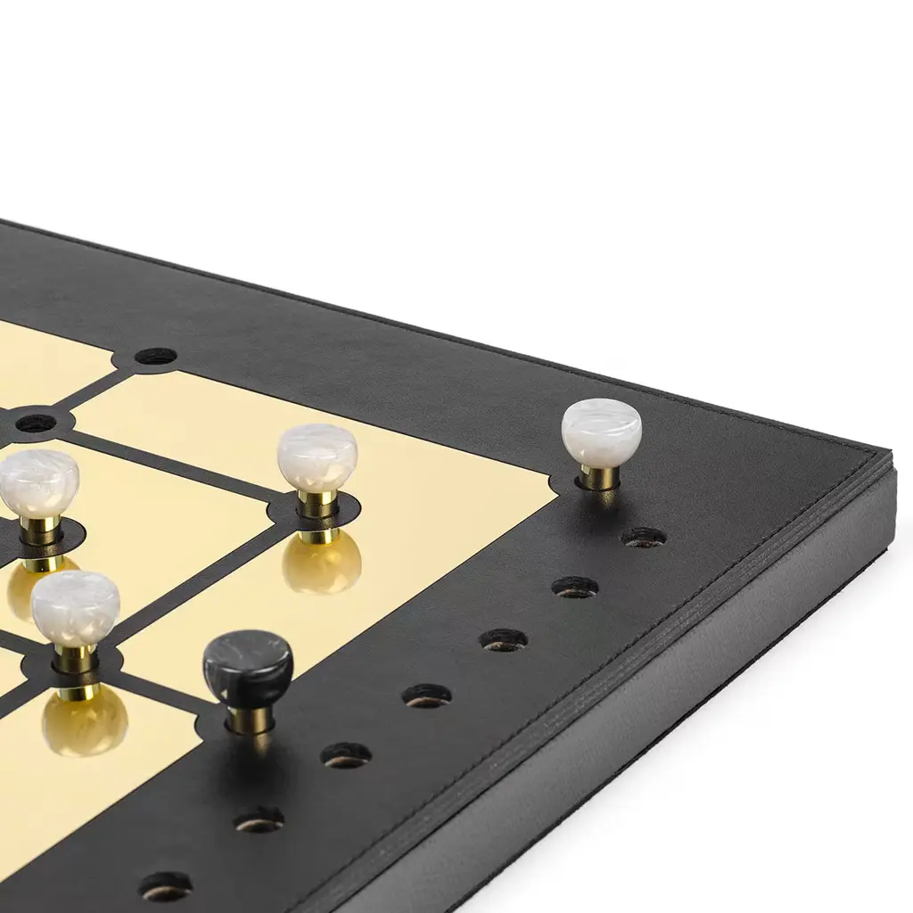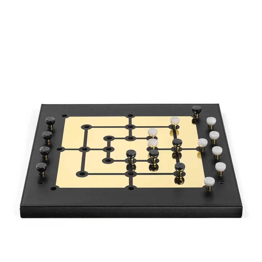 Also known as "nine-man morris", this design is a luxury variant to play the Mill game. Flanked by two distinct rows of pieces, the game board displays a luxe, golden labyrinthine plate set against a prized backdrop in black leather that envelops the whole square wooden structure. Each piece features a brass base surmounted by semi-spherical elements in black and white faux nacre. A variant with glossy golden segments is also available upon request to the Concierge