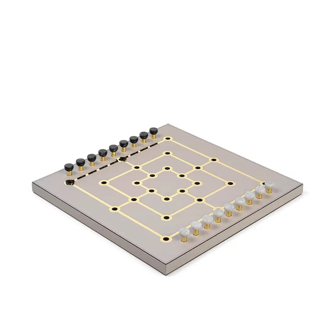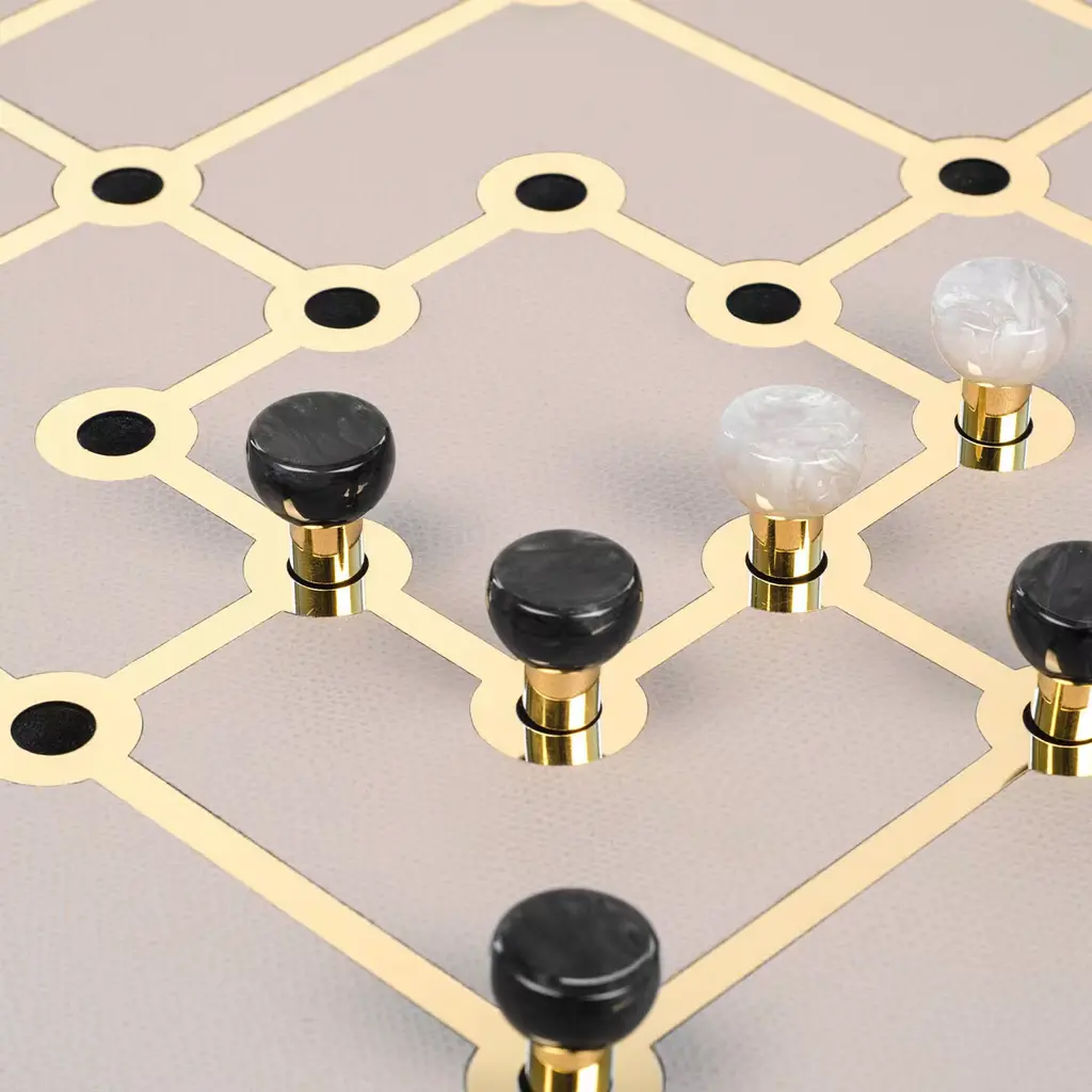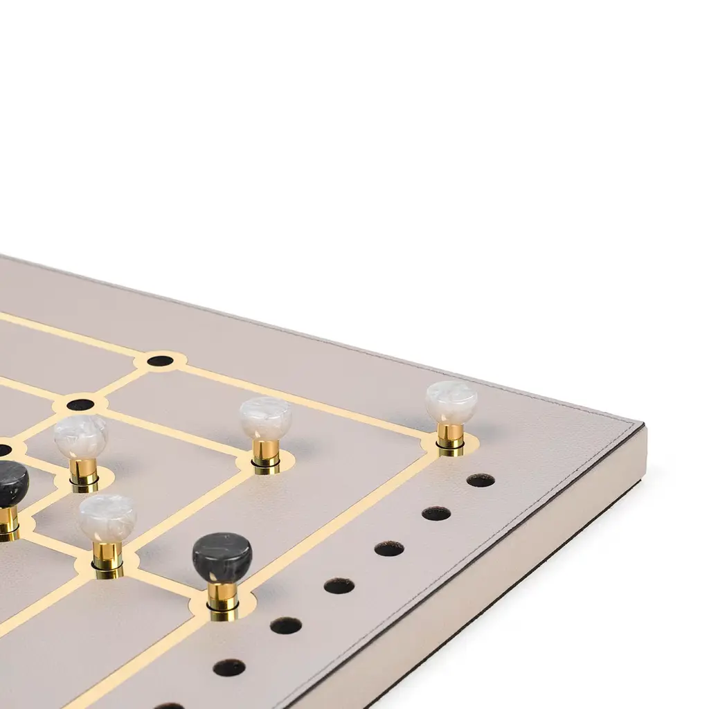 A classy take on the strategy board game known as "nine-man morris", this design displays glossy, golden segments making up for a labyrinthine pattern that emerges from a backdrop in taupe leather enveloping the whole wooden frame. The exclusive pieces with brass details also feature semi-spherical top elements crafted of black or white faux nacre in equal percentage. A variant featuring the use of gold leaf is also available, please ask the Concierge for pricing.
