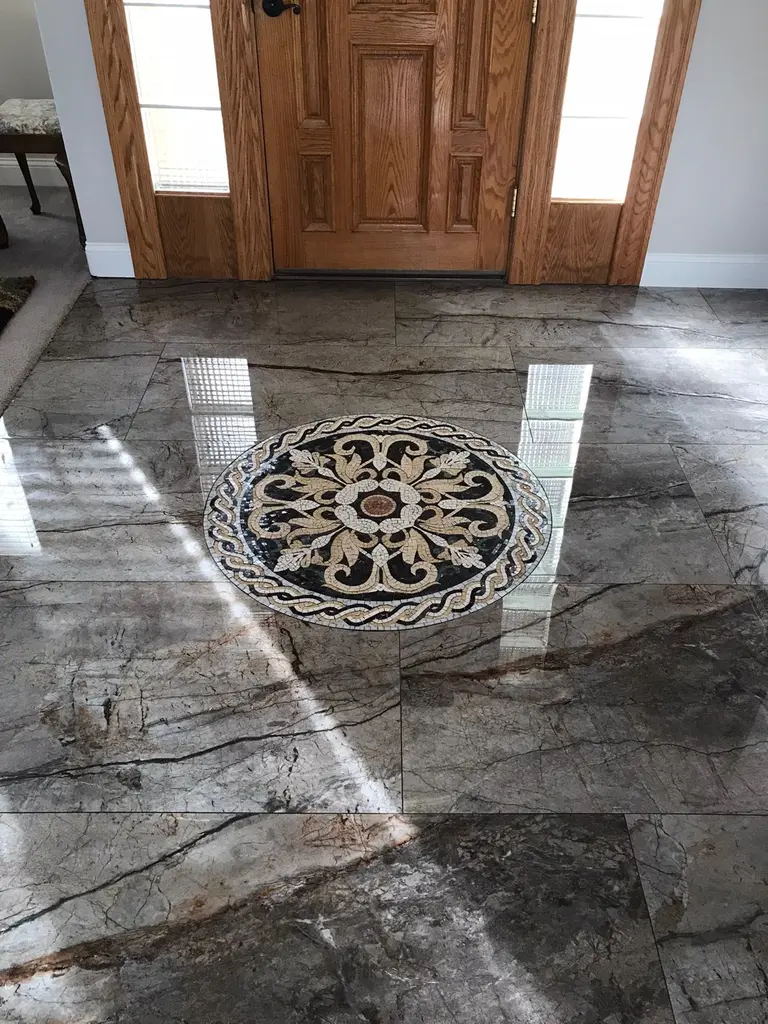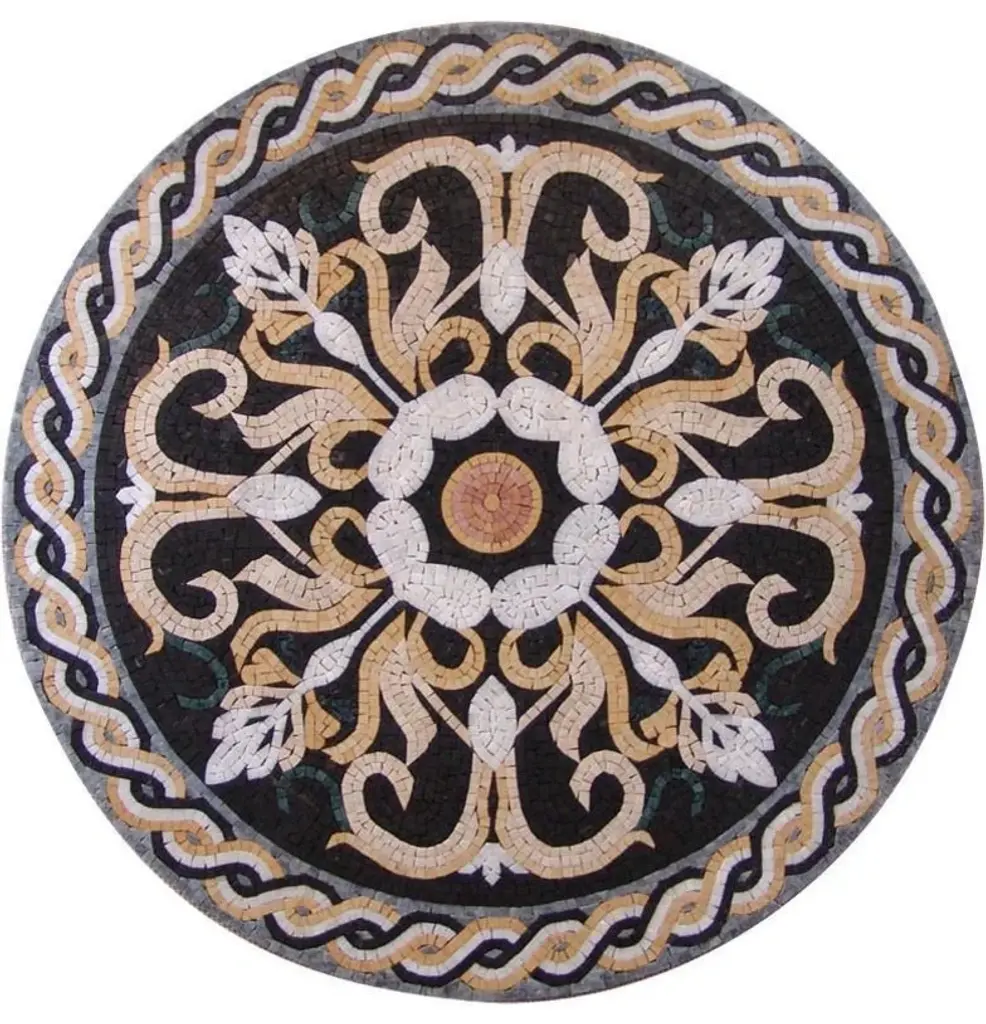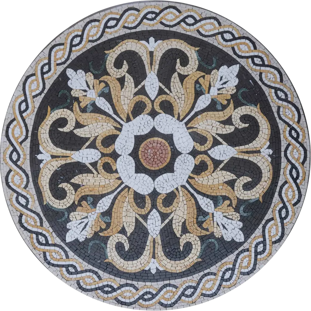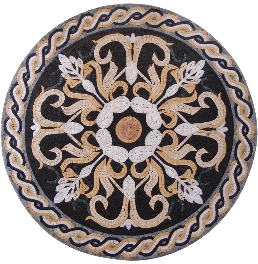 Millicent IV is an epitome of sophistication. It beholds intricate golden botanical patterns and white leaves. This mosaic medallion will complete your design style indoors and outdoors, and it will add a touch of class to your spaces. It is handmade from natural marble mosaic stones, highly durable and waterproof, and perfect for floors and walls, indoors or outdoors.