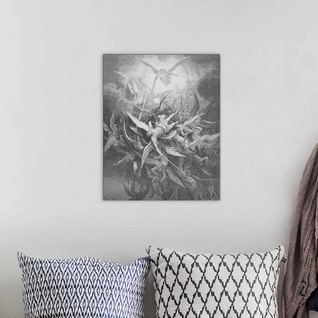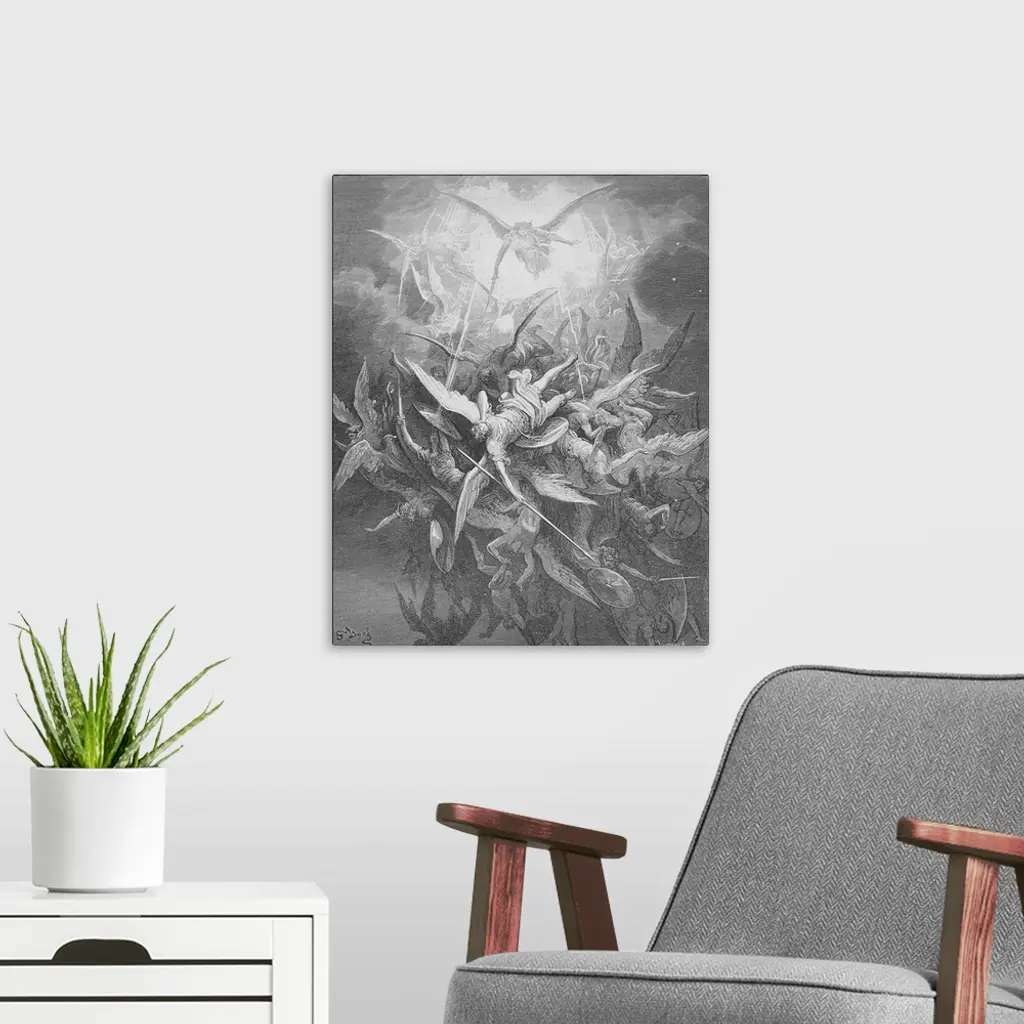 Satan and his rebellious angels are cast out of Heaven (Book I, lines 44-45). Originally a wood engraving after Gustave Dore for John Milton's 'Paradise Lost.'