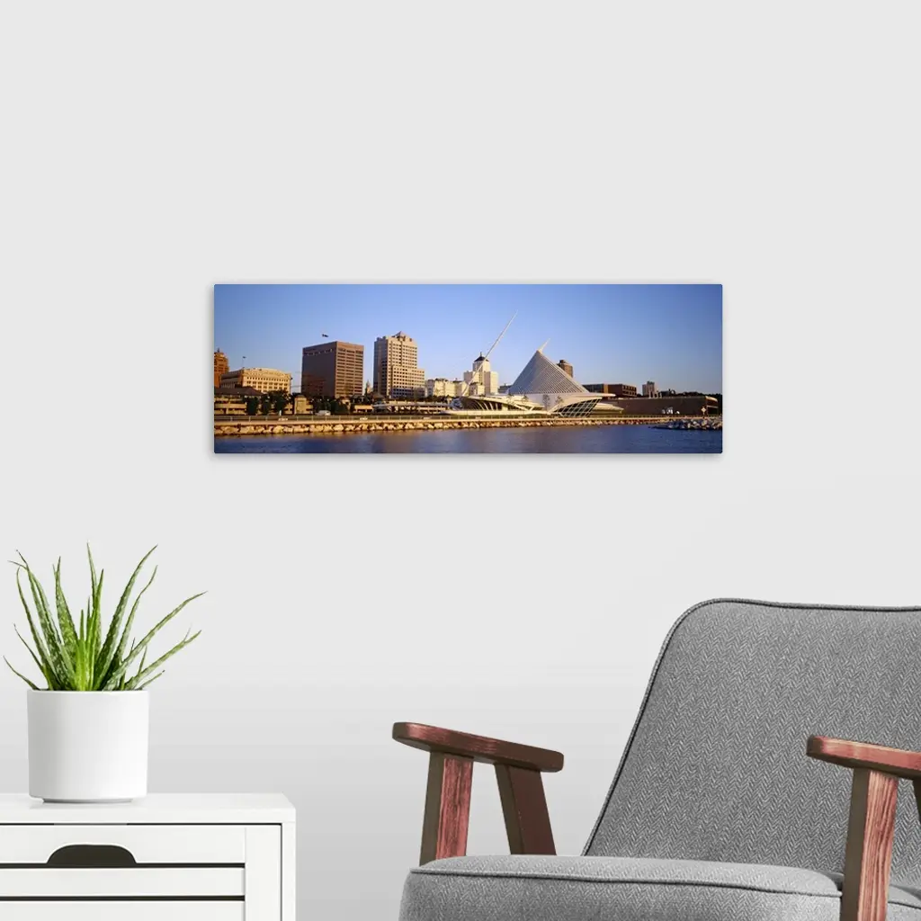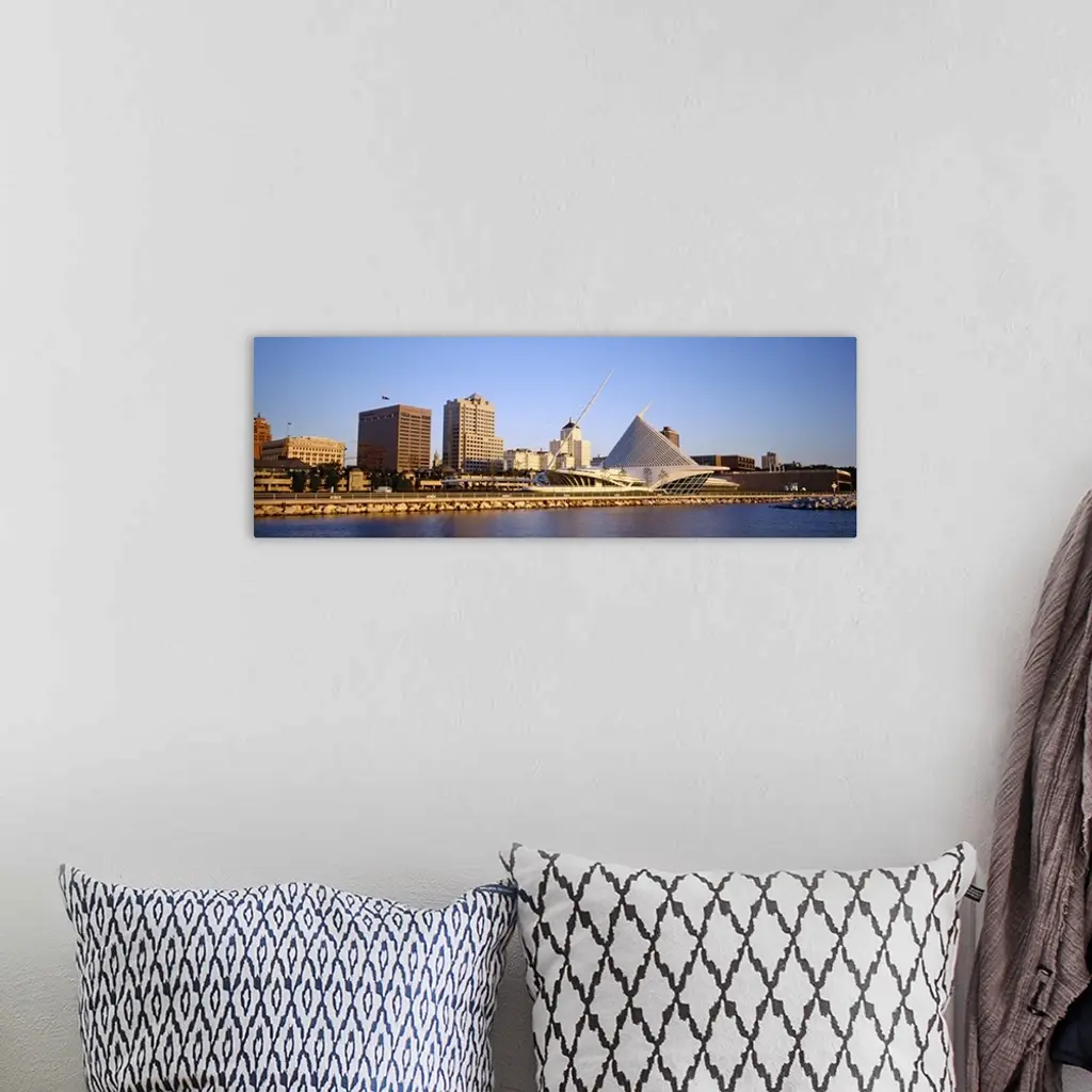 Panoramic photograph on a big canvas of buildings on the water in Milwaukee, Wisconsin, including the Milwaukee Art Museum.