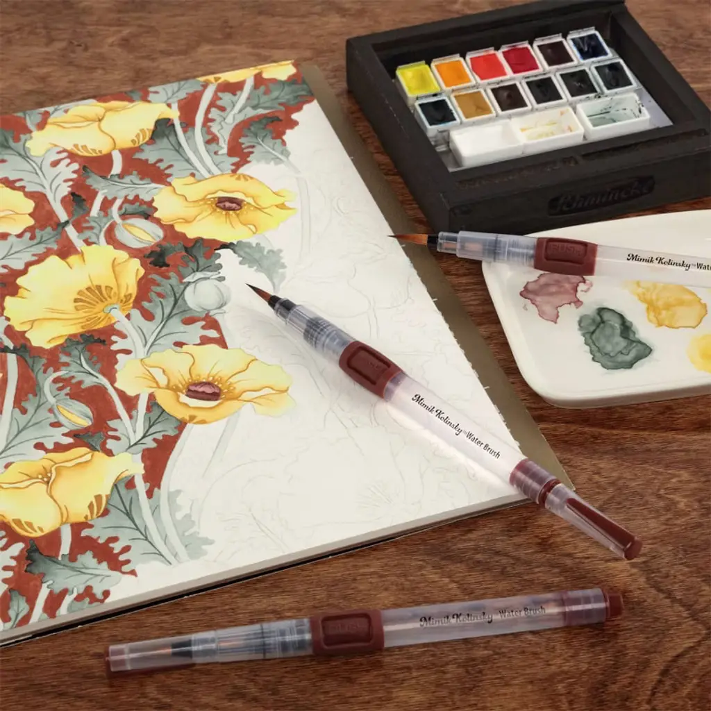 Introducing the Mimik Kolinsky Synthetic Water Brushes, an essential tool for watercolor enthusiasts and professionals alike. Crafted with precision by master brush makers in Germany, this exceptional water brush pen is designed to mimic the performance of Kolinsky red sable hair, providing artists with unparalleled control and versatility. The synthetic hair bristles are engineered to deliver the same responsiveness and water-holding capacity as traditional sable, making this water color brush an ideal choice for those seeking a cruelty-free alternative without compromising on performance. The Mimik Kolinsky Synthetic Water Brush features a fine, split-proof point that maintains its shape effortlessly, allowing for intricate detailing and seamless color transitions. Its highly absorbent bristles are capable of holding more water and color, ensuring a smooth and consistent flow with every stroke. The see-through water reservoir provides a convenient and constant supply of water, liquid watercolor, or water-soluble inks, making it perfect for on-the-go use. watercolor brushes This water paint brush pen is not only versatile but also portable, thanks to its protective brush cap. The cap ensures that the brush remains in pristine condition when not in use, making it an excellent choice for travel watercolor works. With its refillable design, this watercolor brush pen is both eco-friendly and economical, allowing artists to focus on their craft without worrying about frequent replacements. To clean between colors, gently squeeze out some water while brushing onto a paper towel or sponge until the water comes out clear. If you are using water-soluble ink or liquid watercolor, first thoroughly clean the barrel, then fill it with fresh water and clean it as usual.