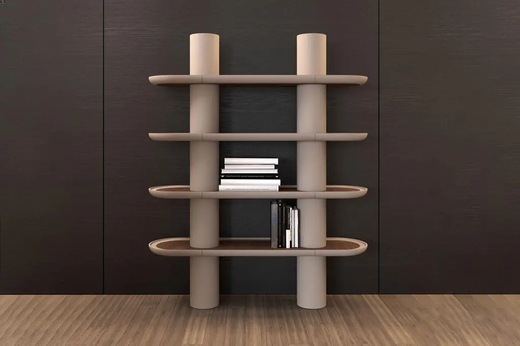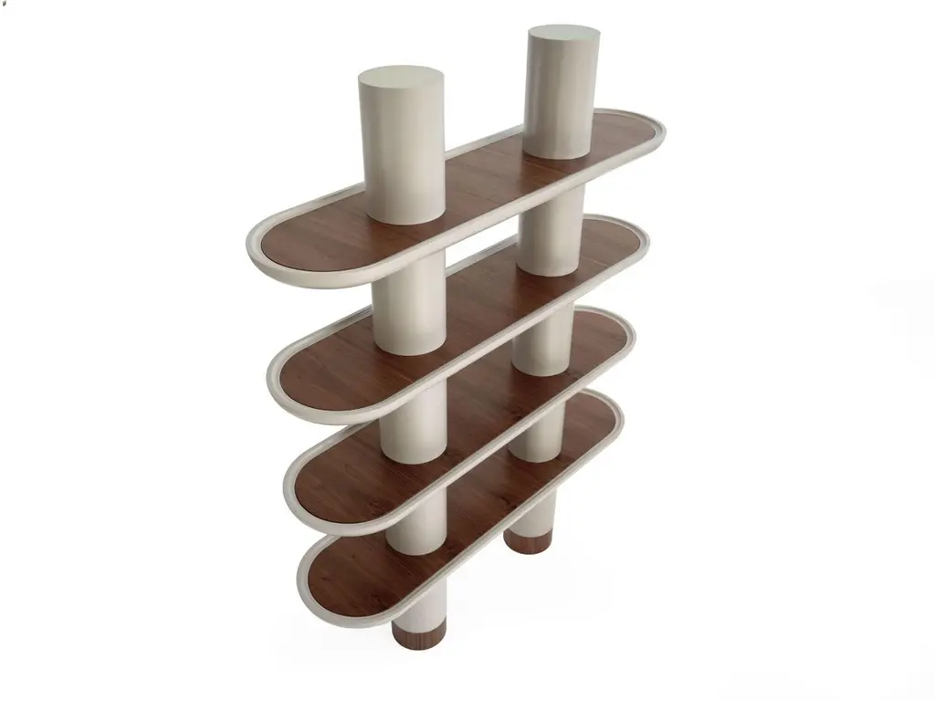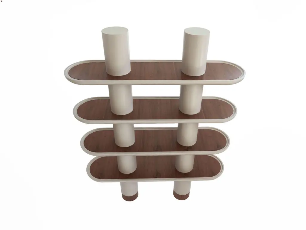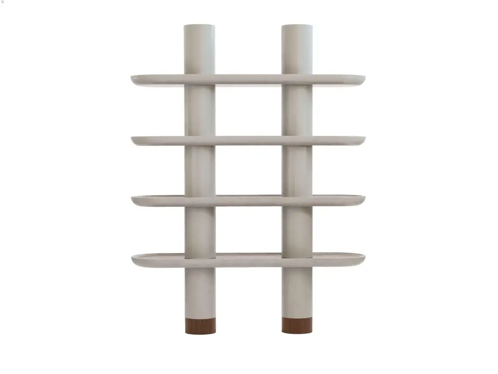 Lacquered structure Library with four shelves and two columns. Presented in G/Greige matte lacquered finish and Walnut Canaletto (Noce Canaletto) inserts and feet.LED lighting, build-in charges as an option.