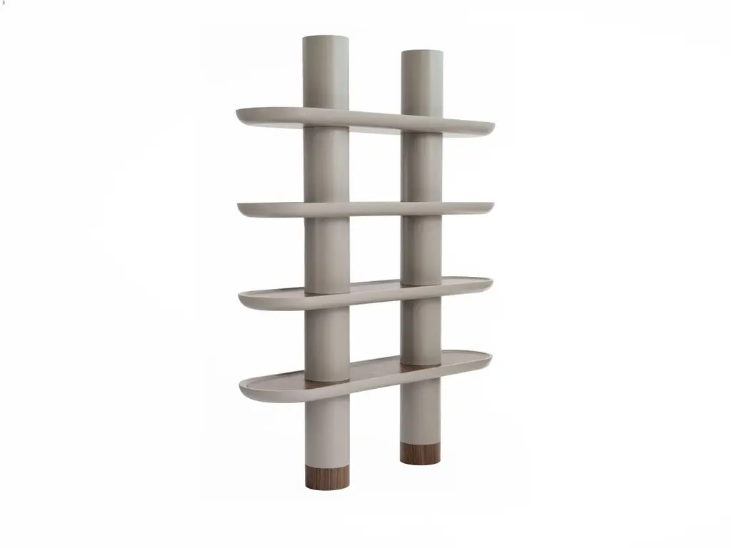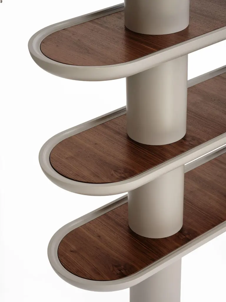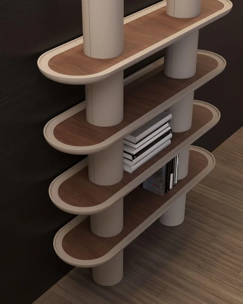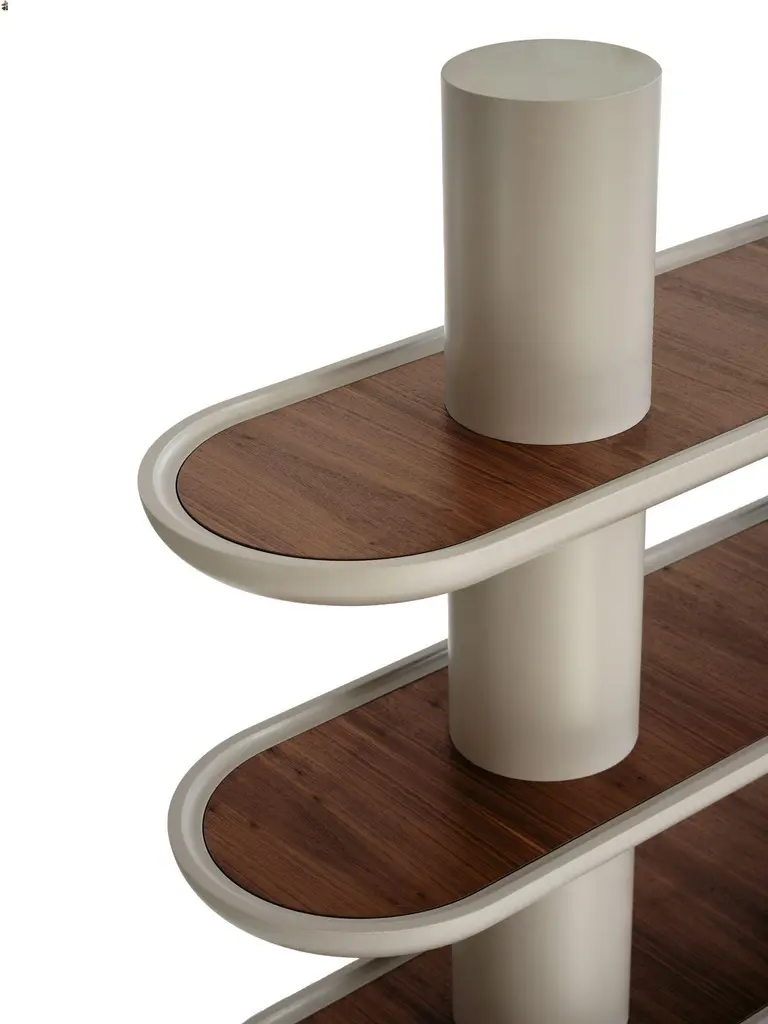 Lacquered structure Library with four shelves and two columns. Presented in G/Greige matte lacquered finish and Walnut Canaletto (Noce Canaletto) inserts and feet.LED lighting, build-in charges as an option.