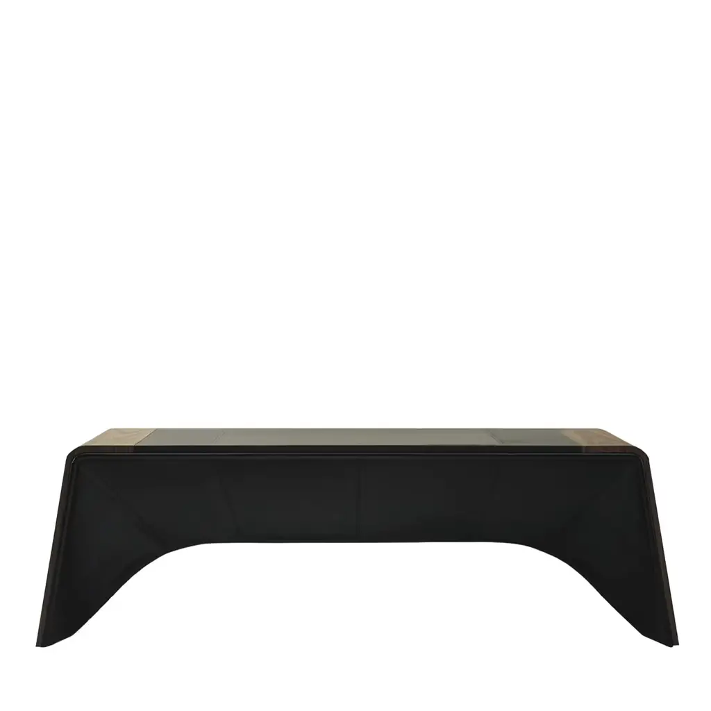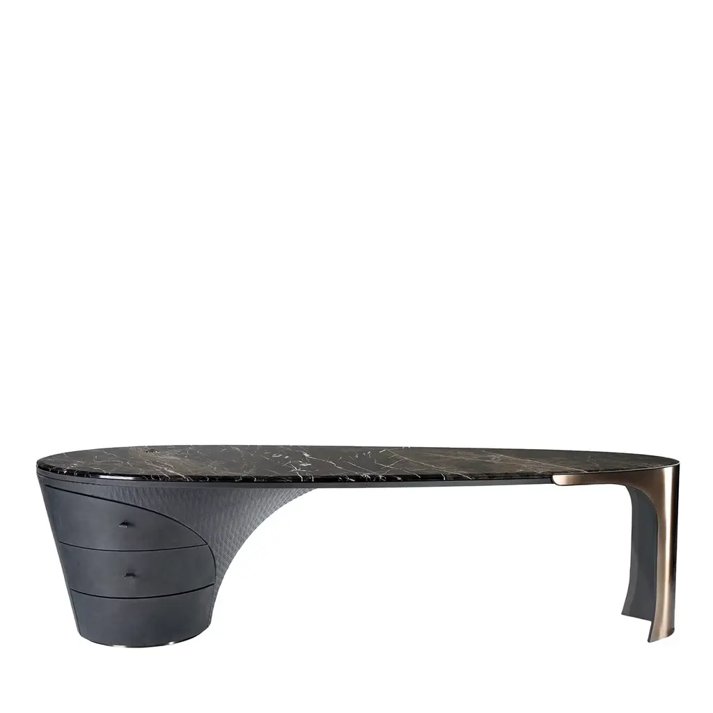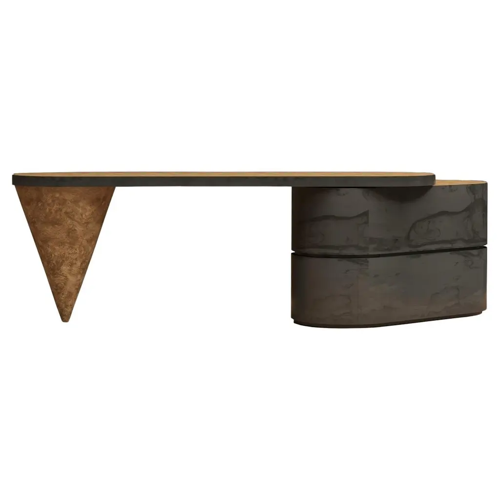 Intorucing MINA, a console designed by Storage Milano. This versatile unit features a beautifully crafted chest of drawers, highlighted by a poplar burl top that adds a touch of natural elegance. The top’s edge, drawers, and doors are all accented with a sleek metal coating, creating a striking contrast with the burl wood. The conical base adds a unique architectural element to the piece.