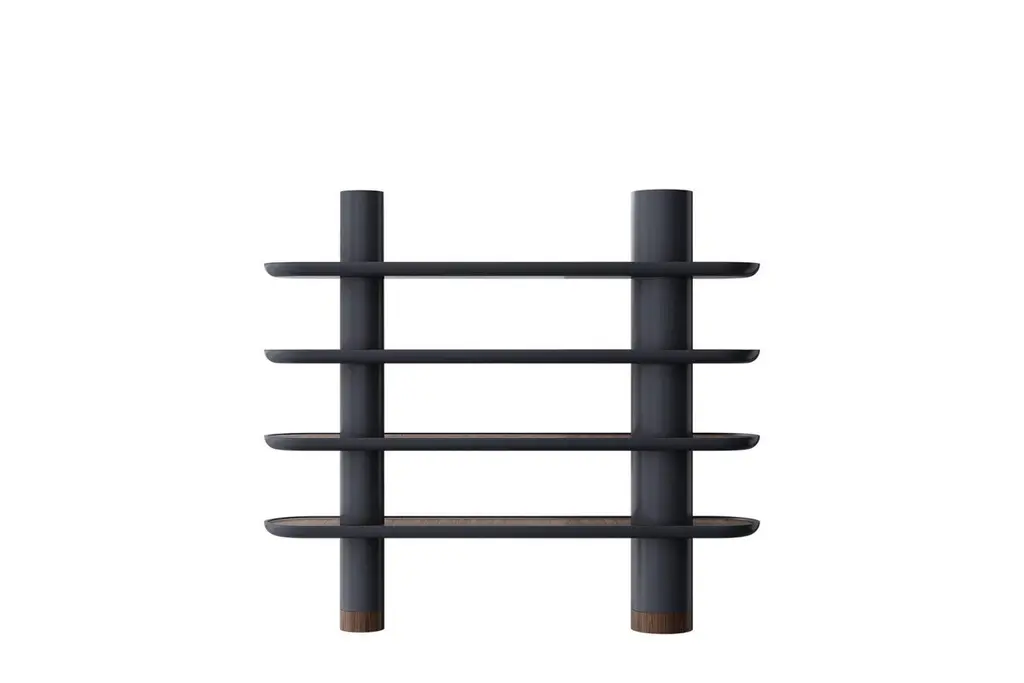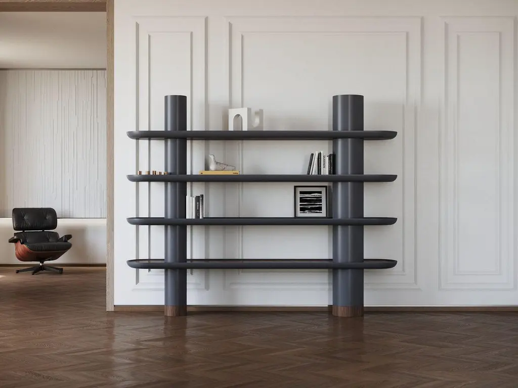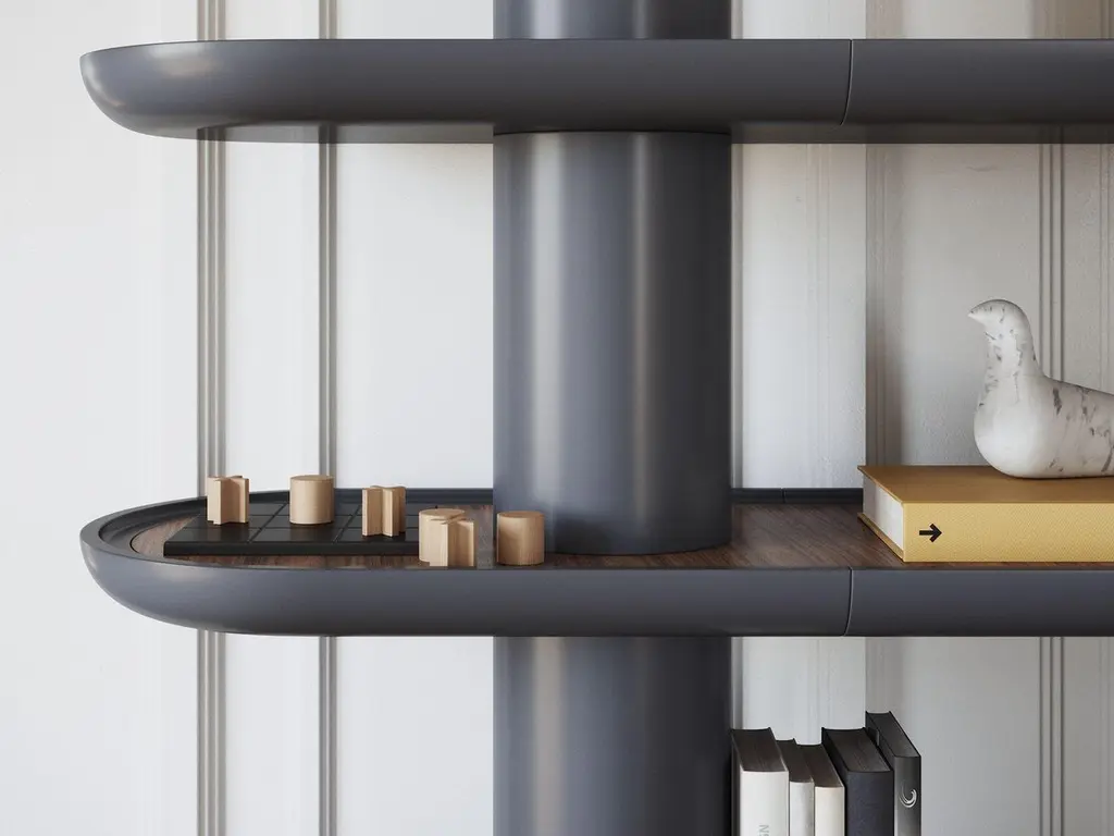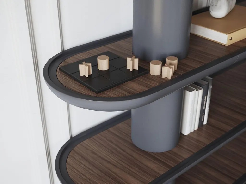 Unmistakably modern in its clean lines and harmonious contrasts, this bookcase makes for a superb addition to living rooms or studies. A deep shade of gray was selected for the lacquered wooden structure, its solid matte coloring standing in elegant conflict with the walnut wood veneer enriching the shelves' inner surface. Completed by bold cylindrical volume, the structure is also available with ceramic inserts upon request