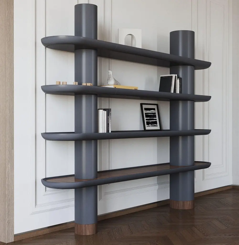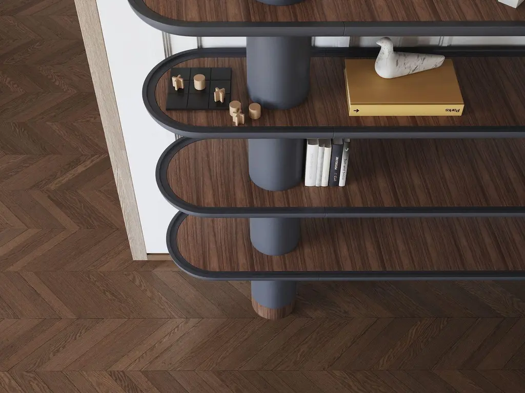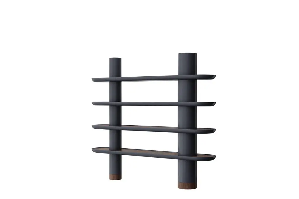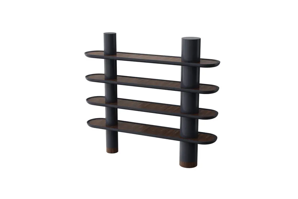 Unmistakably modern in its clean lines and harmonious contrasts, this bookcase makes for a superb addition to living rooms or studies. A deep shade of gray was selected for the lacquered wooden structure, its solid matte coloring standing in elegant conflict with the walnut wood veneer enriching the shelves' inner surface. Completed by bold cylindrical volume, the structure is also available with ceramic inserts upon request