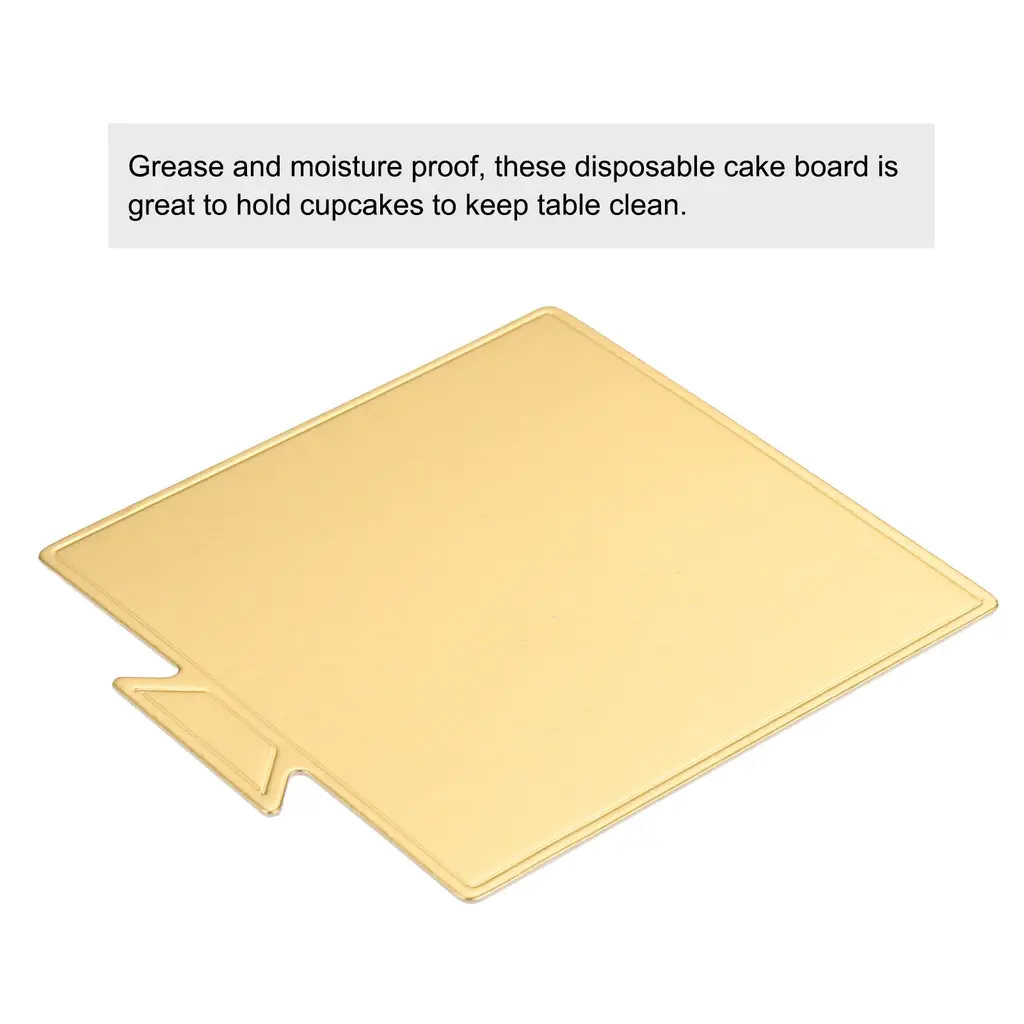Advantage:Material - The mini cake boards are made of paper cardboard, are disposable and reliable, are not easy to bend, and are safe for your family. It's easy to clean and could be thrown in a dustbin after use. Do not put it in the oven or contact with the gas flame.Design - Mini cake boards are designed with smooth surfaces and attractive black color, giving a luxurious and elegant feeling. These cake paper plates are lightweight and portable, convenient to stack and carry around.Oil-Proof and Moisture Proof - Rely on oil and moisture-resistant characteristics, you will not get your hands dirty when enjoying your dessert, and your table will stay clean. Each of our cake bases has a small tab on the side for convenient serving and handling. Sturdy cake base to keep your pastry stable and in a good place.Wide Application - Use the cake boards as a tray for cupcakes, a centerpiece on a dessert table, cake slices, cupcakes, treats, etc. These great mini-cake bases are suitable for various events such as weddings, Christmas, birthdays, tea parties, and so on.Specification:Material: CardboardColor: GoldSize: 7.2 x 7.2 cm/2.8 x 2.8 inch(L*W)Package Included: 100pcs x Mini Cake Boards.