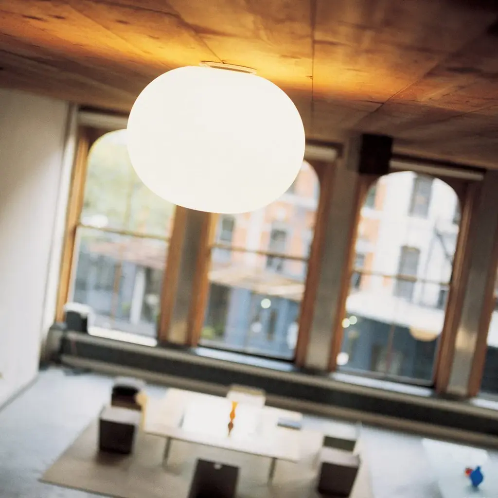 Part of the popular Glo-Ball Series, the Mini Glo-Ball C/W was created by artist Jasper Morrison to invoke the radiant calm of a full moon. This unique wall or ceiling fixture provides diffused light. Its diffuser consists of an externally acid-etched, hand-blown, flashed opaline glass and a white, injection-molded PPS threaded ring nut. There is an injection-molded PPS white wall fitting. Please note, the base of the fixture will not cover a standard US junction box, a reduction ring is needed and included.