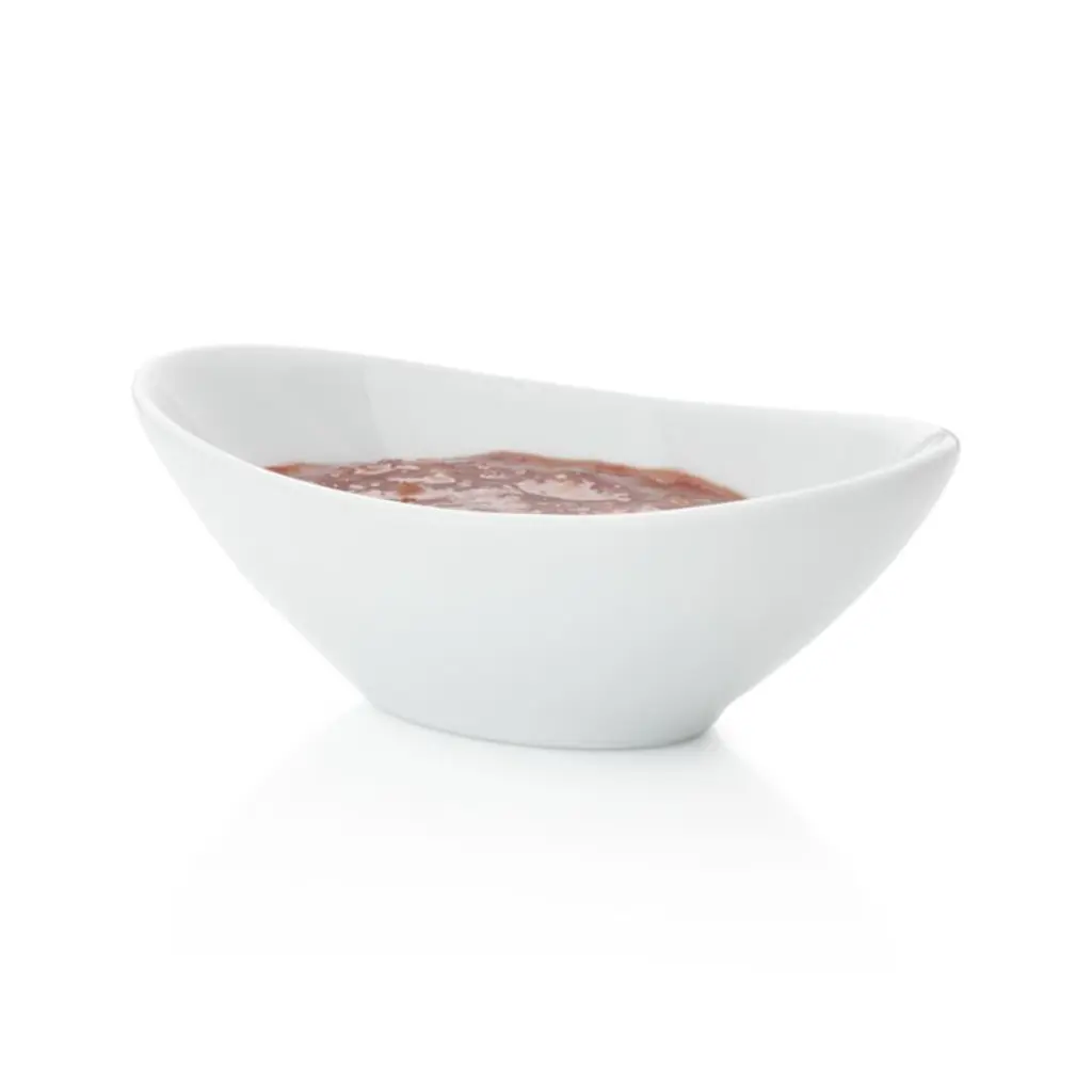 Sloped oval dish in bright white porcelain is sized to perfectly accommodate sauces, dips, condiments or individual servings of appetizers or desserts. The petite, gracefully curved bowl, a Crate and Barrel exclusive, pairs beautifully with our bright white porcelain dinnerware and serving pieces. Oven-safe to 350 degrees, our mini oval dish is perfect for presenting warm sauces and treats.