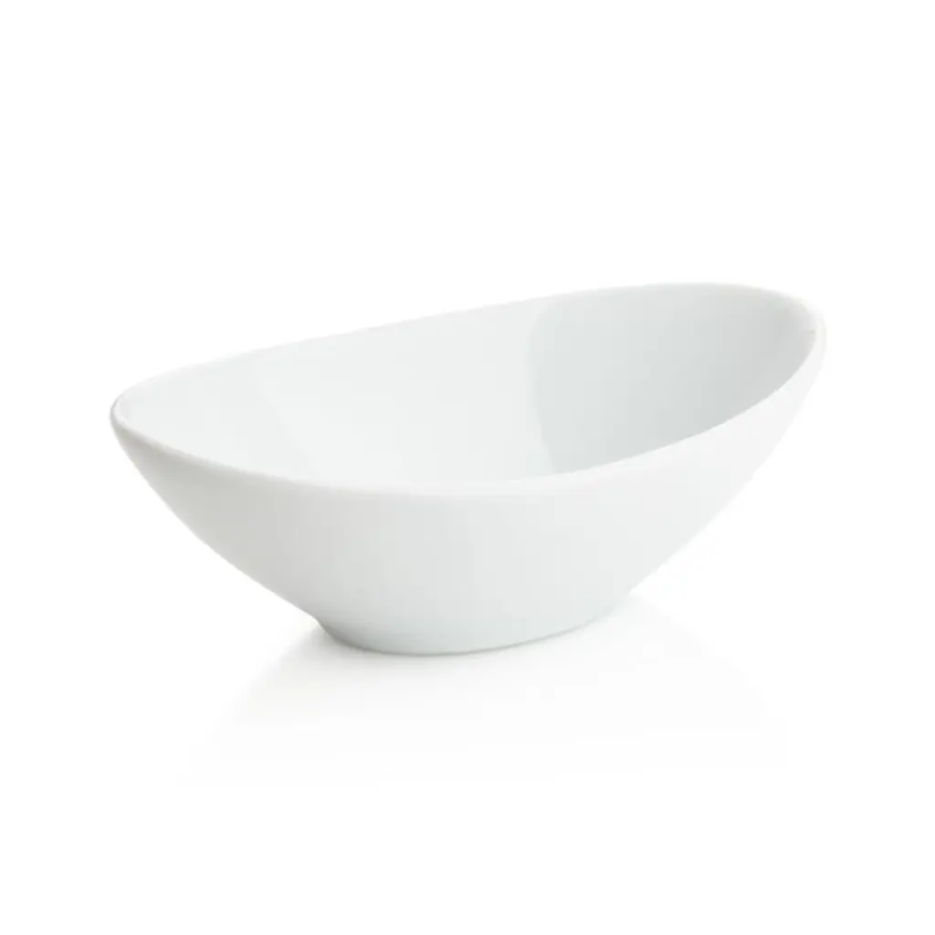 Sloped oval dish in bright white porcelain is sized to perfectly accommodate sauces, dips, condiments or individual servings of appetizers or desserts. The petite, gracefully curved bowl, a Crate and Barrel exclusive, pairs beautifully with our bright white porcelain dinnerware and serving pieces. Oven-safe to 350 degrees, our mini oval dish is perfect for presenting warm sauces and treats.