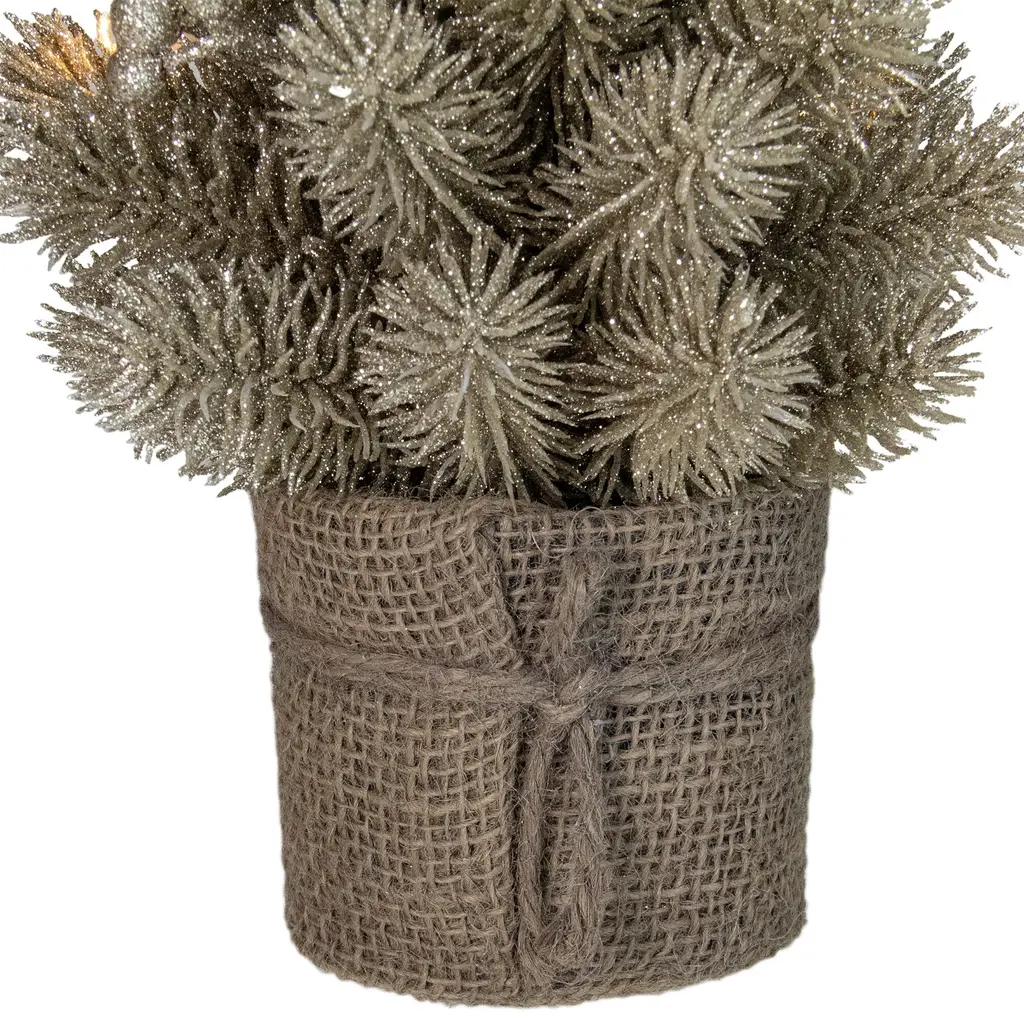 Crafted with meticulous attention to detail, this lifelike tree perfectly captures the beauty of a natural pine. This compact tree is ideal for smaller spaces, tabletops, or as a delightful addition to your existing holiday decor. The weighted burlap base ensures stability, allowing you to easily showcase this charming tree anywhere in your home. Unlit for maximum versatility, this artificial Christmas tree gives you the freedom to customize it with your preferred style of lights and ornaments. Product Features: Unlit 17 tips Branches and berries accented in gold glitter Comes in a weighted burlap base No assembly required - tree comes in 1 piece For indoor use only Dimensions: 12" high x 7" diameter Material(s): PE/wire/burlap Note:Branches are compressed for shipment, and need to be fluffed out upon arrival to look like the photo.