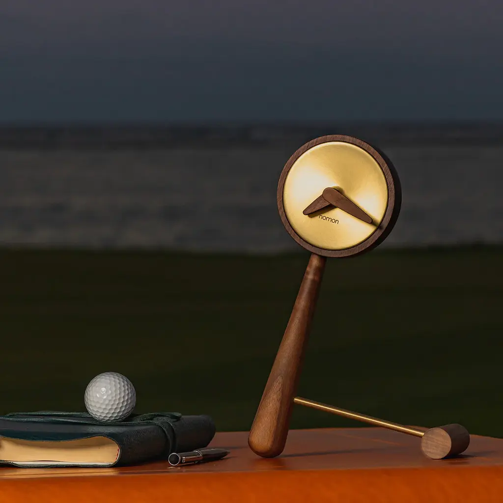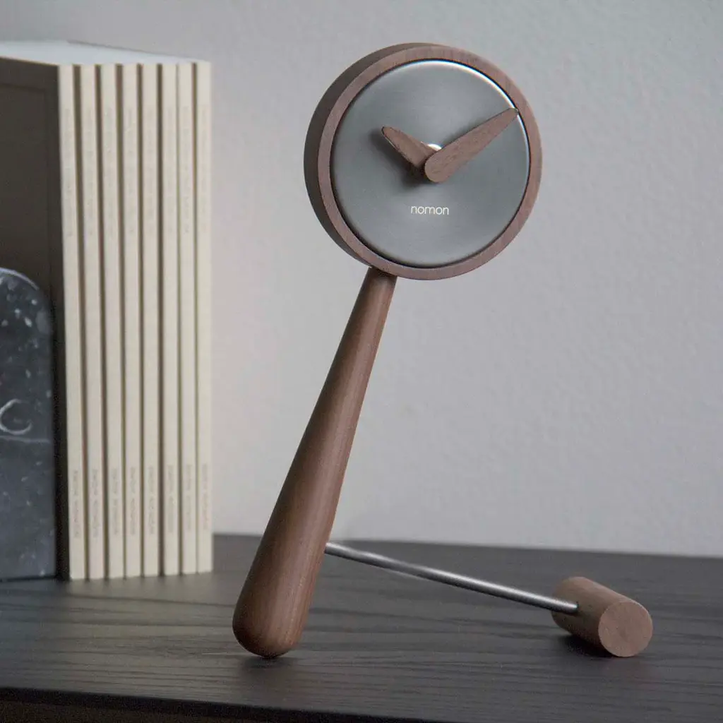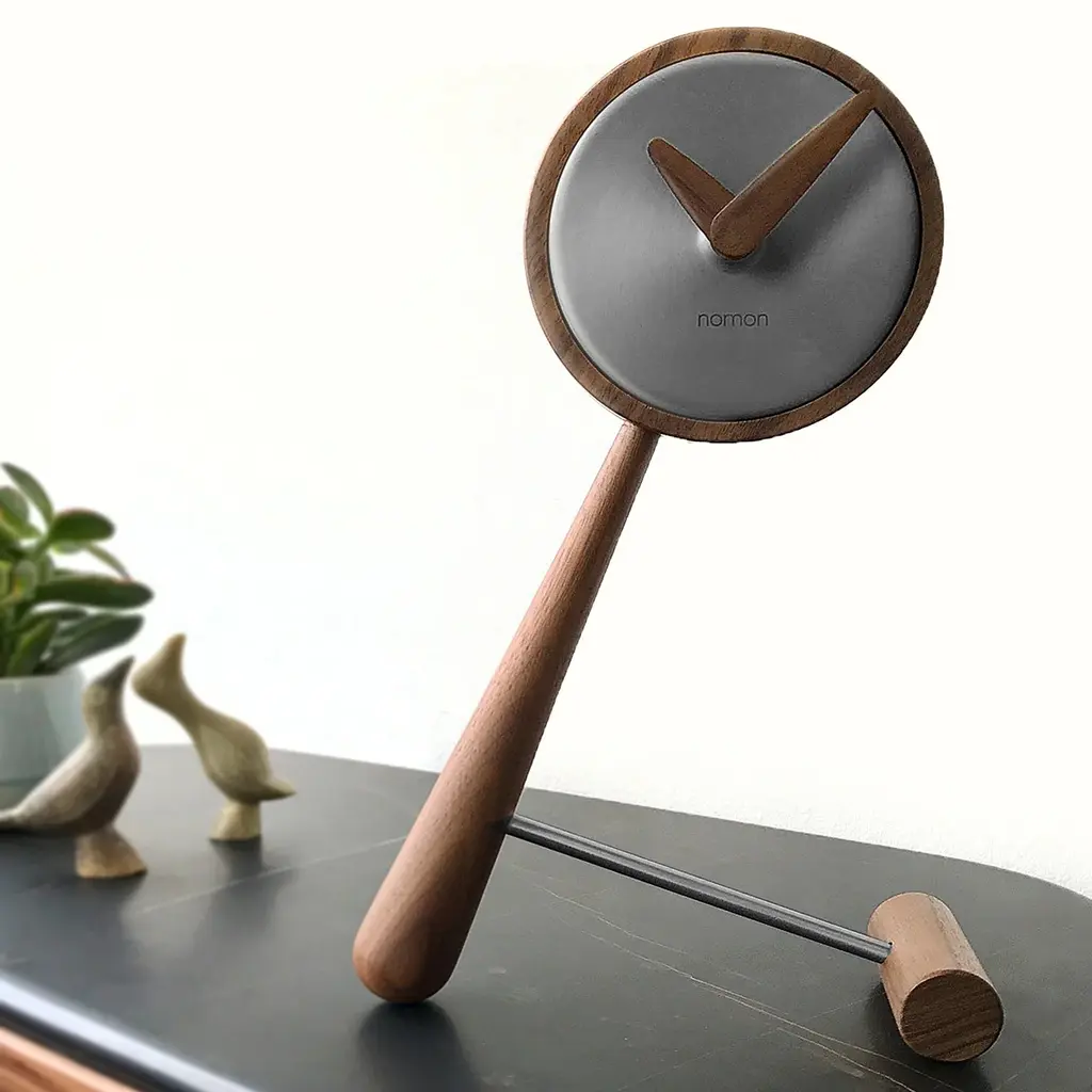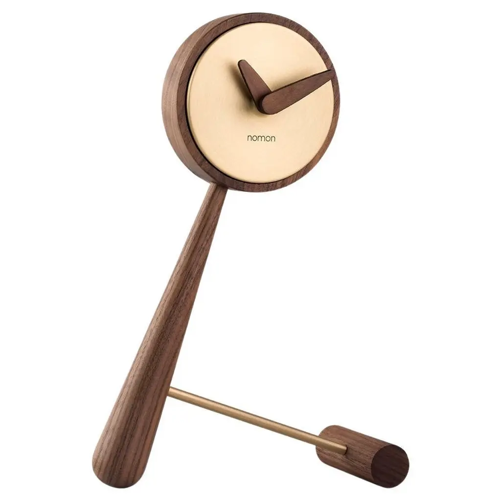 Nomon reaches a wry tipping point with Mini Puntero, given its playful leaning tabletop style in rich solid walnut with a polished brass finish or sleek graphite steel for the center of the clock. Based in Barcelona, Nomon melds creatively handcrafted artisanship with precision German-origin UTS technology.