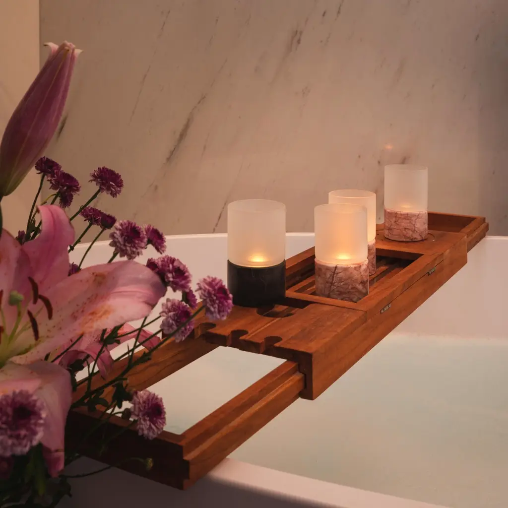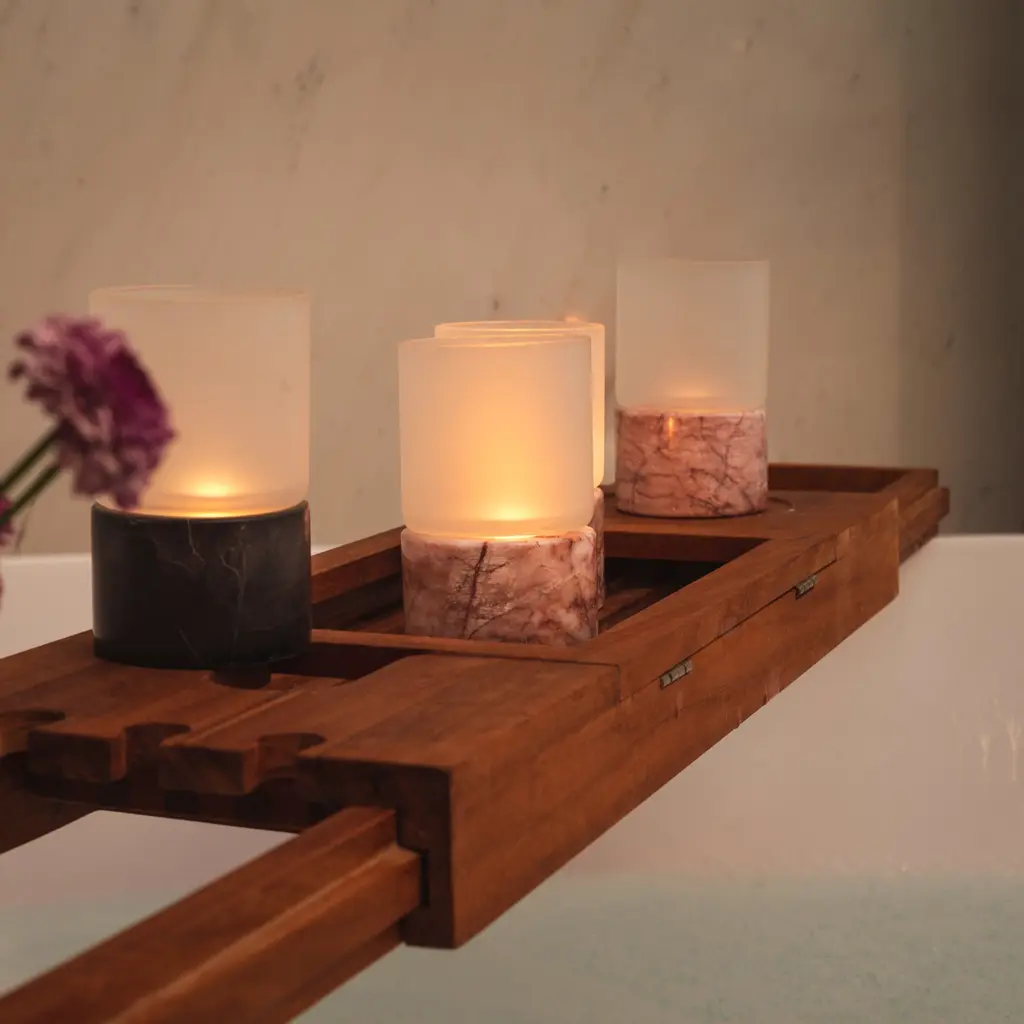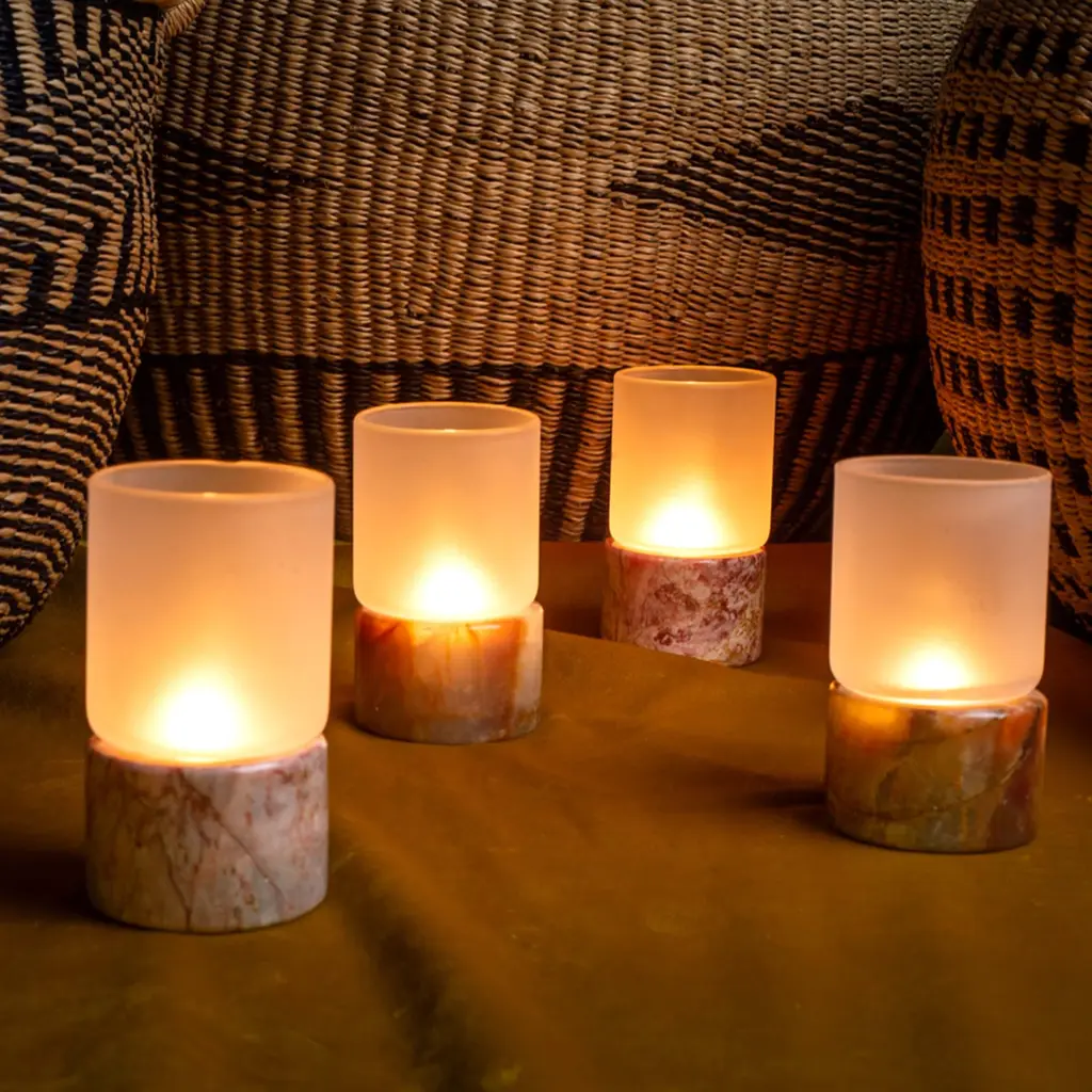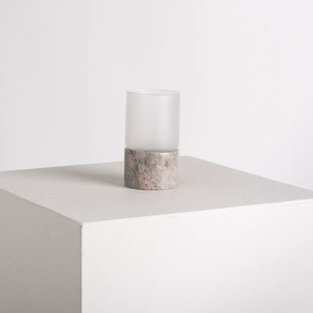 A perfect tea candle holder to set the table, living room, bathroom.Its frosted glass shade diffuses the candlelight harmoniously and perfectly sets the space.One, it looks perfect however several boards combine incredible.Carved in marble or volcanic stone by hand. Frosted glass shade in borosilicate that withstands high temperatures.Standard tea-light candle.