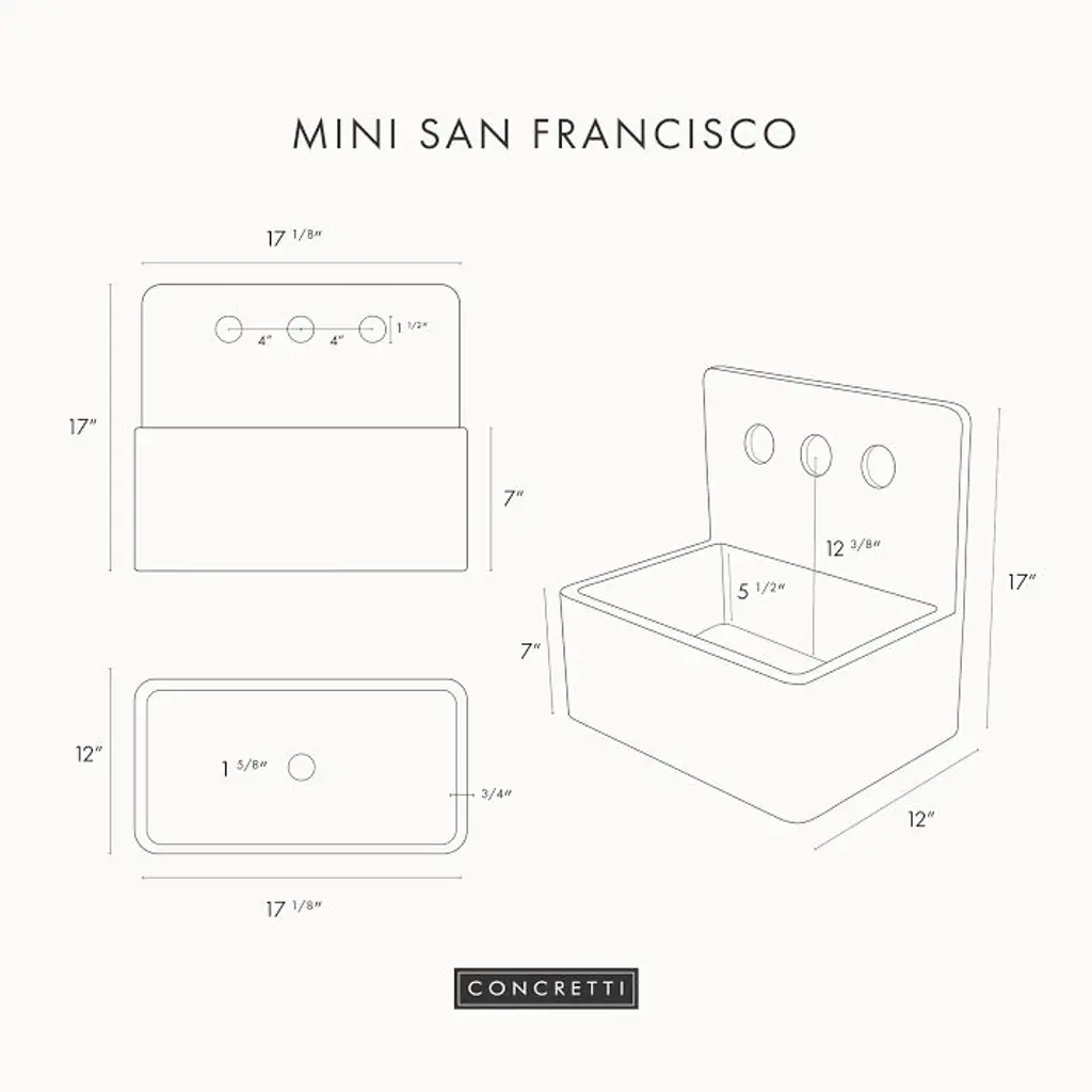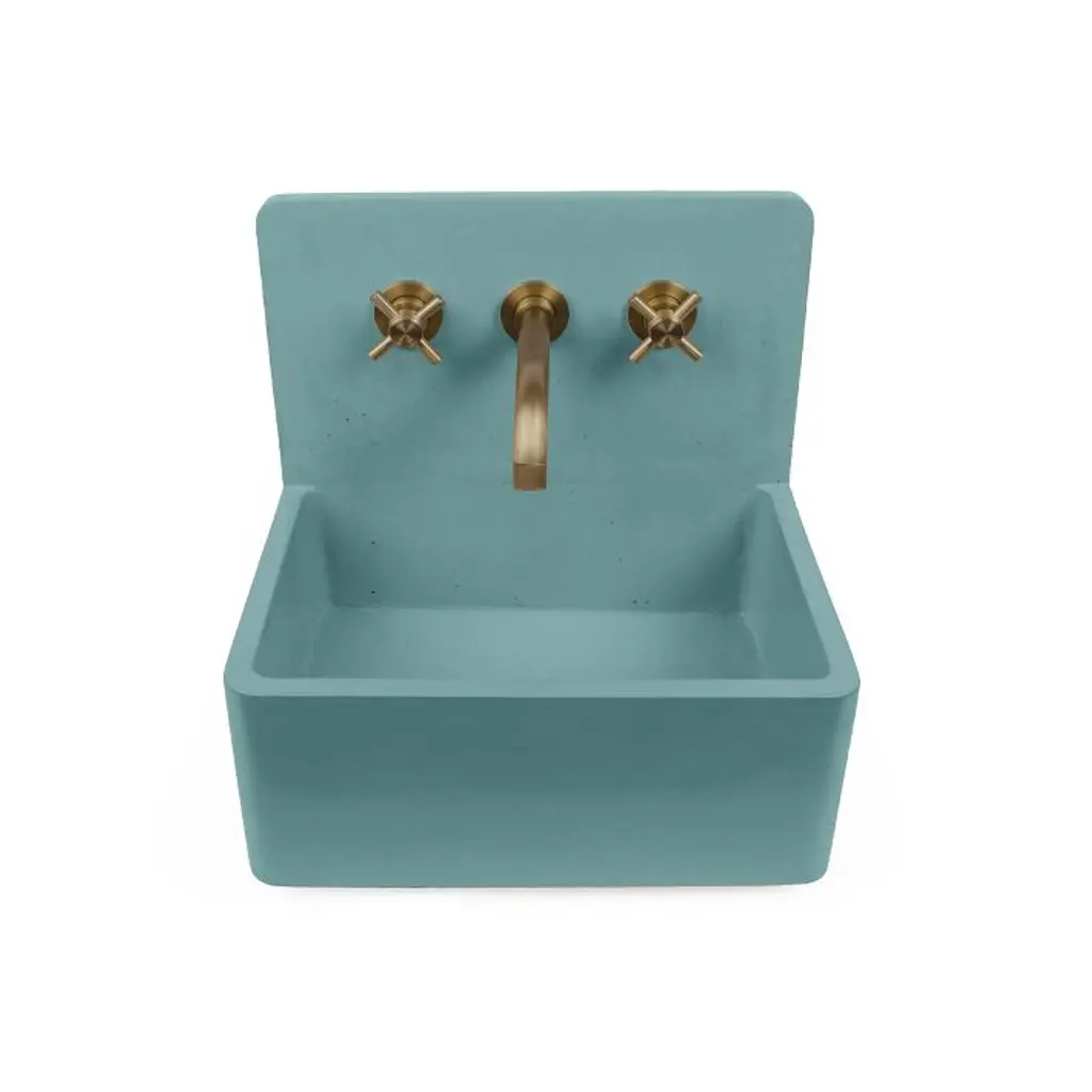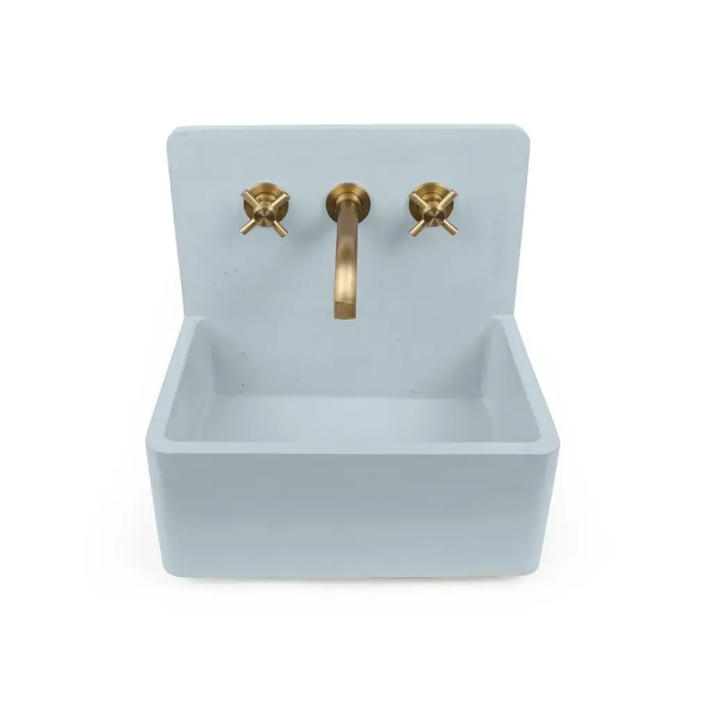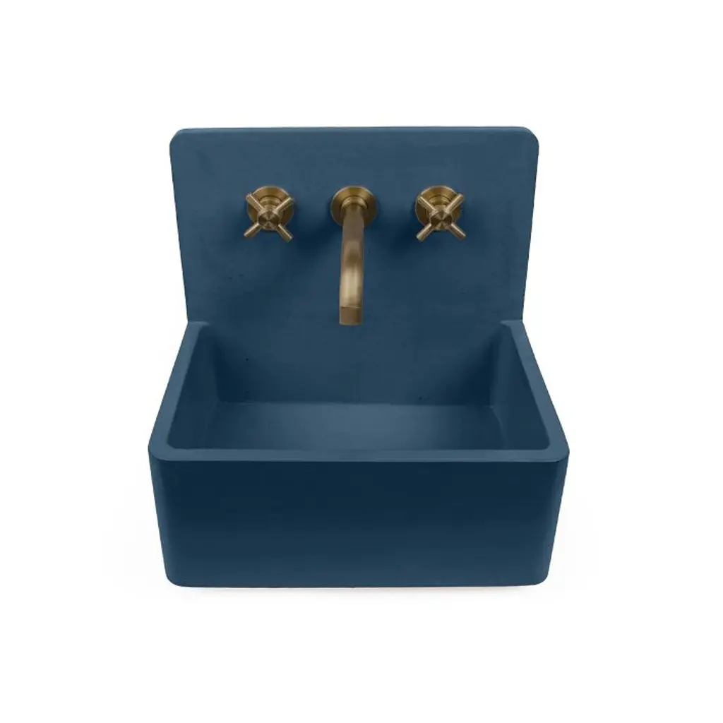Our Mini San Francisco Sink's vintage-inspired bucket design adds a bold, elegant statement to your bath. Made from durable concrete, its stylish backsplash and deep basin come in a variety of fun colors and are built to last. Concrete base. Due to the natural composition of concrete, each product will be slightly unique and have natural variations. 3-hole configuration is compliant with any standard 8” widespread faucet. A standard faucet with a 5" spout reach is recommended. Faucet, sink hole cover and bottle trap not included in base model. See options below for purchase. Wall-Mounted Faucet has single handle lever design for ease of use. Metal Pop-Up Drain has an easy push button to open and close. Solid brass Bottle Trap is a decorative solution for vessels and exposed plumbing application. Hanging hardware included. Sold individually. Sinks are handcrafted in the USA, made by Concretti Designs.