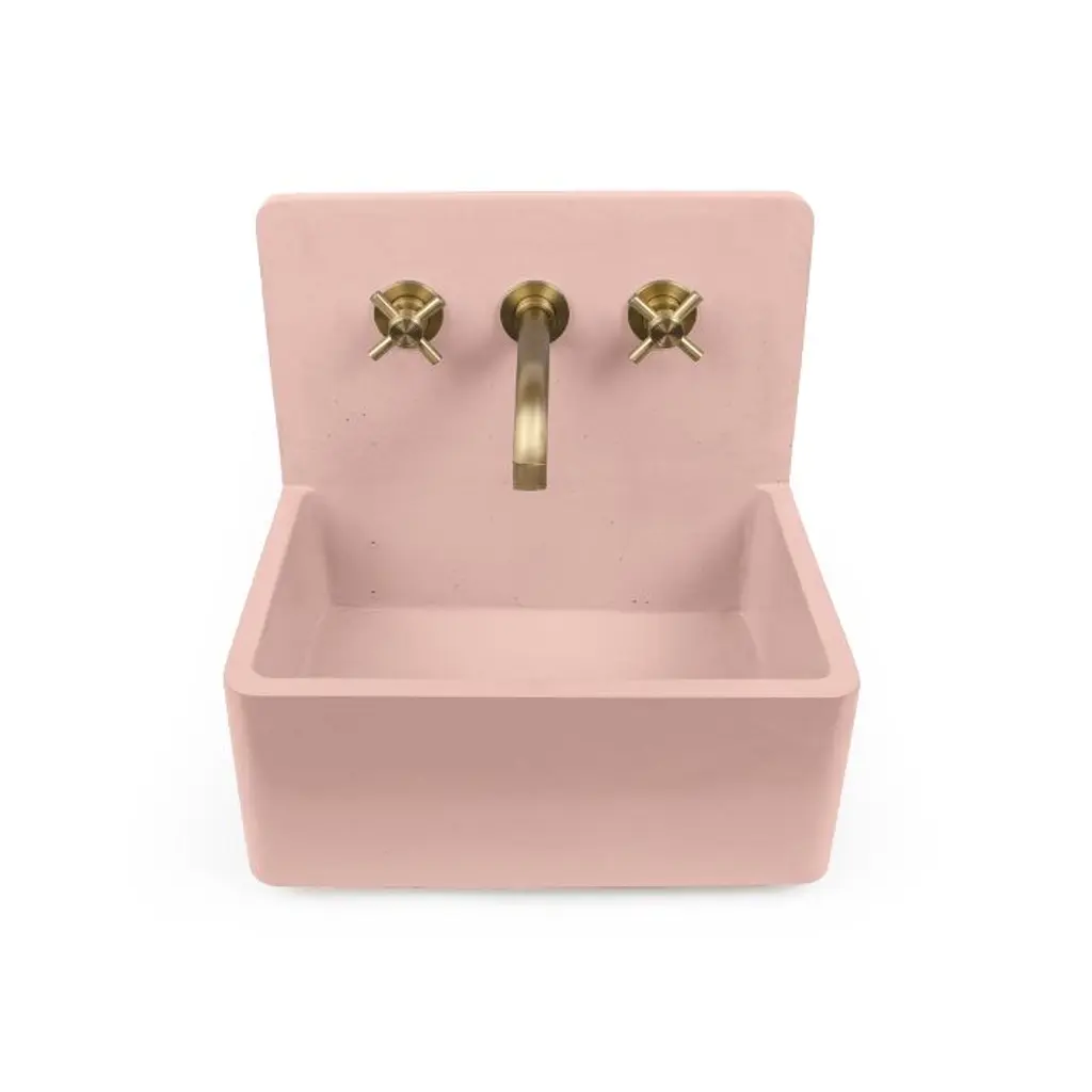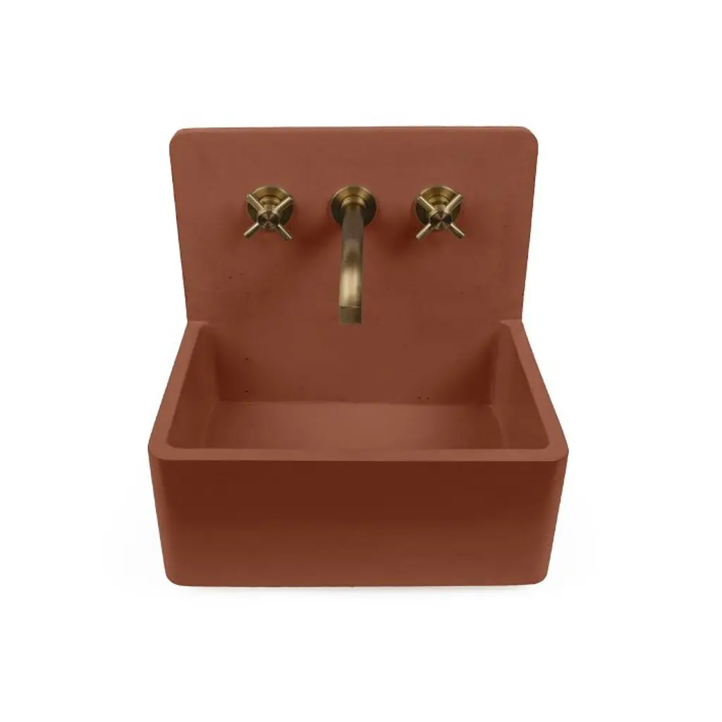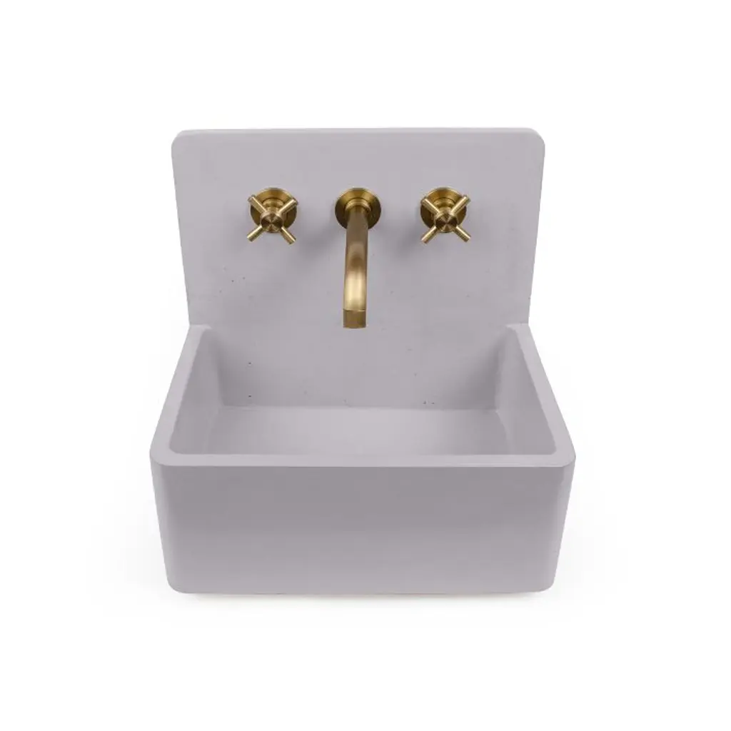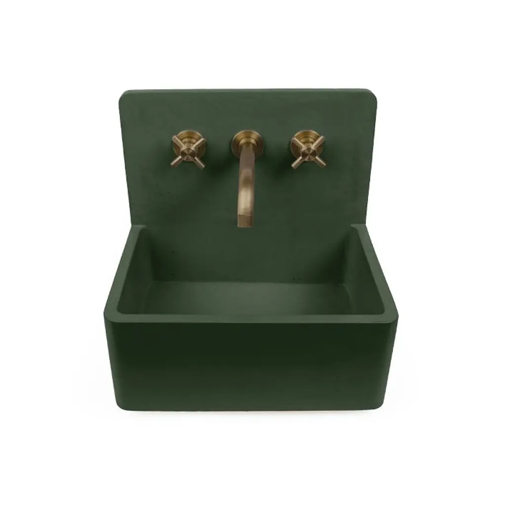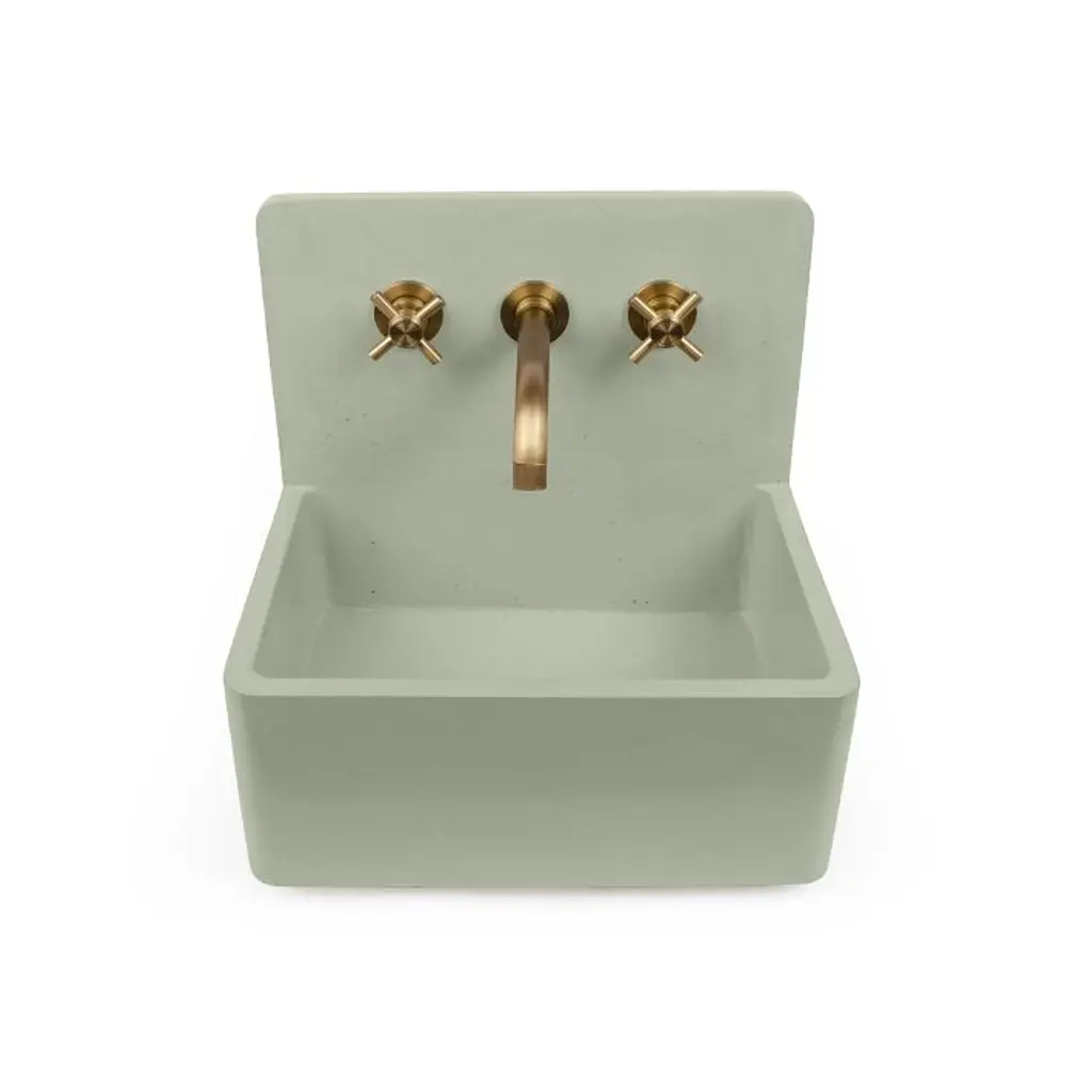 Our Mini San Francisco Sink's vintage-inspired bucket design adds a bold, elegant statement to your bath. Made from durable concrete, its stylish backsplash and deep basin come in a variety of fun colors and are built to last. Concrete base. Due to the natural composition of concrete, each product will be slightly unique and have natural variations. 3-hole configuration is compliant with any standard 8” widespread faucet. A standard faucet with a 5" spout reach is recommended. Faucet, sink hole cover and bottle trap not included in base model. See options below for purchase. Wall-Mounted Faucet has single handle lever design for ease of use. Metal Pop-Up Drain has an easy push button to open and close. Solid brass Bottle Trap is a decorative solution for vessels and exposed plumbing application. Hanging hardware included. Sold individually. Sinks are handcrafted in the USA, made by Concretti Designs.