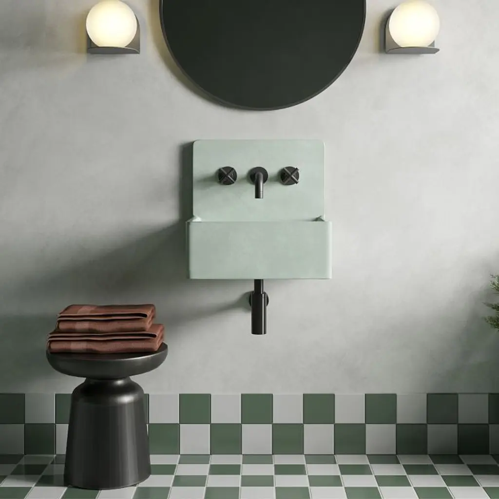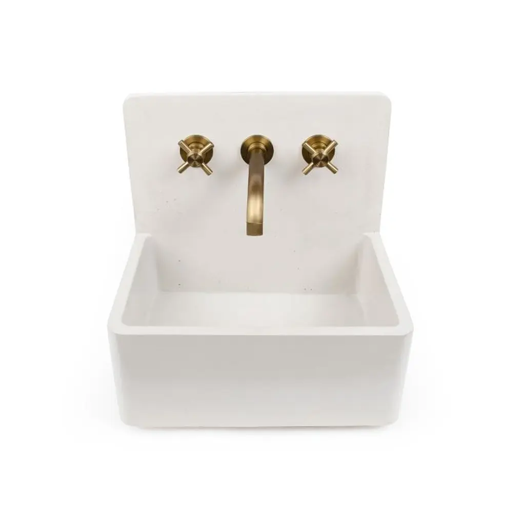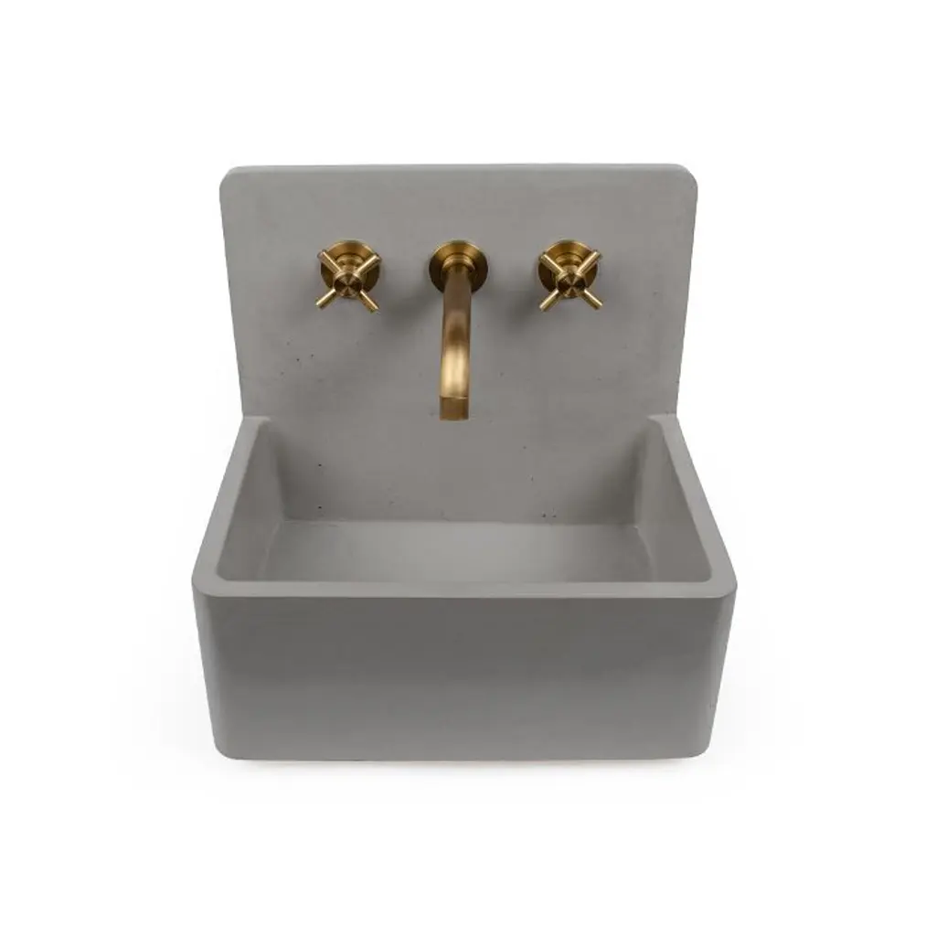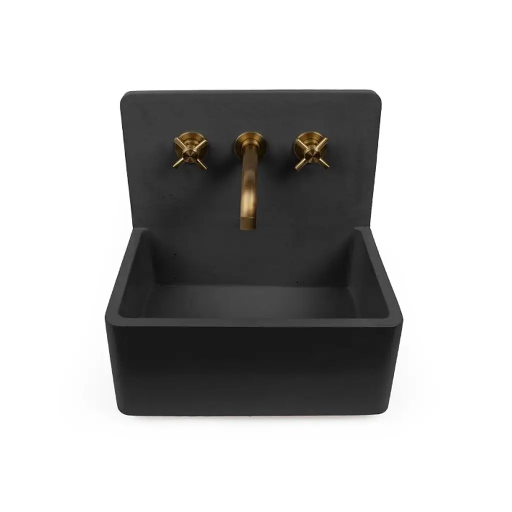Our Mini San Francisco Sink's vintage-inspired bucket design adds a bold, elegant statement to your bath. Made from durable concrete, its stylish backsplash and deep basin come in a variety of fun colors and are built to last. Concrete base. Due to the natural composition of concrete, each product will be slightly unique and have natural variations. 3-hole configuration is compliant with any standard 8” widespread faucet. A standard faucet with a 5" spout reach is recommended. Faucet, sink hole cover and bottle trap not included in base model. See options below for purchase. Wall-Mounted Faucet has single handle lever design for ease of use. Metal Pop-Up Drain has an easy push button to open and close. Solid brass Bottle Trap is a decorative solution for vessels and exposed plumbing application. Hanging hardware included. Sold individually. Sinks are handcrafted in the USA, made by Concretti Designs.