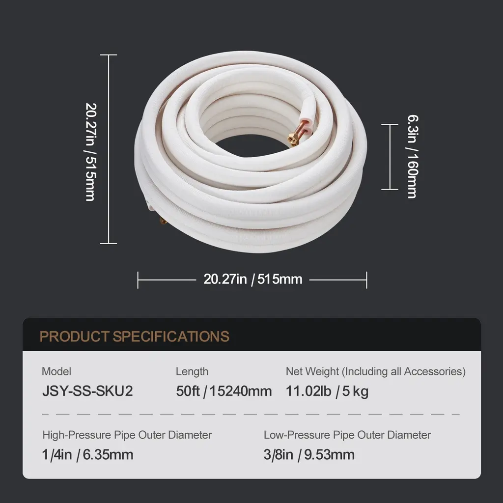 50FT Copper Tube: With a length of up to 50ft/25ft/16ft, the copper tube can easily connect indoor and outdoor units even over long distances without difficulty. High and Low Pressure Dual Pipes: Includes 3/8"/1/4" high-pressure tubes and 5/8"/3/8"/1/2" low-pressure tubes, compatible with 18000-26000 BTU/0-12000 BTU/12000-18000 BTU split air conditioners, specifically designed for mini-split air conditioning systems. Thickened Pure Copper Tube: Utilizes high-quality copper tubes compliant with ASTM standards, meticulously controlling the wall thickness of both high-pressure and low-pressure tubes, providing excellent toughness and hardness, eliminating the frustration of thin copper tubes easily flattening with a single fold. Three-layer Insulation Cotton: Wrapped tightly with three layers of insulation cotton, the copper tube sustains effective insulation while being waterproof and pressure-resistant, offering better protection for the internal copper tubes. 4-Step Quick Installation: Equipped with 2 tie wraps, installation is extremely simple, requiring only 4 steps to complete, effortlessly connecting indoor and outdoor units. Package Content (Mini Split Line Tubing x 1 User Manual x 1 Wrapping Strips x 2)for 60kg option (Mini Split Line Set x 1 Instruction Manual x 1 Connection Cable x 1 9.8ft Drainage Pipe x 1 Wrapping Strips x 2 Decorative Cover x 1 Wall Sleeve x 1 Sealant Putty x 2)for others option