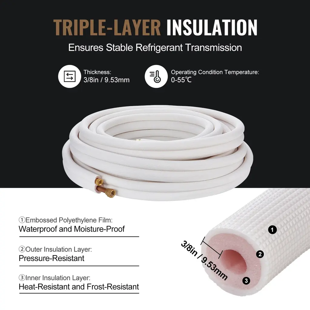 50FT Copper Tube: With a length of up to 50ft/25ft/16ft, the copper tube can easily connect indoor and outdoor units even over long distances without difficulty. High and Low Pressure Dual Pipes: Includes 3/8"/1/4" high-pressure tubes and 5/8"/3/8"/1/2" low-pressure tubes, compatible with 18000-26000 BTU/0-12000 BTU/12000-18000 BTU split air conditioners, specifically designed for mini-split air conditioning systems. Thickened Pure Copper Tube: Utilizes high-quality copper tubes compliant with ASTM standards, meticulously controlling the wall thickness of both high-pressure and low-pressure tubes, providing excellent toughness and hardness, eliminating the frustration of thin copper tubes easily flattening with a single fold. Three-layer Insulation Cotton: Wrapped tightly with three layers of insulation cotton, the copper tube sustains effective insulation while being waterproof and pressure-resistant, offering better protection for the internal copper tubes. 4-Step Quick Installation: Equipped with 2 tie wraps, installation is extremely simple, requiring only 4 steps to complete, effortlessly connecting indoor and outdoor units. Package Content (Mini Split Line Tubing x 1 User Manual x 1 Wrapping Strips x 2)for 60kg option (Mini Split Line Set x 1 Instruction Manual x 1 Connection Cable x 1 9.8ft Drainage Pipe x 1 Wrapping Strips x 2 Decorative Cover x 1 Wall Sleeve x 1 Sealant Putty x 2)for others option