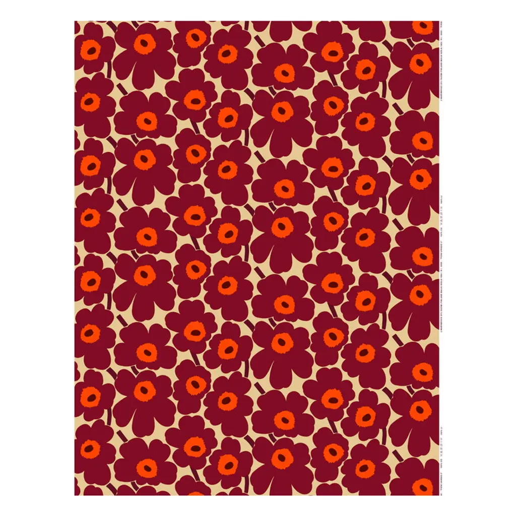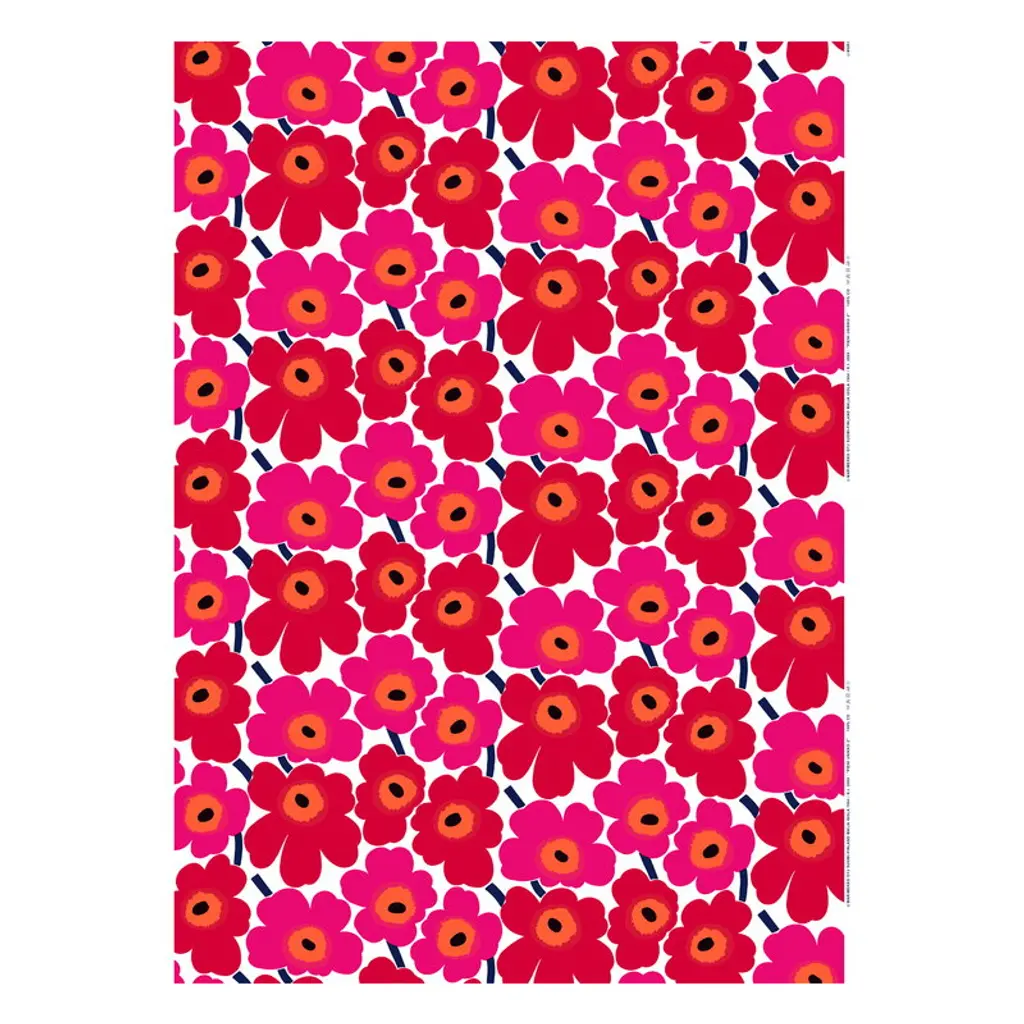 Marimekko’s Mini Unikko fabric features the iconic floral pattern by Maija Isola in classic shades of white and red. The fabric is made of 100% cotton and has been printed in Helsinki, Finland. The cotton fabric is ideal for making a custom tablecloth or curtains. The Unikko pattern came about in 1964 after Armi Ratia, the founder of Marimekko, had announced in public that no floral fabrics are designed at Marimekko. Maija Isola did not accept rules or restrictions and designed in protest a complete collection of bold floral patterns: Unikko, a Finnish word that means poppy. Today, Unikko is one of Marimekko's best-known patterns and recognized around the world.