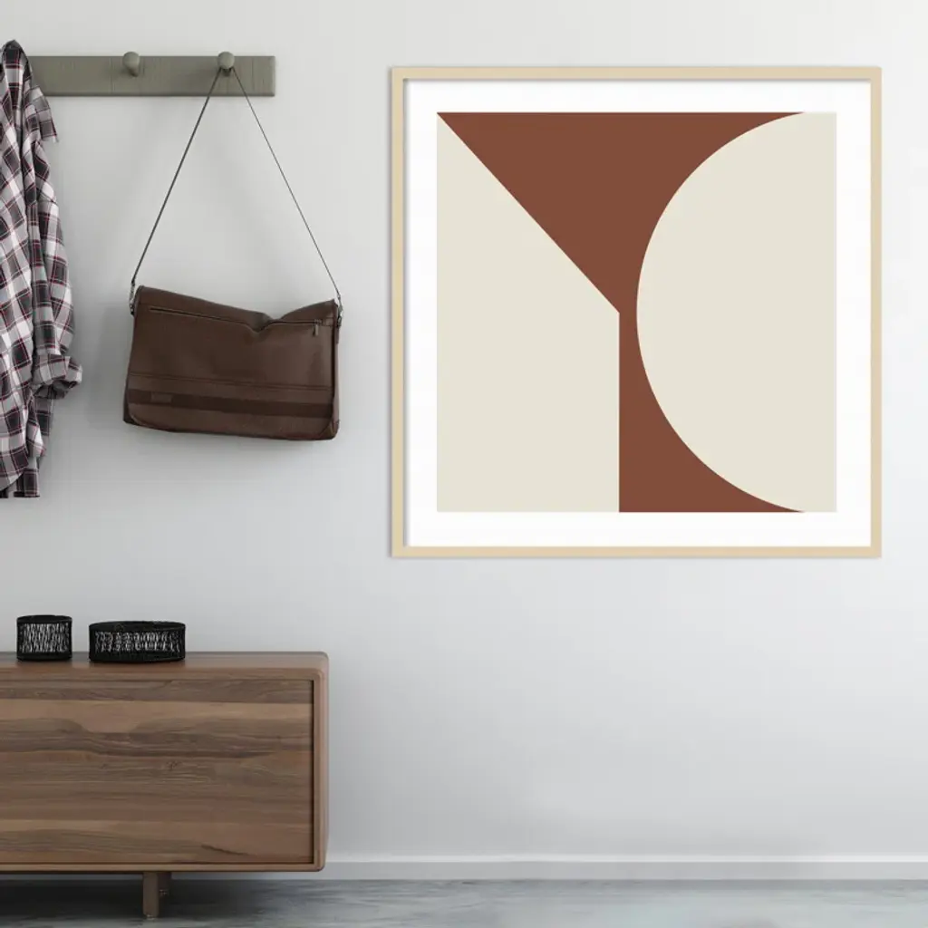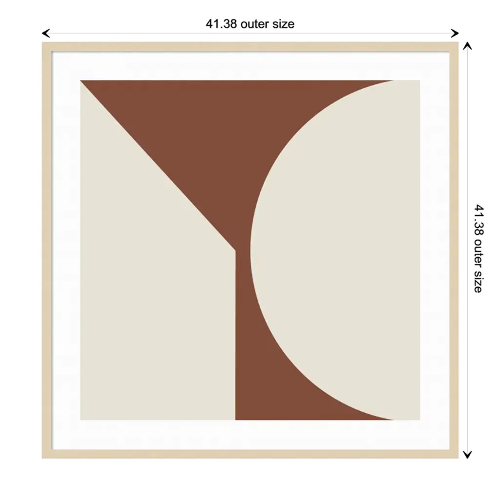 Two precise shapes float over a background the color of chocolate milk. The contrast between the round edge and the corner is mitigated by the balance of a matching soft creamy color reminiscent of marshmallows. Framing is 100% solid wood, hand cut, assembled in the USA. Art prints are giclee printed using fade-resistant inks and mounted to a rigid backer board to prevent rippling over time. A shatterproof sheet of gallery-quality acrylic protects the imagery by resisting UV rays and light damage. Durable wire, mounting hook and nail are included for easy hanging.