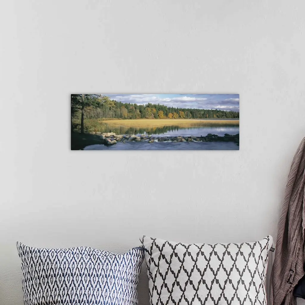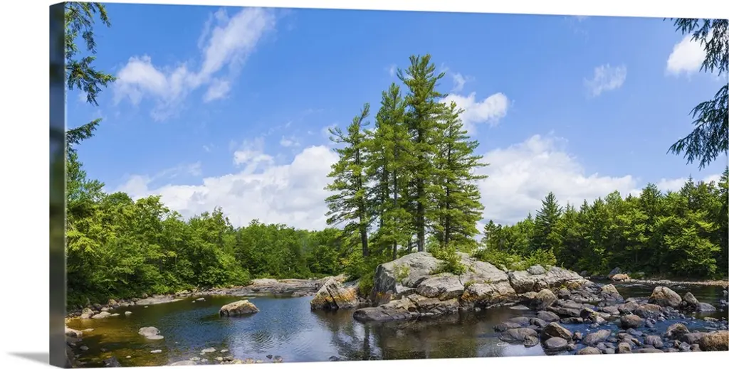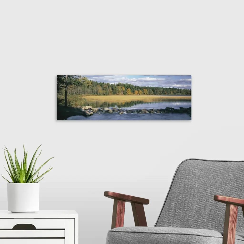 Panoramic photograph of rocky river with forest in the distance under a cloudy sky.