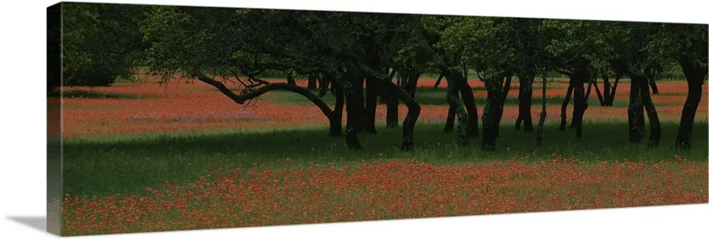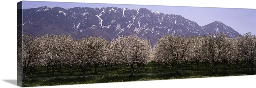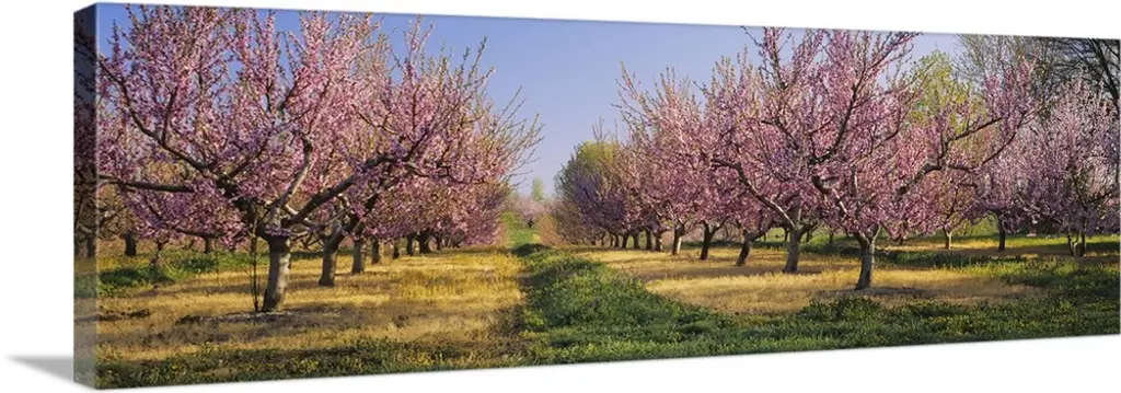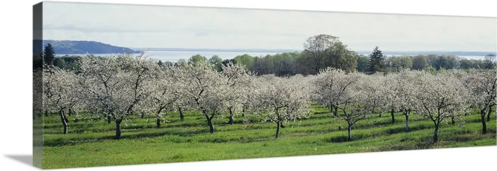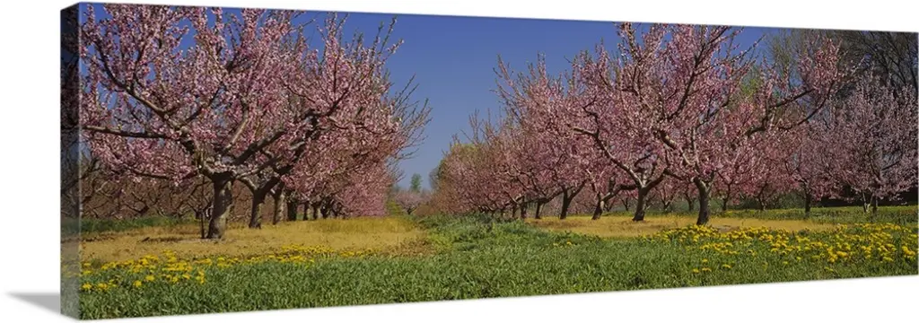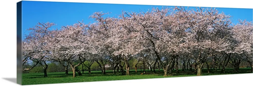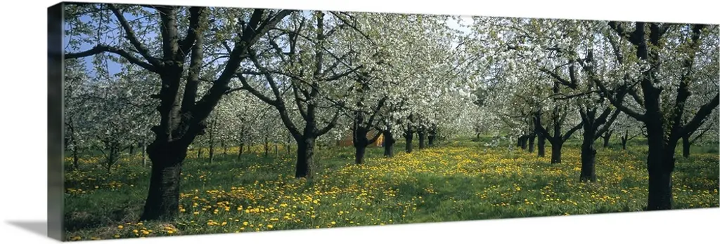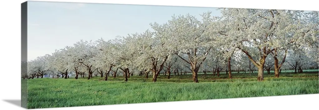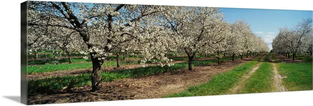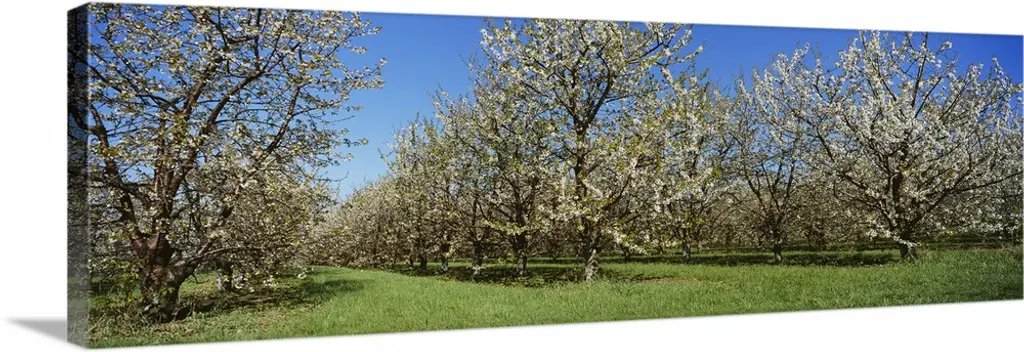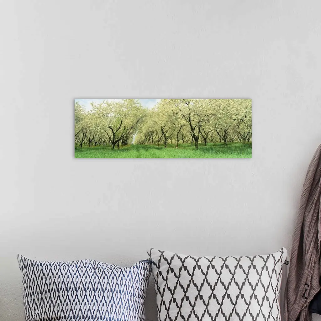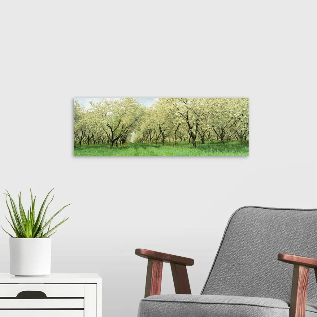 Wide angle photograph on a large wall hanging of many rows of blooming cherry trees in a grassy orchard, in Minnesota.