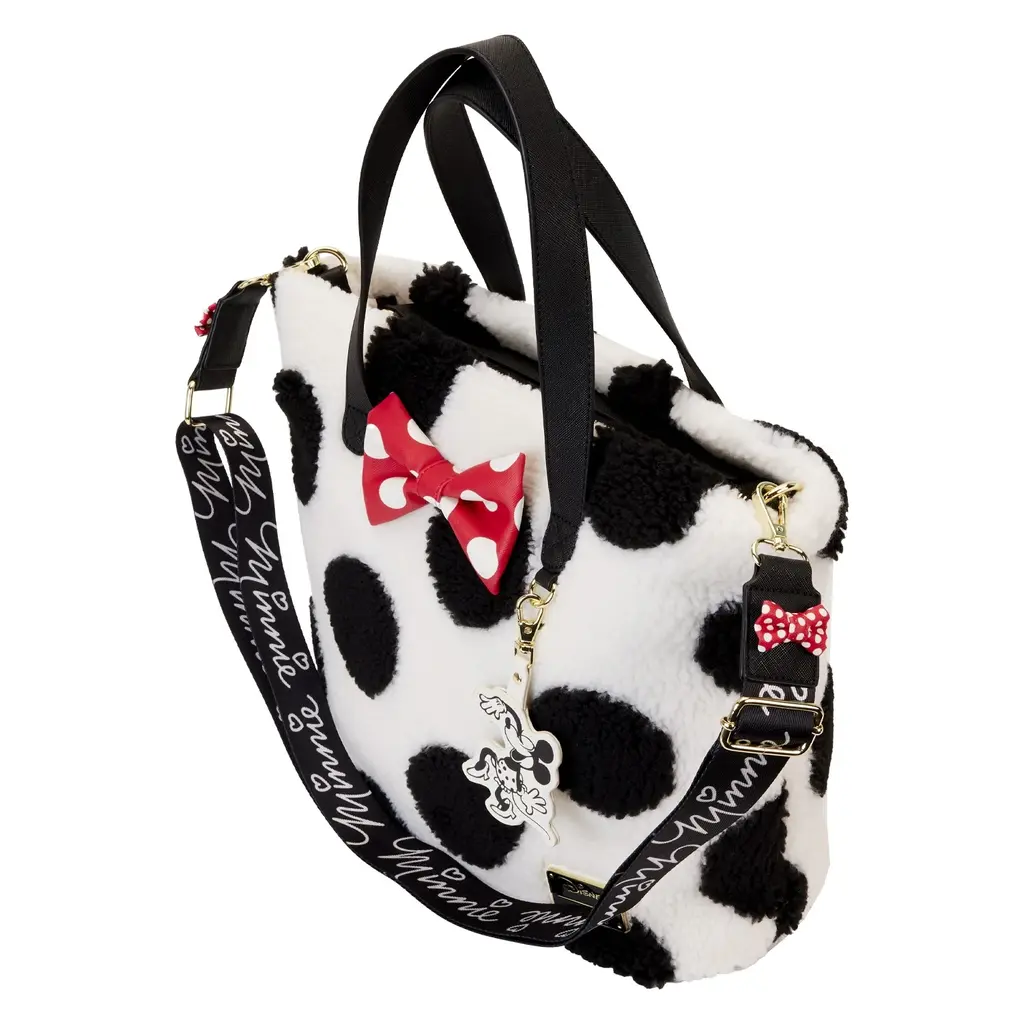 Our dotted line has a signature touch! This Loungefly Minnie Mouse Rocks the Dots Sherpa Tote Bag is a fresh and fabulous take on a classic style. This bag features soft white sherpa material with black dots on the front and back. The characteristic 3D red bow, with white polka dots, sits just at the top, below the black handle. Adjustable straps come with this bag as well, and they feature a bow on the shoulder and a motif of Minnie’s signature in white. A vegan leather charm of a vintage print of Minnie Mouse dancing, in black and white, tops off the look. This roomy tote bag zips at the top to secure all your items. There’s plenty of room to pack just what you need for a day’s journey, or for arriving on the dot to a fun event in style.