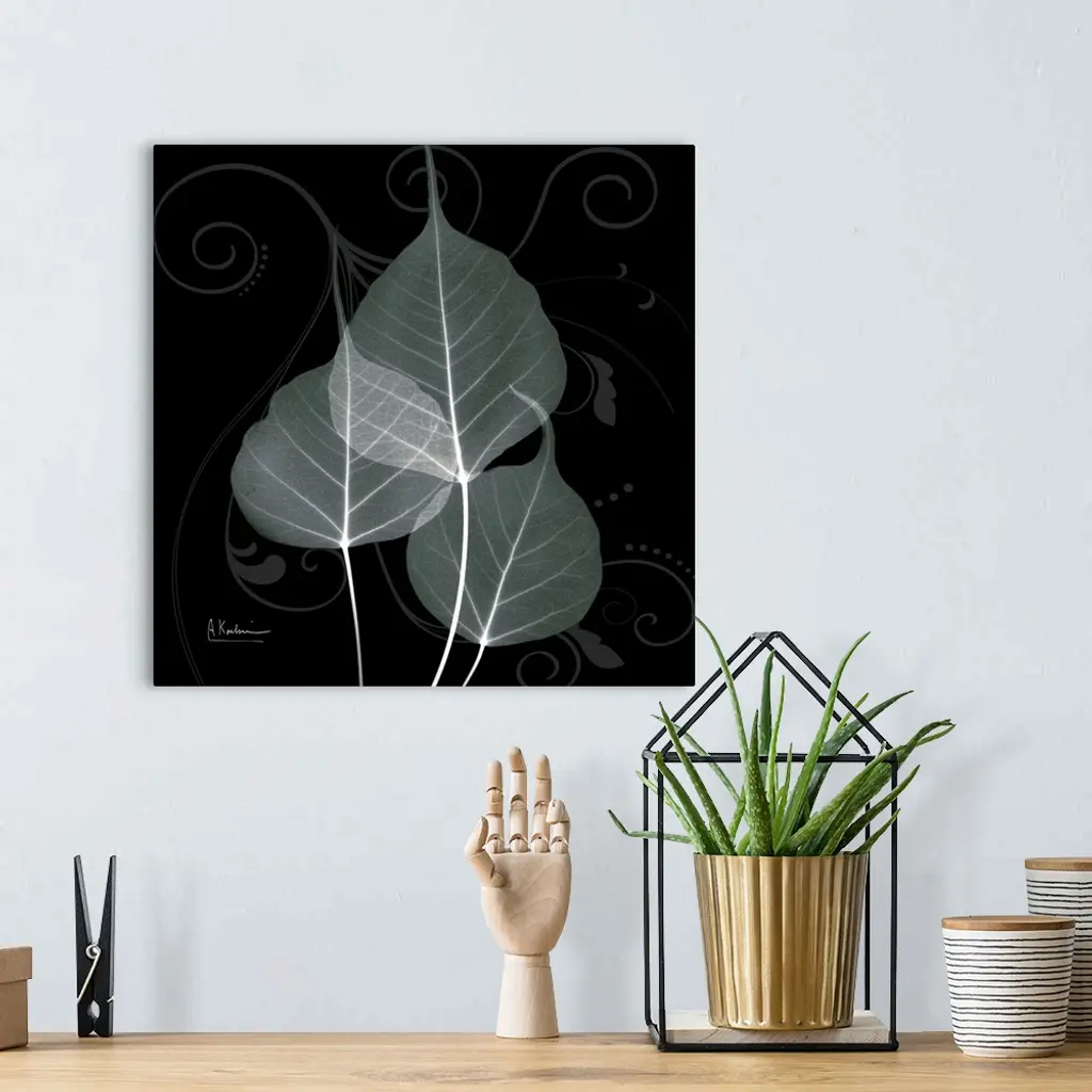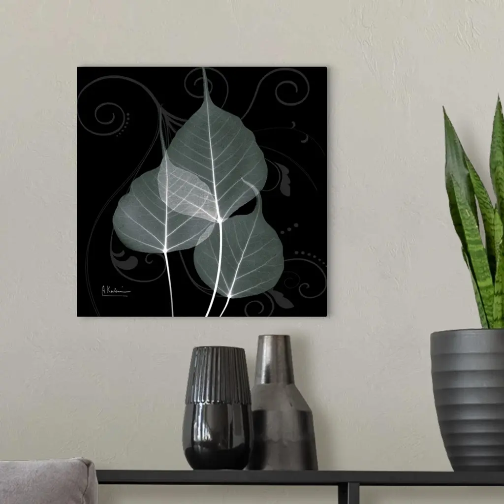 An x-ray of three leaves mint bo tree leaves on a black and grey designed background.