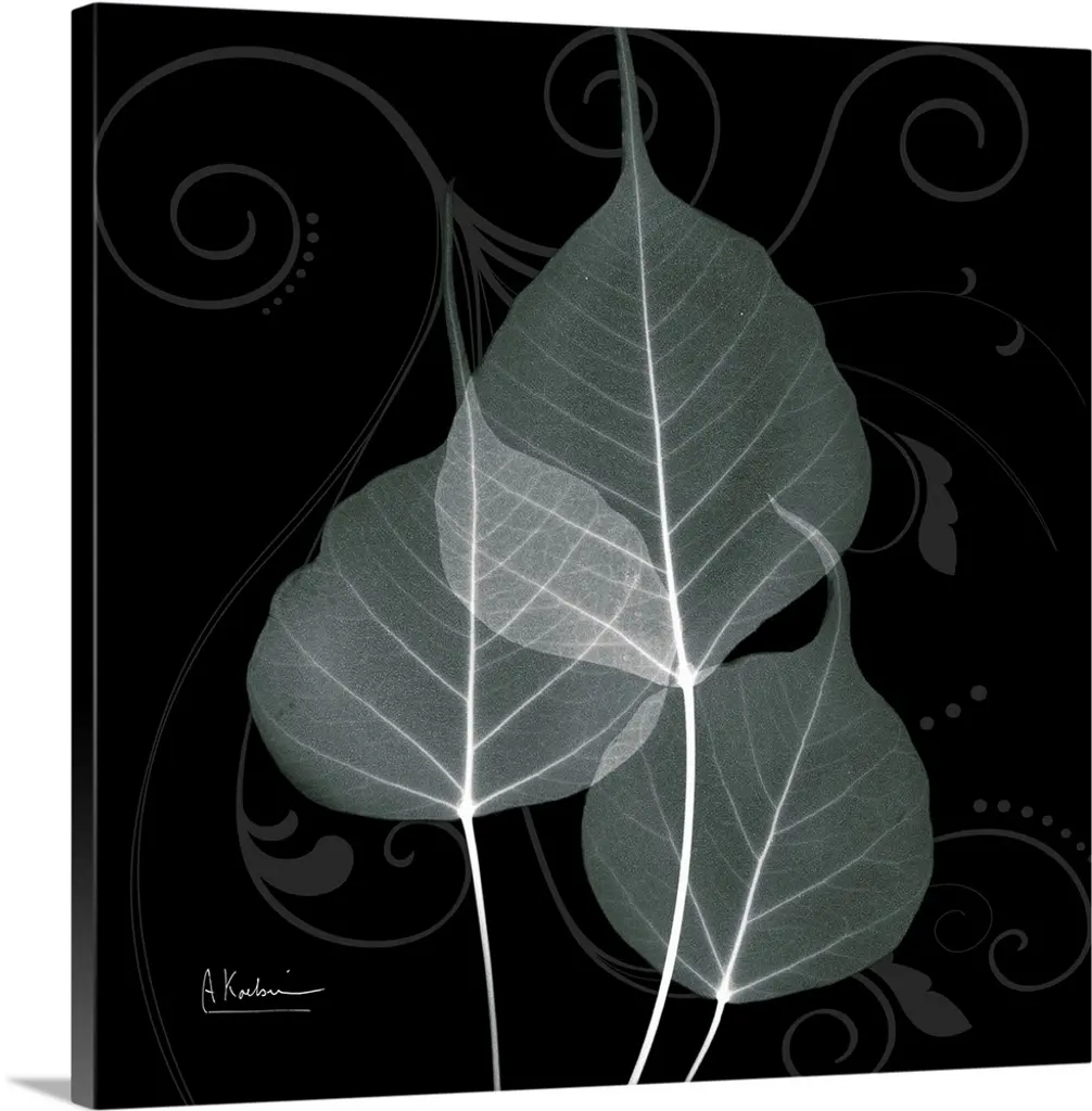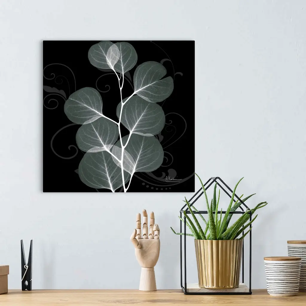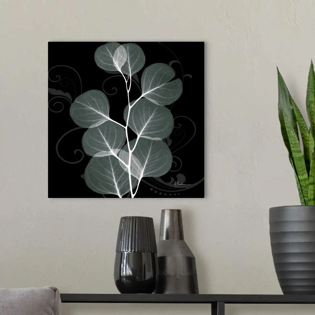 An x-ray of mint eucalyptus leaves on a black and grey designed background.