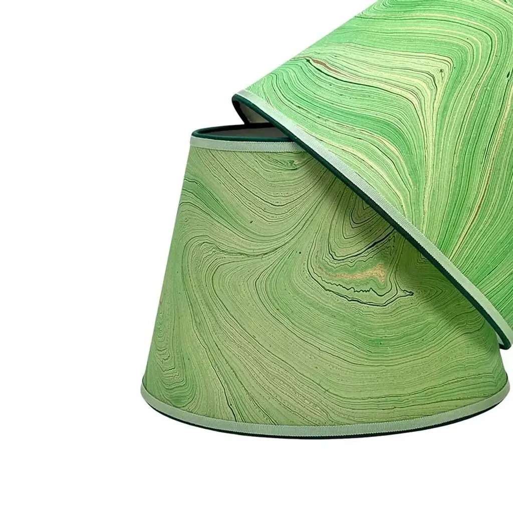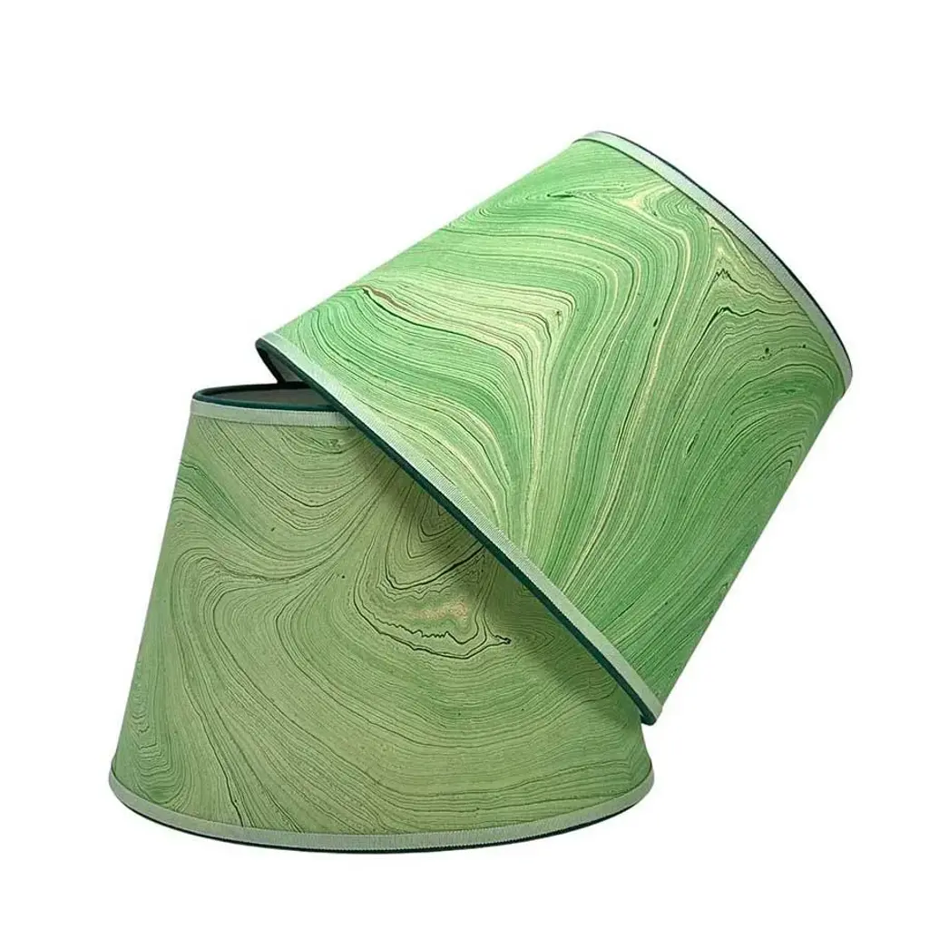 Marbled paper in a wonderful mint green and gold pattern; trimmed in two colors of grosgrain. Available in 3 sizes: 8” x 12” x 8.75” 9” x 16” x 11” 12” x 18” x 12” Pictured in 12″ x 18″ 12″ Please note that larged sizes use multiple sheets of paper. There are extra seems in the back of the shades. All shades are made to order, by hand and are not returnable Please be sure to double check sizing before ordering. Shades sold individually.