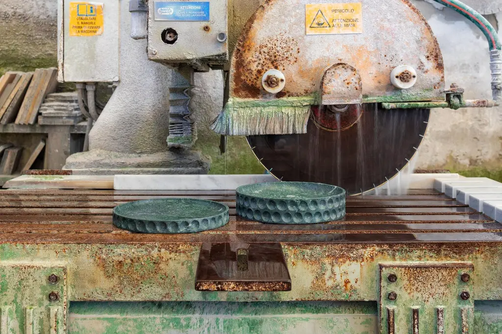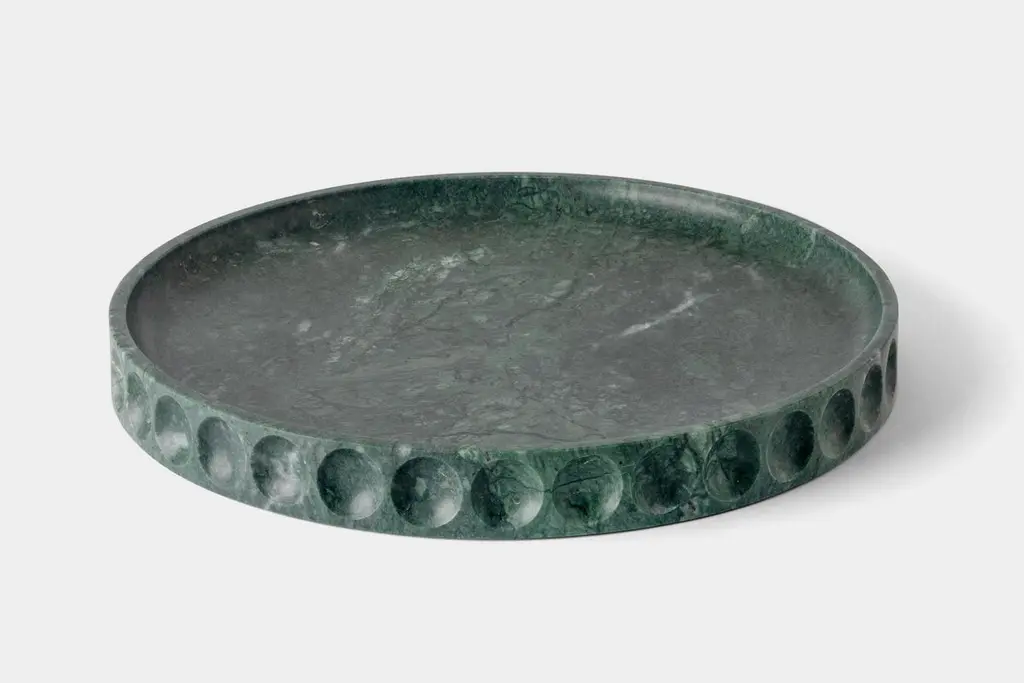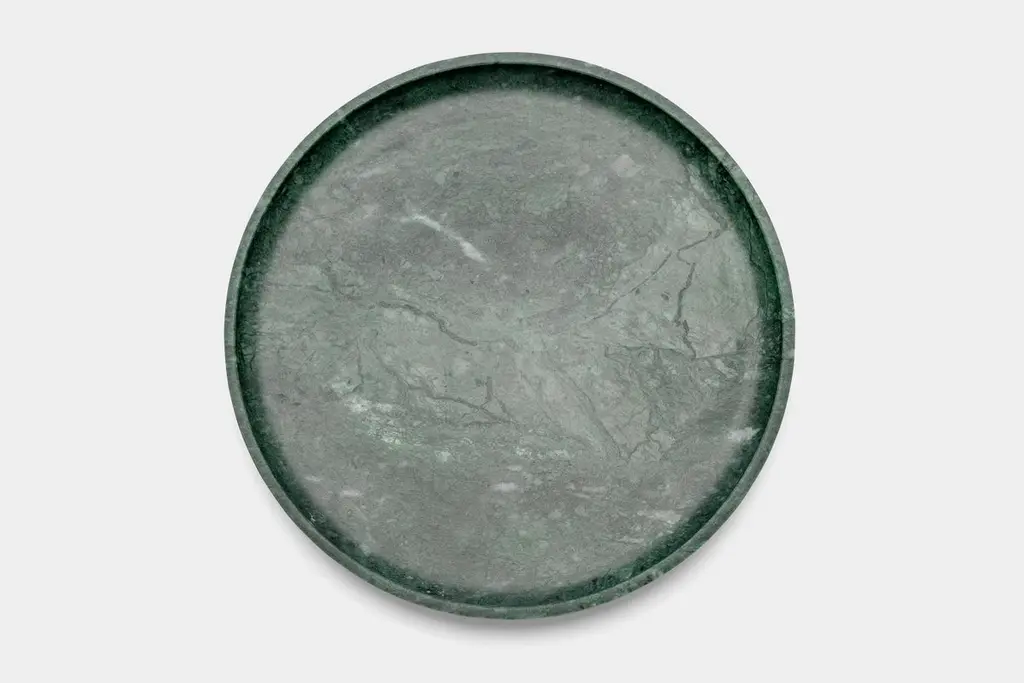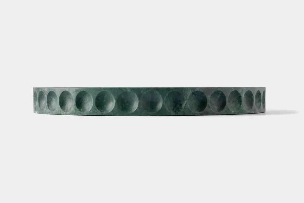 Mirage Contenitore basso by Studio IntervalloDimensions: D 30 x H 3.2 cmMaterials: green Guatemala marble.Available in other stones.The Mirage collection comes from the monolithic materiality of stone. Shape and function coincide, creating an element without frills, which originates by subtracting materials.Full and empty spaces alternate each other and create dissolving shades of light thanks to the juxtaposition of decorations. It’s a container for objects full of its surroundings reflected on its surface.studiointervallo creates furniture and interior design. All its creations are painstakingly researched with a thorough use of full and empty spaces.For this reason, it could only exist between the fullness of the city of Milan and the emptiness of the countryside around it, in a place which is also ideal for meditating, as well as a stimulating anteroom to creative thinking.This unusual location’s aura successfully blends with the projects of studiointervallo, thus enriching them with nature in a final true epiphany which is the very soul of each single creation.Founded by Andrea Ghisoni, the studio pursues the perfect blending of essential lines with the brightness of the shapes and and the nobility of true craftsmanship; the overall goals would be to just make people happy.