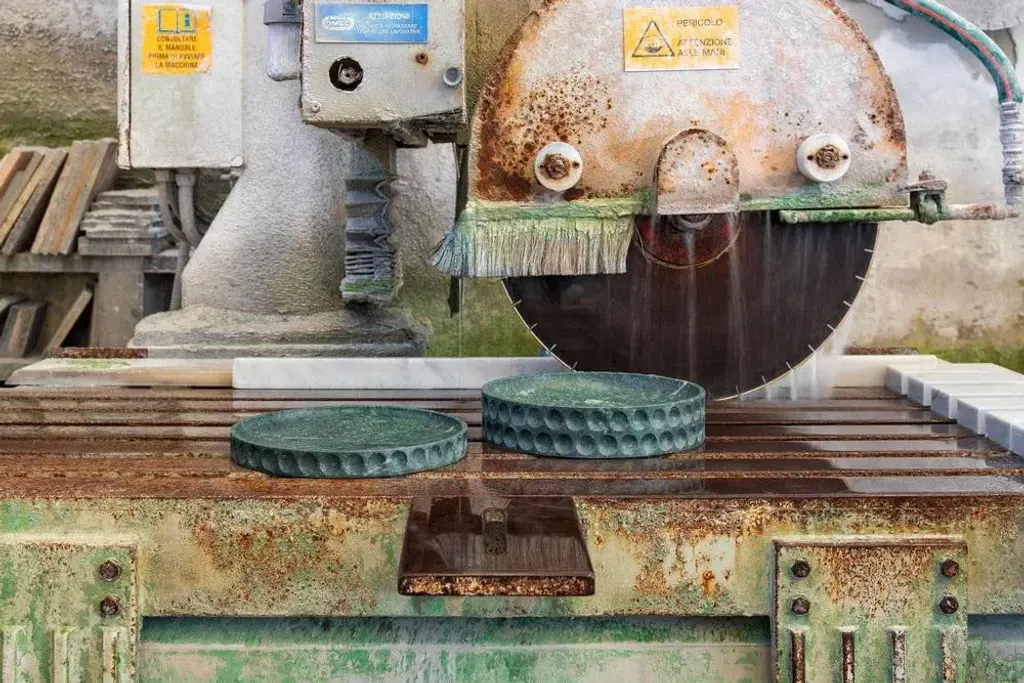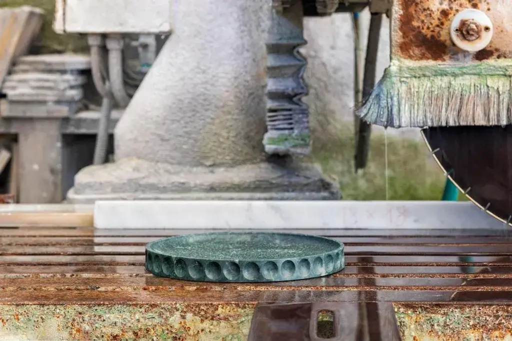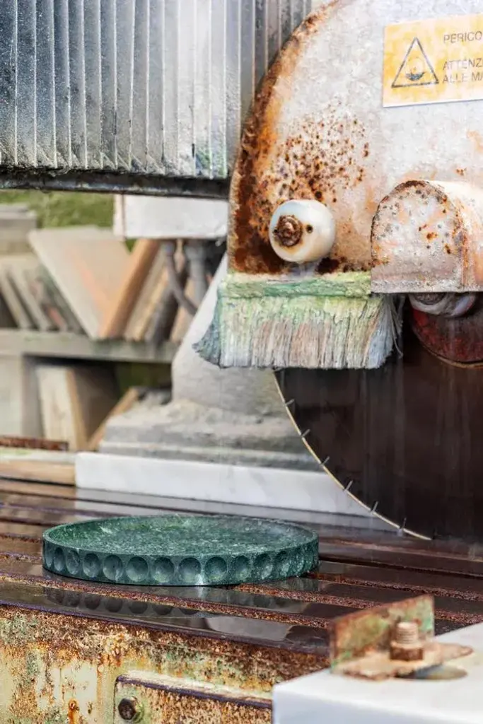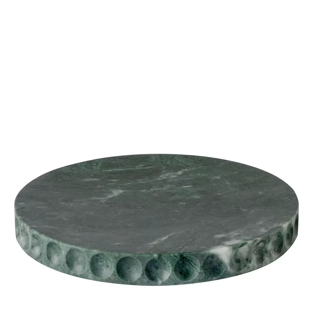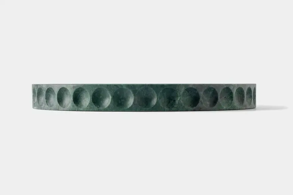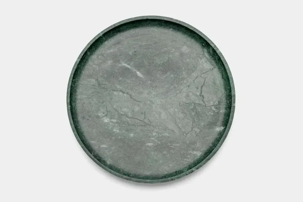 Mirage Contenitore basso by Studio Intervallo Dimensions: D 30 x H 3.2 cm Materials: green Guatemala marble. Available in other stones. The Mirage collection comes from the monolithic materiality of stone. Shape and function coincide, creating an element without frills, which originates by subtracting materials. Full and empty spaces alternate each other and create dissolving shades of light thanks to the juxtaposition of decorations. It’s a container for objects full of its surroundings reflected on its surface. studiointervallo creates furniture and interior design. All its creations are painstakingly researched with a thorough use of full and empty spaces. For this reason, it could only exist between the fullness of the city of Milan and the emptiness of the countryside around it, in a place which is also ideal for meditating, as well as a stimulating anteroom to creative thinking. This unusual location’s aura successfully blends with the projects of studiointervallo, thus enriching them with nature in a final true epiphany which is the very soul of each single creation. Founded by Andrea Ghisoni, the studio pursues the perfect blending of essential lines with the brightness of the shapes and and the nobility of true craftsmanship; the overall goals would be to just make people happy.